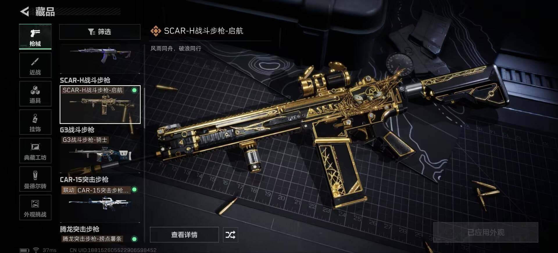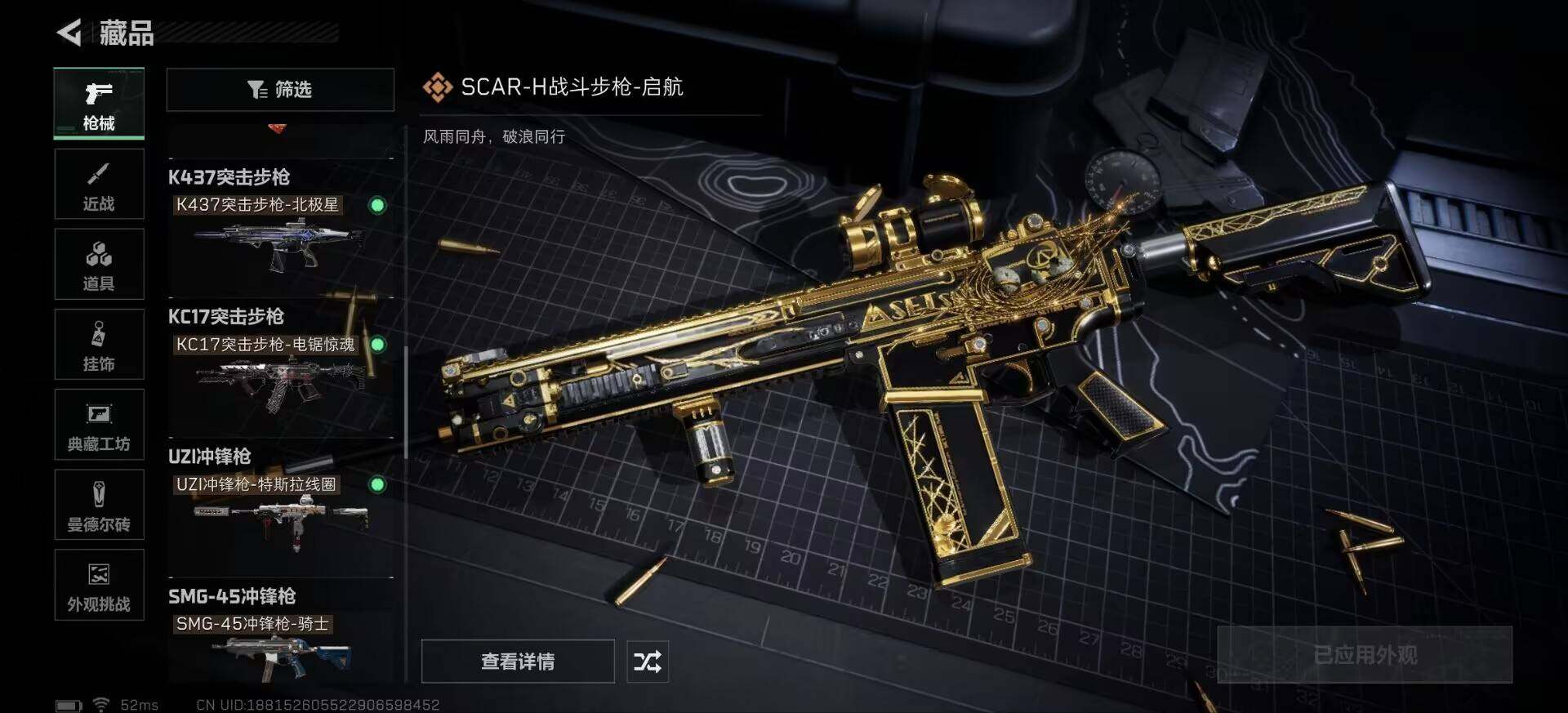 【传说级普通外观】:M4A1突击步枪-蚀金玫瑰,M4A1突击步枪-阿米娅,ASh-12战斗步枪-鹅鸭杀,AK-12突击步枪-夜鹰,AK-12突击步枪-特斯拉线圈,SCAR-H战斗步枪-启航,CAR-15突击步枪-阿米娅,腾龙突击步枪-捞点薯条,K437突击步枪-北极星,KC17突击步枪-电锯惊魂,UZI冲锋枪-特斯拉线圈,SMG-45冲锋枪-骑士,SR-3M紧凑突击步枪-特斯拉线圈,勇士冲锋枪-能天使-午夜邮差,QCQ171冲锋枪-北极星,QCQ171冲锋枪-鹅鸭杀,725双管霰弹枪-送葬人-无题密令,M250通用机枪-骑士之心,QJB201轻机枪-鹅鸭杀,R93狙击步枪-维什戴尔,AWM狙击步枪-捞点薯条,93R-捞点薯条,复合弓-黑·天际线