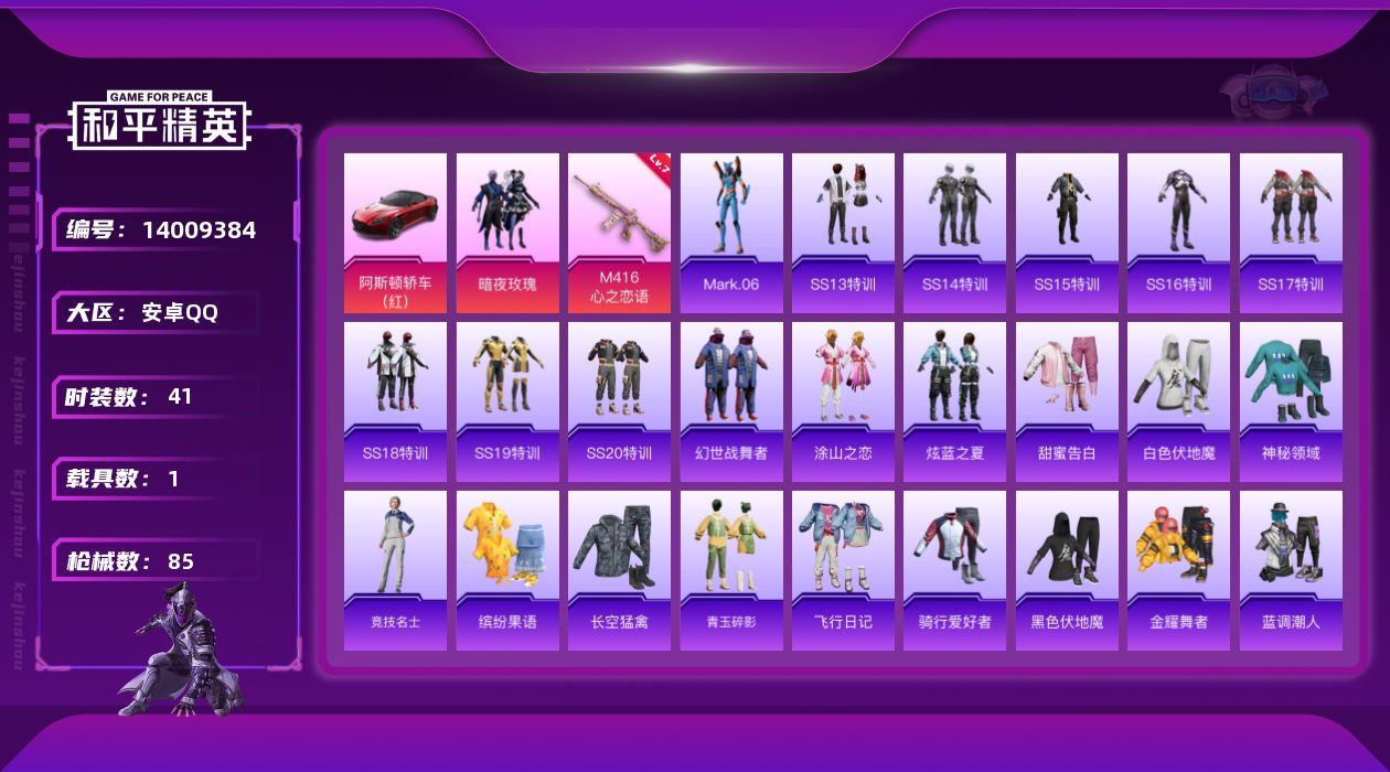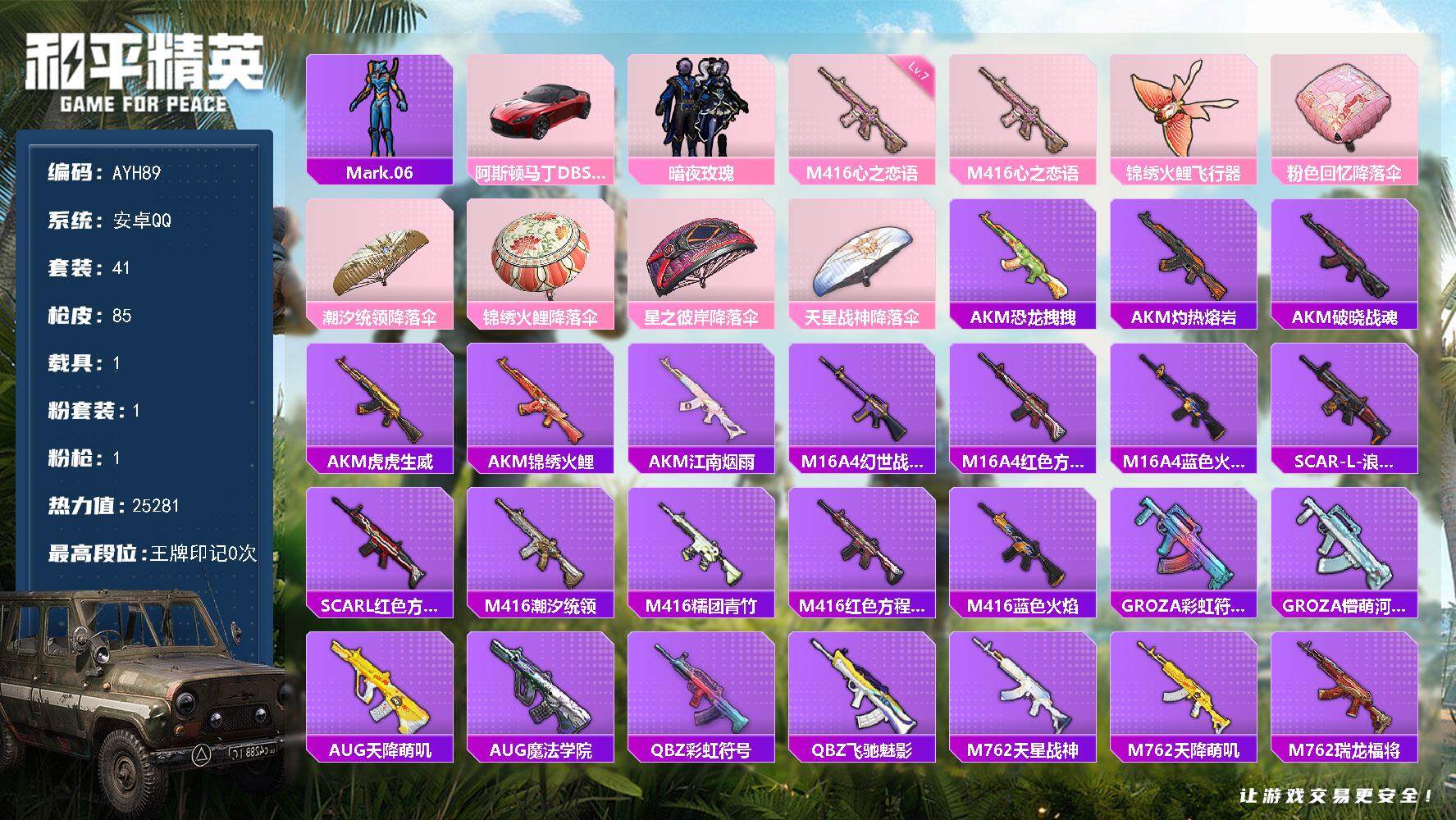 [14009384]可二次,【店主推荐捡漏号!可直接换绑】安卓 手Q-1粉装-1特效枪-1载具-1粉色飞行器-25281热力值-1王牌印记-41套装-85枪皮【热门品类】:角色-Mark.06【粉色载具】:阿斯顿马丁DBS(红)【粉色套装】:粉装-暗夜玫瑰【粉色枪皮等级】:M416-心之恋语(七级)【粉色枪皮】:M416-心之恋语【粉色飞行器】:锦绣火鲤飞行器