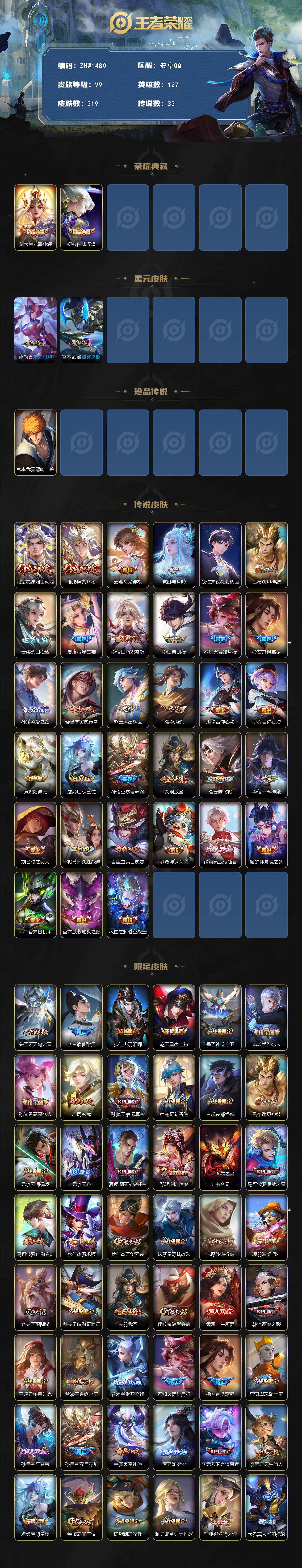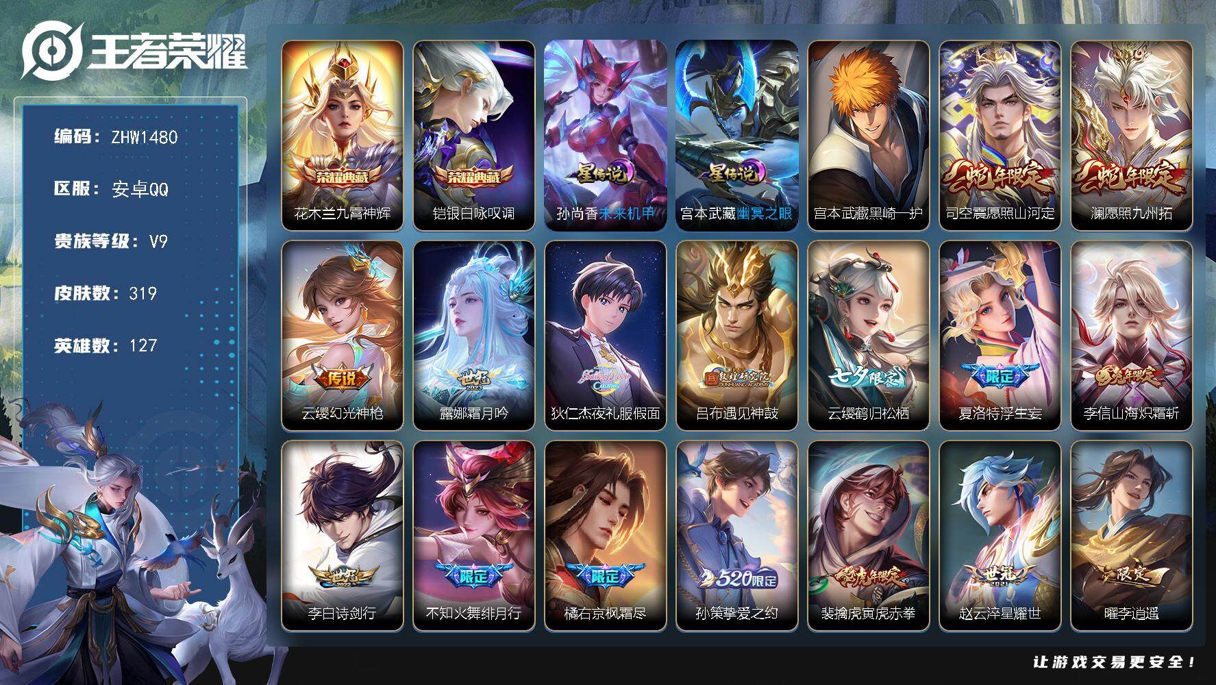 [14009562]【店主推荐捡漏号!可直接换绑】安卓Q-V9-最强王者段位-127英雄-319皮肤-2典藏-1珍品传说-33传说-106史诗 【英雄全皮】:橘右京全皮,狂铁全皮,李信全皮,蒙恬全皮,夏洛特全皮,司空震全皮,赵怀真全皮,戈娅全皮,影全皮 【荣耀典藏】:花木兰九霄神辉,铠银白咏叹调 【珍品传说】:宫本武藏黑崎一护 【传说皮肤】:司空震愿照山河定,澜愿照九州拓,云缨幻光神枪,露娜霜月吟,狄仁杰夜礼服假面,吕布遇见神鼓,云缨鹤归松栖,夏洛特浮生妄,李信山海炽霜斩,李白诗剑行,不知火舞绯月行,橘右京枫霜尽,孙策挚爱之约,裴擒虎寅虎赤拳,赵云淬星耀世,曜李逍遥 ,周瑜音你心动,小乔音你心动,镜炽阳神光,虞姬启明星使,孙悟空零号赤焰,关羽武圣,曜云鹰飞将,李信一念神魔,刘备时之恋人,干将莫邪久胜战神,百里玄策白虎志,梦奇胖达荣荣,诸葛亮武陵仙君,貂蝉仲夏夜之梦,孙尚香末日机甲,宫本武藏地狱之眼,狄仁杰超时空战士 【限定皮肤】:姜子牙天穹之誓,李白谪仙醉月,狄仁杰阴阳师,赵云皇家上将,墨子神迹守卫,嬴政优雅恋人,孙尚香蔷薇恋人,庄周玄嵩,孙膑天狼运算者,扁鹊奇幻香踪,白起夜都怪侠,吕布遇见神鼓,元歌云间偶戏,元歌无心,夏侯惇匿光决锋者,甄姬游园惊梦,典韦穷奇,马可波罗逐梦之星,马可波罗山海玄木吟,狄仁杰魔术师,狄仁杰万华元夜,达摩星际陆战队,达摩沙漠行僧,项羽海滩派对,老夫子醍醐杖,老夫子航海奇遇记,关羽武圣,程咬金演武夺筹,露娜一生所爱,韩信逐梦之影,王昭君午后时光,兰陵王金庭之子,花木兰默契交锋,不知火舞绯月行,橘右京枫霜尽,亚瑟潮玩骑士王,孙悟空至尊宝,孙悟空零号赤焰,牛魔奔雷神使,后羿如梦令,李元芳匿光侦查者,李元芳云中旅人,虞姬启明星使,钟馗驱傩正仪,杨戬潮玩骑兵,雅典娜单词大作战,雅典娜黎明之约,太乙真人华丽摇滚,东皇太一逐梦之光,鬼谷子原初探秘者,鬼谷子五谷丰年,诸葛亮武陵仙君,百里玄策白虎志,百里守约朱雀志,梦奇顽趣,公孙离蜜橘之夏,公孙离玉兔公主,沈梦溪大漠名商,沈梦溪匿光破解者,明世隐疑决卦,明世隐吟游魔法,裴擒虎李小龙,裴擒虎寅虎赤拳,裴擒虎擒涛扼浪,狂铁御狮,狂铁电玩高手,米莱狄胡桃异想国,云中君纤云弄巧,李信山海炽霜斩,伽罗天狼溯光者,孙策挚爱之约,上官婉儿天狼绘梦者,嫦娥如梦令,嫦娥拒霜思,嫦娥暖冬兔眠,曜李逍遥 ,西施玲珑珍味,蒙犽狂想玩偶喵,鲁班大师
