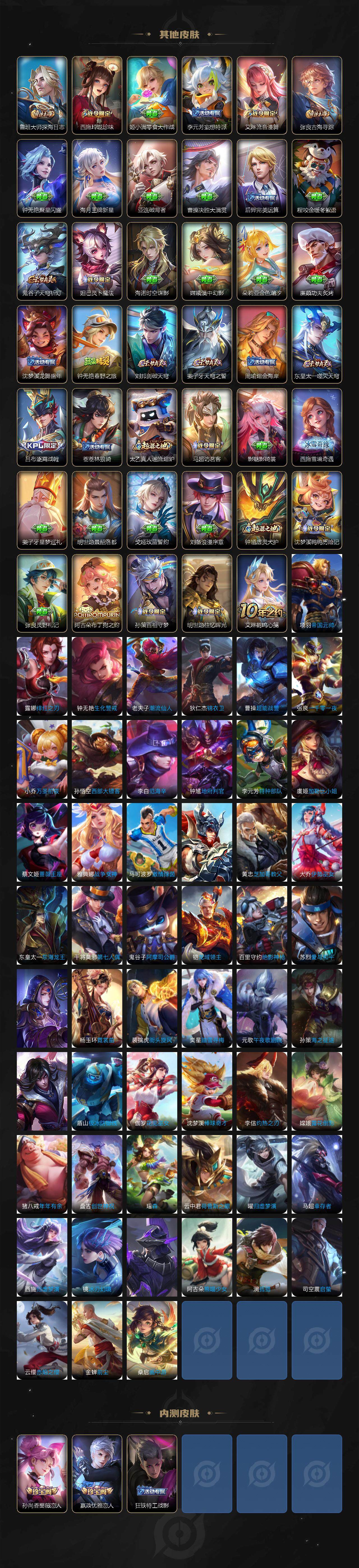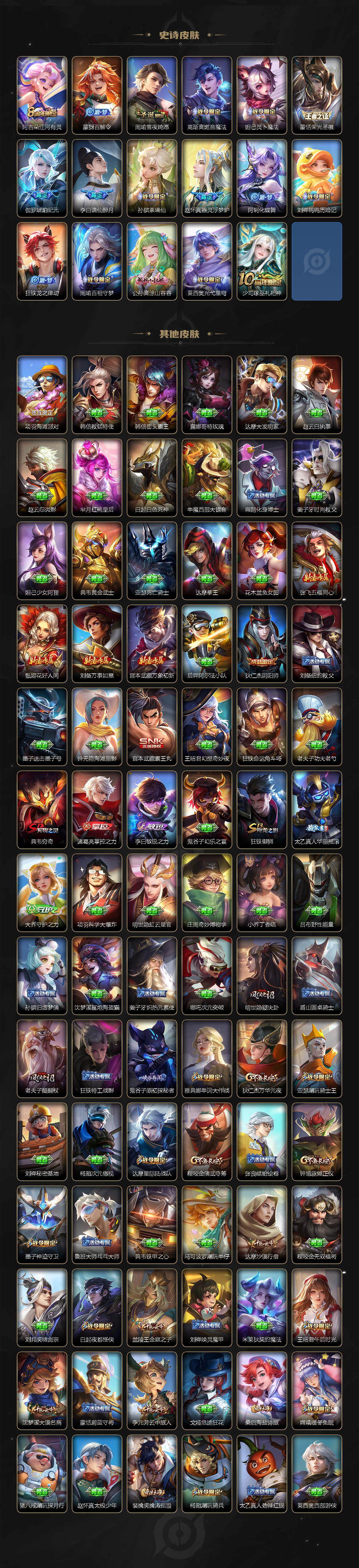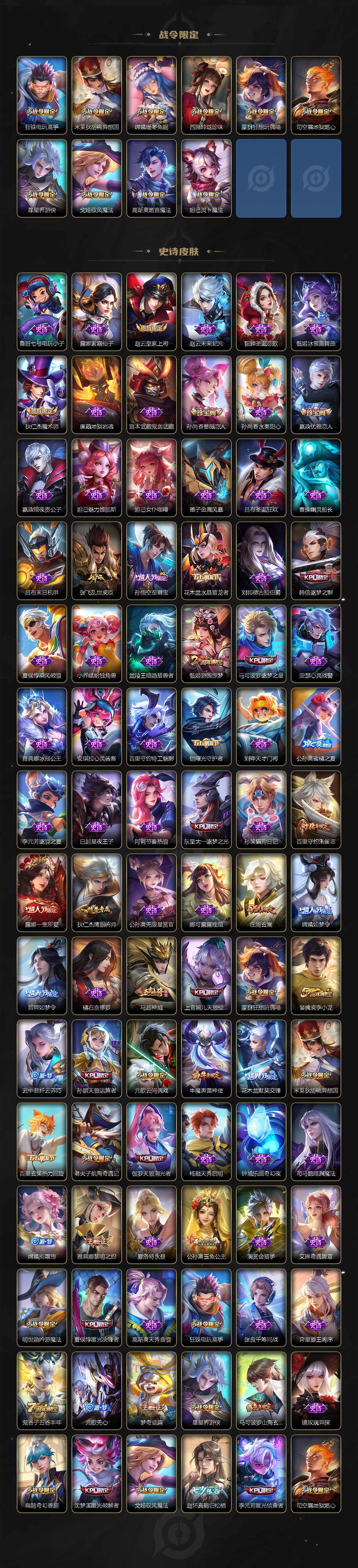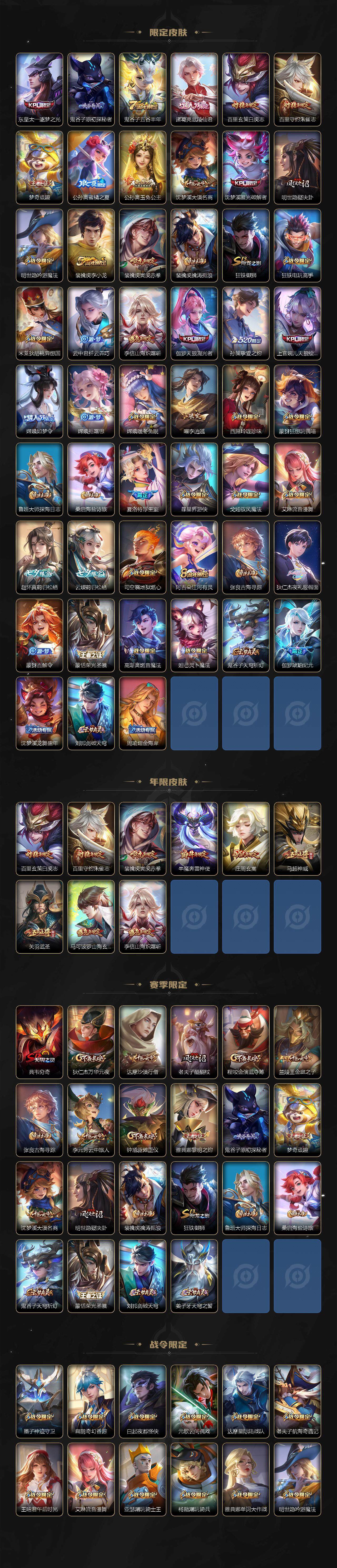 【限定皮肤】:姜子牙天穹之誓,李白谪仙醉月,狄仁杰阴阳师,赵云皇家上将,墨子神迹守卫,嬴政优雅恋人,孙尚香蔷薇恋人,庄周玄嵩,孙膑天狼运算者,扁鹊奇幻香踪,白起夜都怪侠,吕布遇见神鼓,元歌云间偶戏,元歌无心,夏侯惇匿光决锋者,甄姬游园惊梦,典韦穷奇,马可波罗逐梦之星,马可波罗山海玄木吟,狄仁杰魔术师,狄仁杰万华元夜,达摩星际陆战队,达摩沙漠行僧,项羽海滩派对,老夫子醍醐杖,老夫子航海奇遇记,关羽武圣,程咬金演武夺筹,露娜一生所爱,韩信逐梦之影,王昭君午后时光,兰陵王金庭之子,花木兰默契交锋,不知火舞绯月行,橘右京枫霜尽,亚瑟潮玩骑士王,孙悟空至尊宝,孙悟空零号赤焰,牛魔奔雷神使,后羿如梦令,李元芳匿光侦查者,李元芳云中旅人,虞姬启明星使,钟馗驱傩正仪,杨戬潮玩骑兵,雅典娜单词大作战,雅典娜黎明之约,太乙真人华丽摇滚,东皇太一逐梦之光,鬼谷子原初探秘者,鬼谷子五谷丰年,诸葛亮武陵仙君,百里玄策白虎志,百里守约朱雀志,梦奇顽趣,公孙离蜜橘之夏,公孙离玉兔公主,沈梦溪大漠名商,沈梦溪匿光破解者,明世隐疑决卦,明世隐吟游魔法,裴擒虎李小龙,裴擒虎寅虎赤拳,裴擒虎擒涛扼浪,狂铁御狮,狂铁电玩高手,米莱狄胡桃异想国,云中君纤云弄巧,李信山海炽霜斩,伽罗天狼溯光者,孙策挚爱之约,上官婉儿天狼绘梦者,嫦娥如梦令,嫦娥拒霜思,嫦娥暖冬兔眠,曜李逍遥 ,西施玲珑珍味,蒙犽狂想玩偶喵,鲁班大师