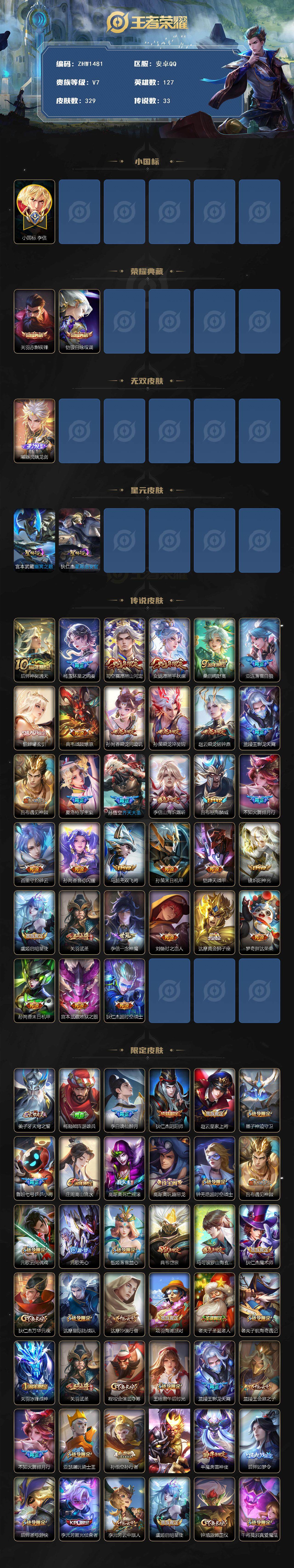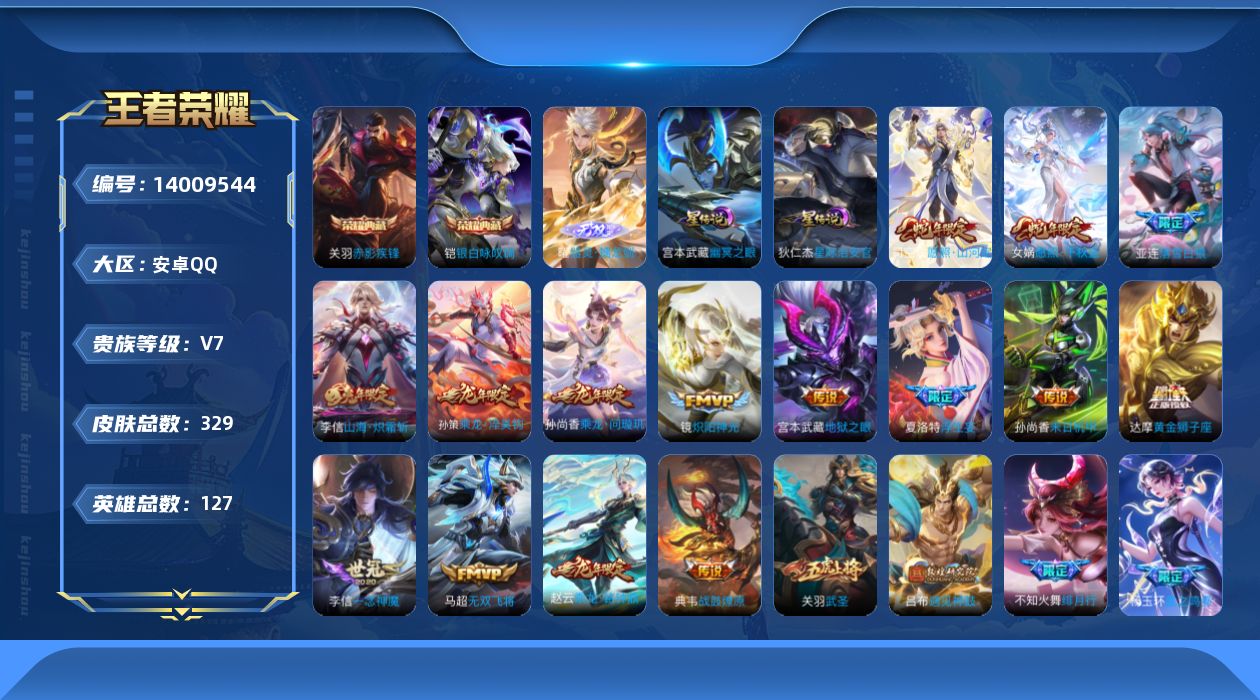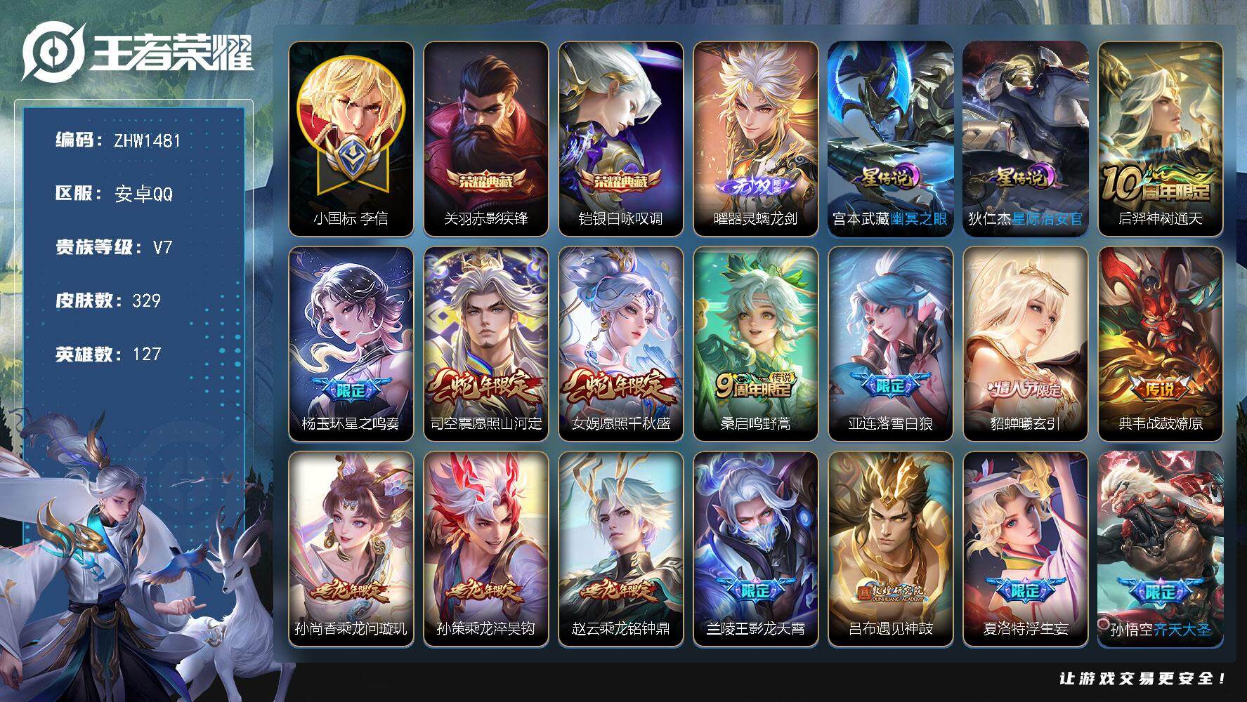 [14009544]可二次【店主推荐捡漏号!可直接换绑】安卓Q-V7-最强王者段位-127英雄-329皮肤-2典藏-1无双-0珍品传说-33传说-94史诗
