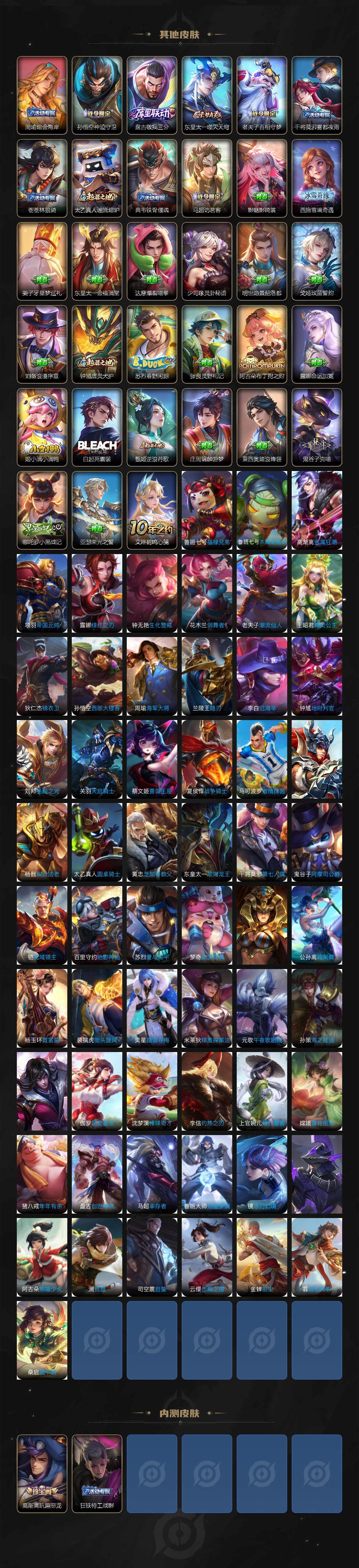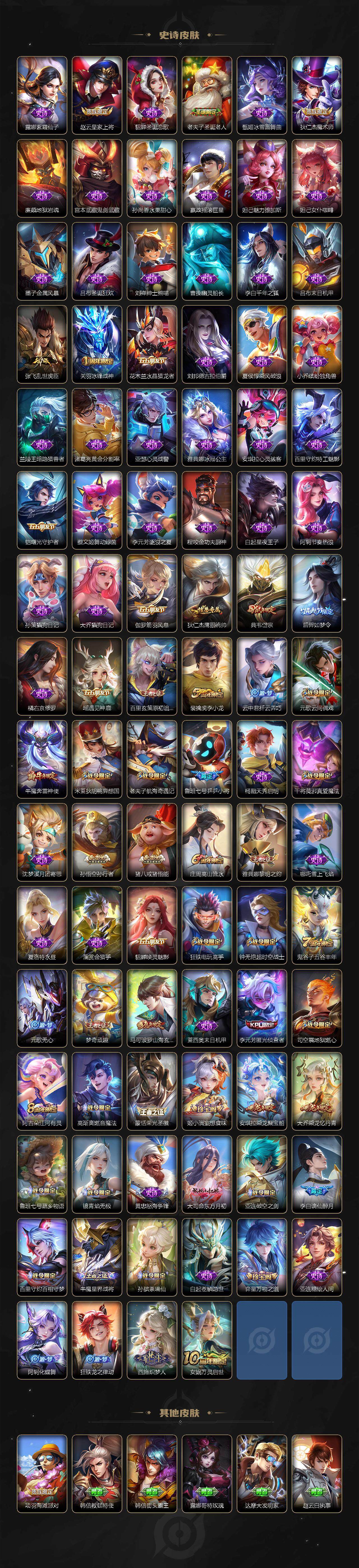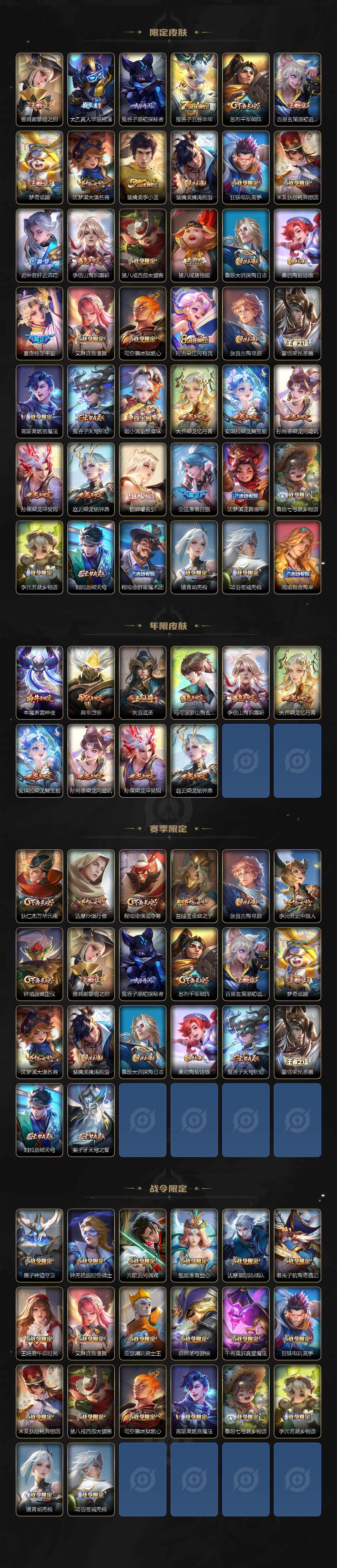 【限定皮肤】:姜子牙天穹之誓,杨戬破阵退雄兵,李白谪仙醉月,狄仁杰阴阳师,赵云皇家上将,墨子神迹守卫,鲁班七号乒乒小将,庄周高山流水,高渐离死亡摇滚,高渐离玩趣恶龙,钟无艳超时空战士,吕布遇见神鼓,元歌云间偶戏,元歌无心,甄姬落雪兰心,典韦岱宗,马可波罗山海玄木吟,狄仁杰魔术师,狄仁杰万华元夜,达摩星际陆战队,达摩沙漠行僧,项羽海滩派对,老夫子圣诞老人,老夫子航海奇遇记,关羽冰锋战神,关羽武圣,程咬金演武夺筹,王昭君午后时光,兰陵王影龙天霄,兰陵王金庭之子,不知火舞绯月行,亚瑟潮玩骑士王,孙悟空孙行者,孙悟空齐天大圣,牛魔奔雷神使,后羿如梦令,后羿圣弓游侠,李元芳匿光侦查者,李元芳云中旅人,虞姬启明星使,钟馗驱傩正仪,干将莫邪真爱魔法,雅典娜黎明之约,太乙真人华丽摇滚,鬼谷子原初探秘者,鬼谷子五谷丰年,苏烈千军破阵,百里玄策原初追逐者,梦奇顽趣,沈梦溪大漠名商,裴擒虎李小龙,裴擒虎擒涛扼浪,狂铁电玩高手,米莱狄胡桃异想国,云中君纤云弄巧,李信山海炽霜斩,猪八戒西部大镖客,猪八戒猪悟能,鲁班大师探海日志,桑启海盐诗旅,夏洛特浮生妄,艾琳流音漫舞,司空震地狱燃心,阿古朵江河有灵,张良古海寻踪,蒙恬荣光圣徽,高渐离燃音魔法,鬼谷子天穹祈灯,姬小满妄想食味,大乔乘龙忆丹青,安琪拉乘龙聚宝船,孙尚香乘龙问璇玑,孙策乘龙淬吴钩,赵云乘龙铭钟鼎,貂蝉曦玄引,亚连落雪白狼,沈梦