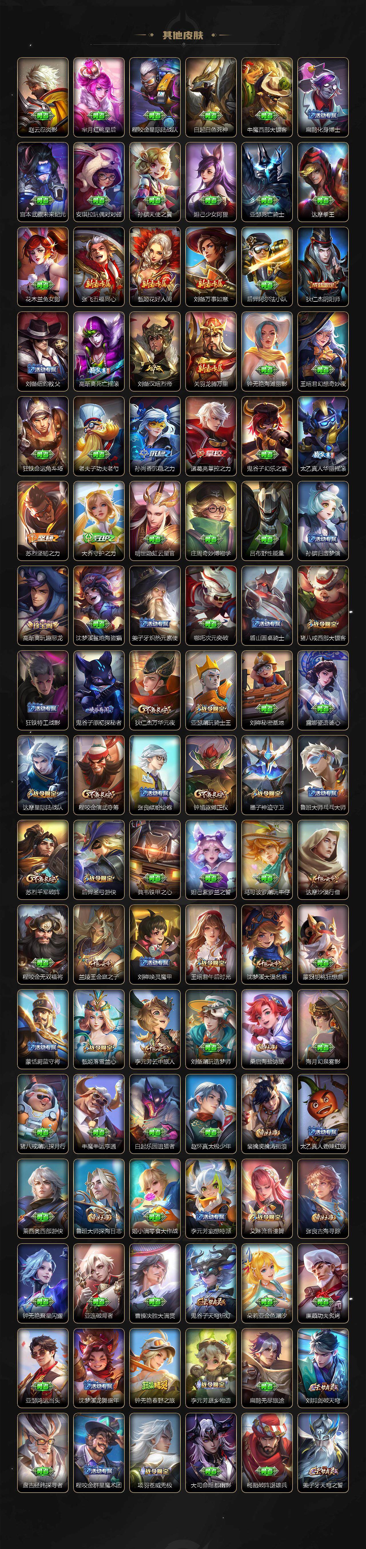 瑶遇见神鹿,伽罗箭羽风息,李元芳逐浪之夏,大乔猫狗日记,孙策猫狗日记,阿轲节奏热浪,露娜紫霞仙子,诸葛亮黄金分割率,雅典娜冰冠公主,吕布末日机甲,橘右京修罗,嬴政摇滚巨星,刘禅绅士熊喵,白起星夜王子,安琪拉心灵骇客,程咬金功夫厨神,刘邦德古拉伯爵,兰陵王暗隐猎兽者,曹操幽灵船长,宫本武藏鬼剑武藏,亚瑟心灵战警,杨戬天秀·启明,蔡文姬舞动绿茵,廉颇地狱岩魂,小乔缤纷独角兽,夏侯惇乘风破浪,花木兰水晶猎龙者,铠曙光守护者,墨子金属风暴,百里玄策原初追逐者,吕布圣诞狂欢,貂蝉圣诞恋歌,百里守约特工魅影,雅典娜黎明之约,李白千年之狐,哪吒雪上飞焰,夏洛特永昼,澜赏金猎手,貂蝉唤灵魅影,莱西奥末日机甲,李元芳匿光侦查者,高渐离燃音魔法,大乔乘龙·忆丹青,安琪拉乘龙·聚宝船,李白谪仙醉月,白起苍鳞隐世,亚连糖绘人间