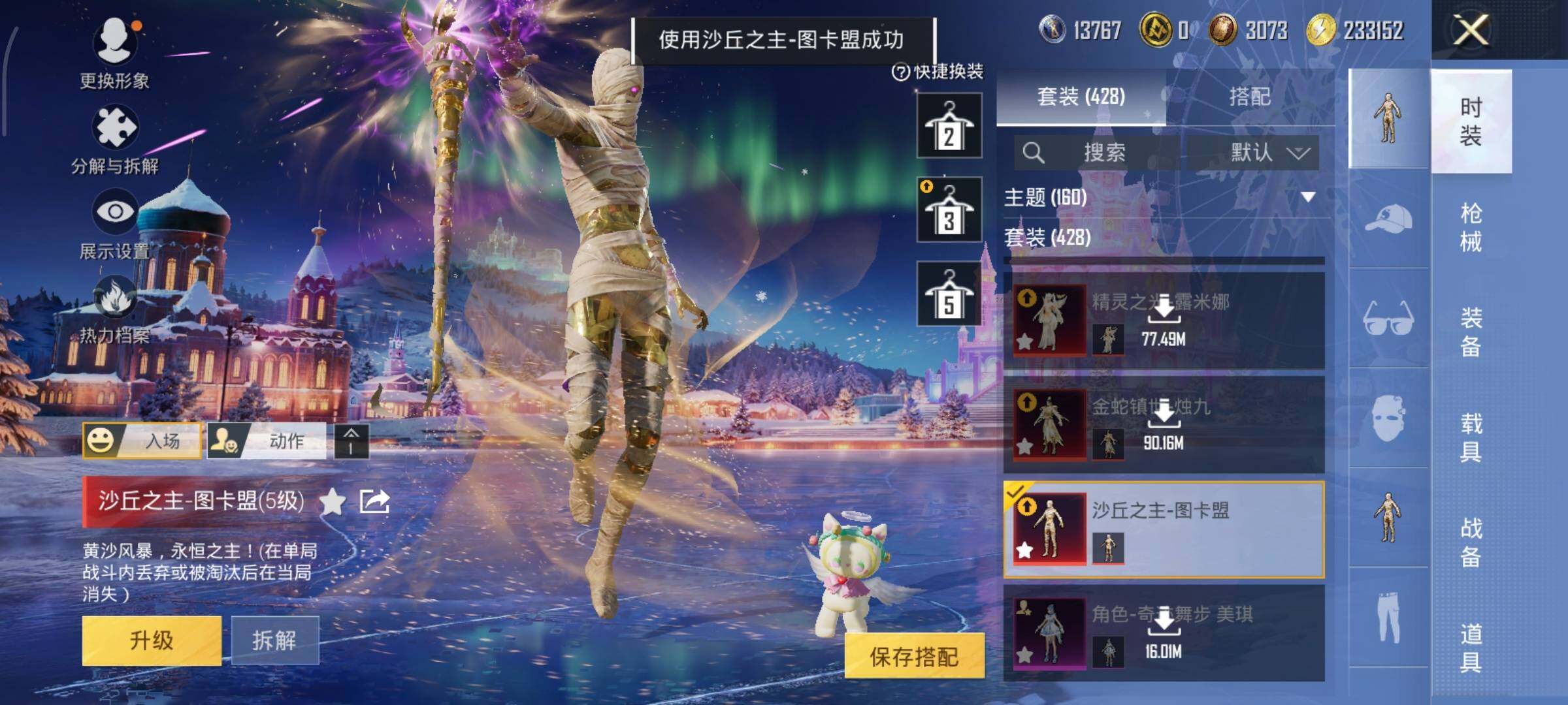 【红色神装等级】:魔童闹海-哪吒(一级),金蛇镇世-烛九(一级),精灵之光-露米娜(一级),镜域双华-欧若拉(一级),沙丘之主-图卡盟(五级)