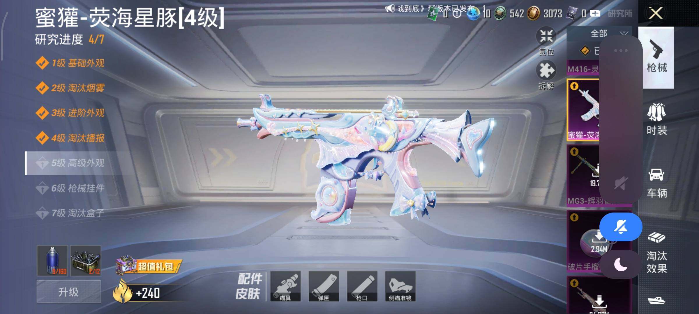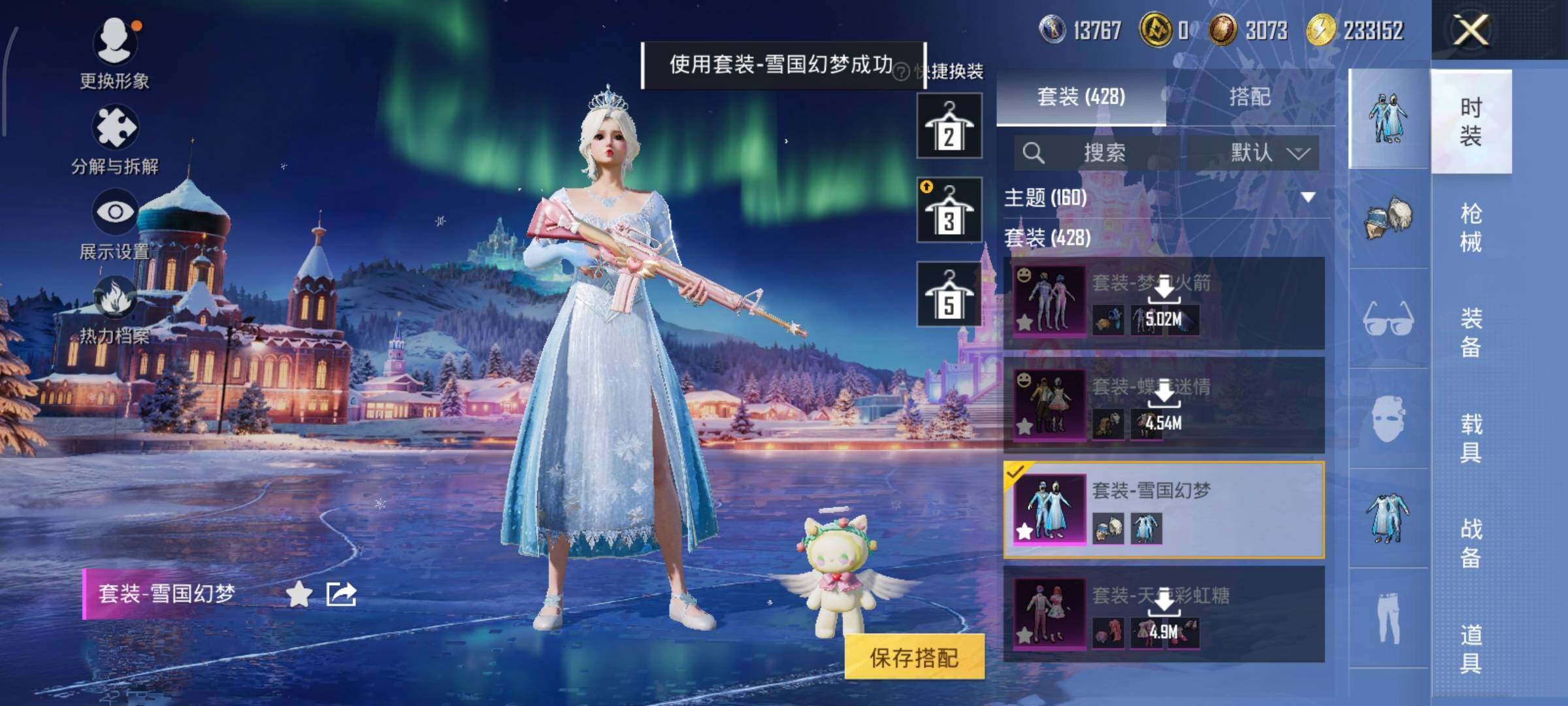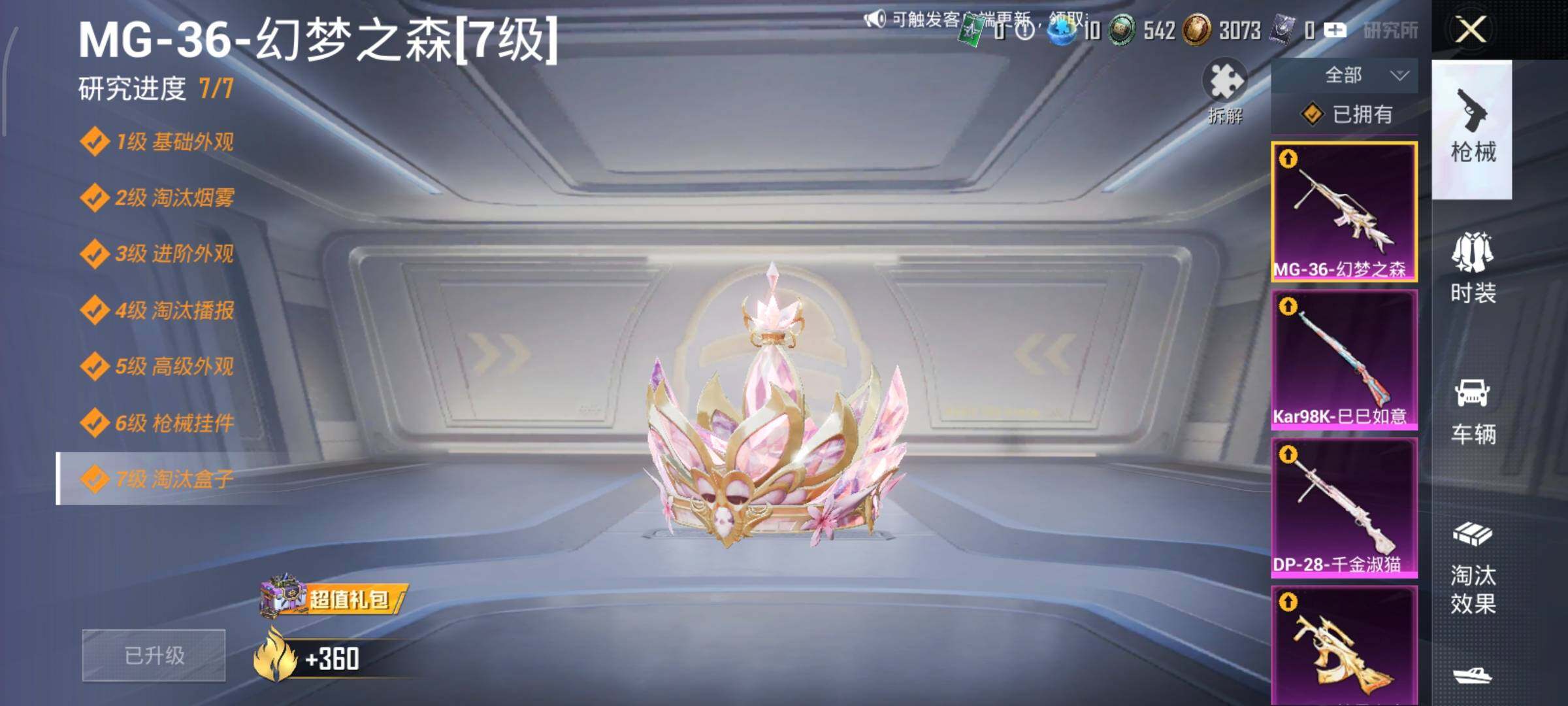 AKM-炫紫旋律,AKM-绿萝繁花,SCAR-L-梦幻火箭,M416-五爪金龙,M416-心之恋语,M416-墨龙九天,GROZA-巴啦啦小魔仙,GROZA-精灵之光,AUG-星之彼岸,M762-甜蜜誓约,M762-电糖天使,UMP45-雪国精灵,UMP45-恐龙拽拽,野牛-青空秋雨,P90-甜蜜草莓,P90-沙丘之主,Kar98K-未来歌姬,Kar98K-巳巳如意,M24-镜域双华,AWM-焰龙焚天,SKS-碧影闪光,Mk14-精灵梦叶罗丽,Mk14-盛世惊鸿,SLR-暗夜玫瑰,M417-第五大道,M200-梦海之灵,M249-蓝莓炮弹,M249-彩虹甜喵,M249-猪猪侠,DP-28-暗夜鎏金,DP-28-圣堂之誓,DP-28-千金淑猫,MG3-洛神天依,PKM-天星战神,PKM-江南烟雨,MG-36-幻梦之森,平底锅-仲夏莫吉托,烟雾弹-猫咪绅士,破片手榴弹-粉粉猫爪