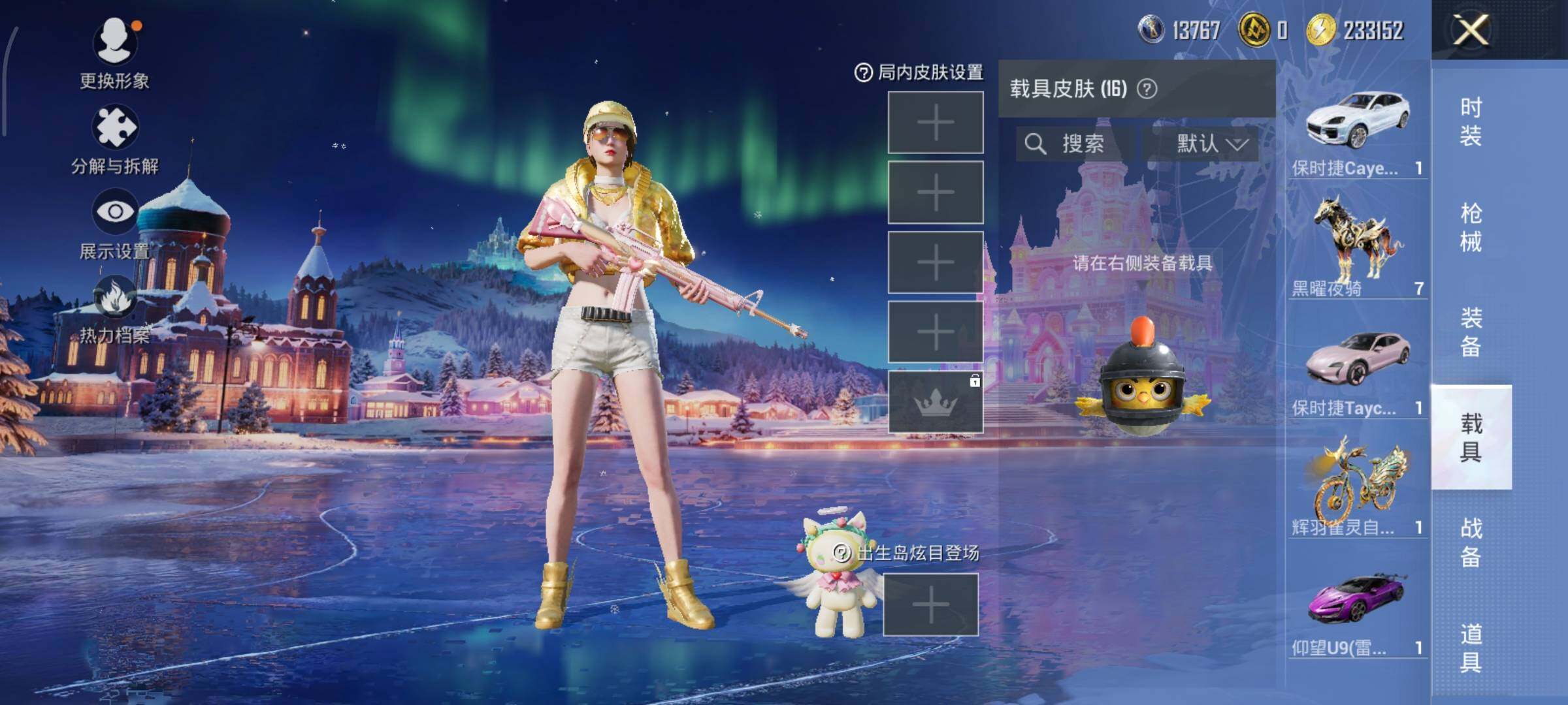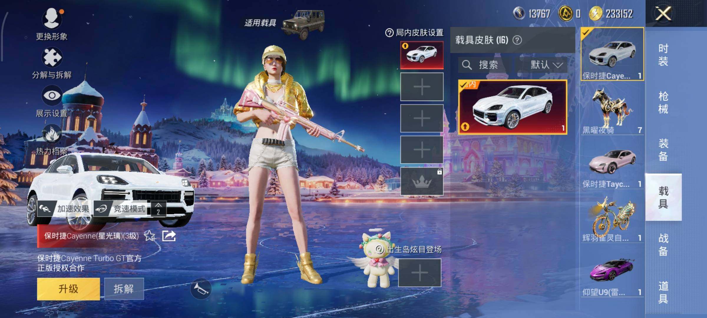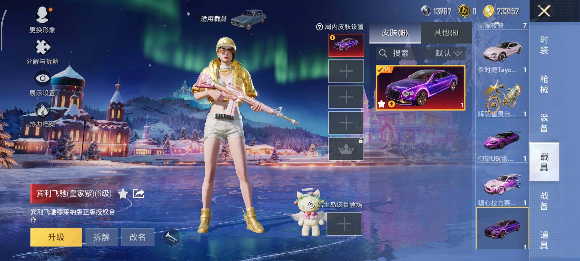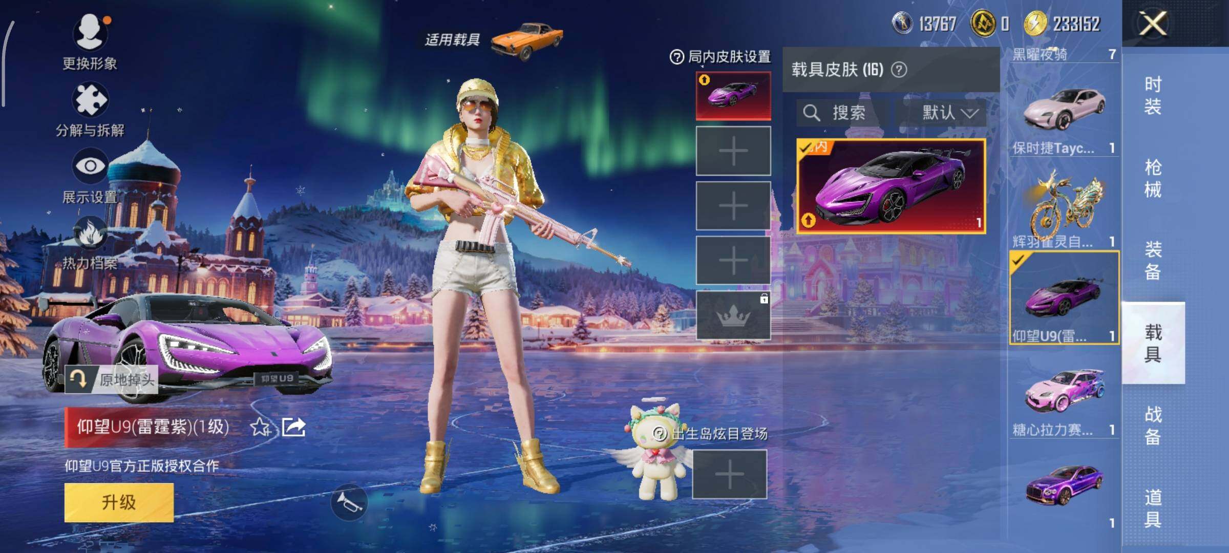 【粉色载具】:宾利欧陆GT敞篷(火焰橘),宾利飞驰(皇家紫),仰望U9(雷霆紫),保时捷Taycan 旅行版(冰莓粉),保时捷Cayenne(星光璃),合金龙骨(绿),糖心拉力赛车(波动紫),双人摩托-梦幻火箭,空客H135-蔚蓝之翼,赤兔,照夜玉狮子,星梦玉骢,护世瑞兽,晶梦灵驹,黑曜夜骑,冰绡玉鳞,辉羽雀灵自行车