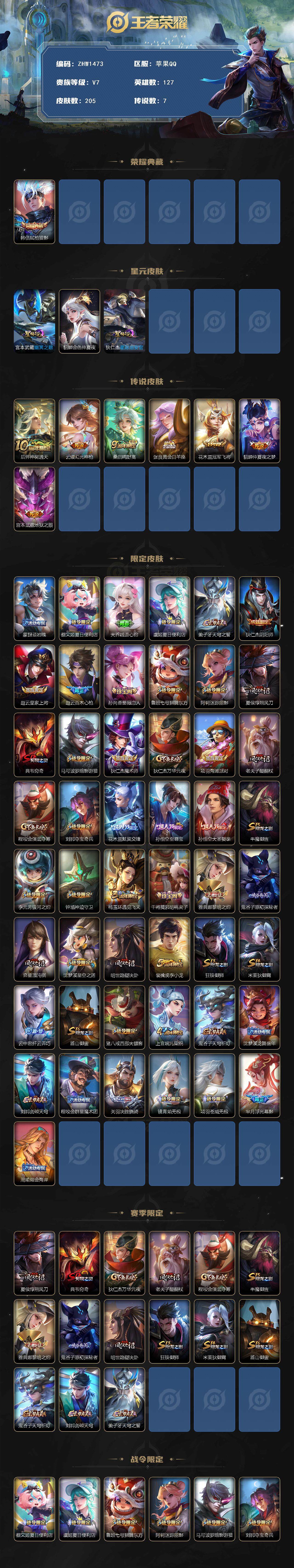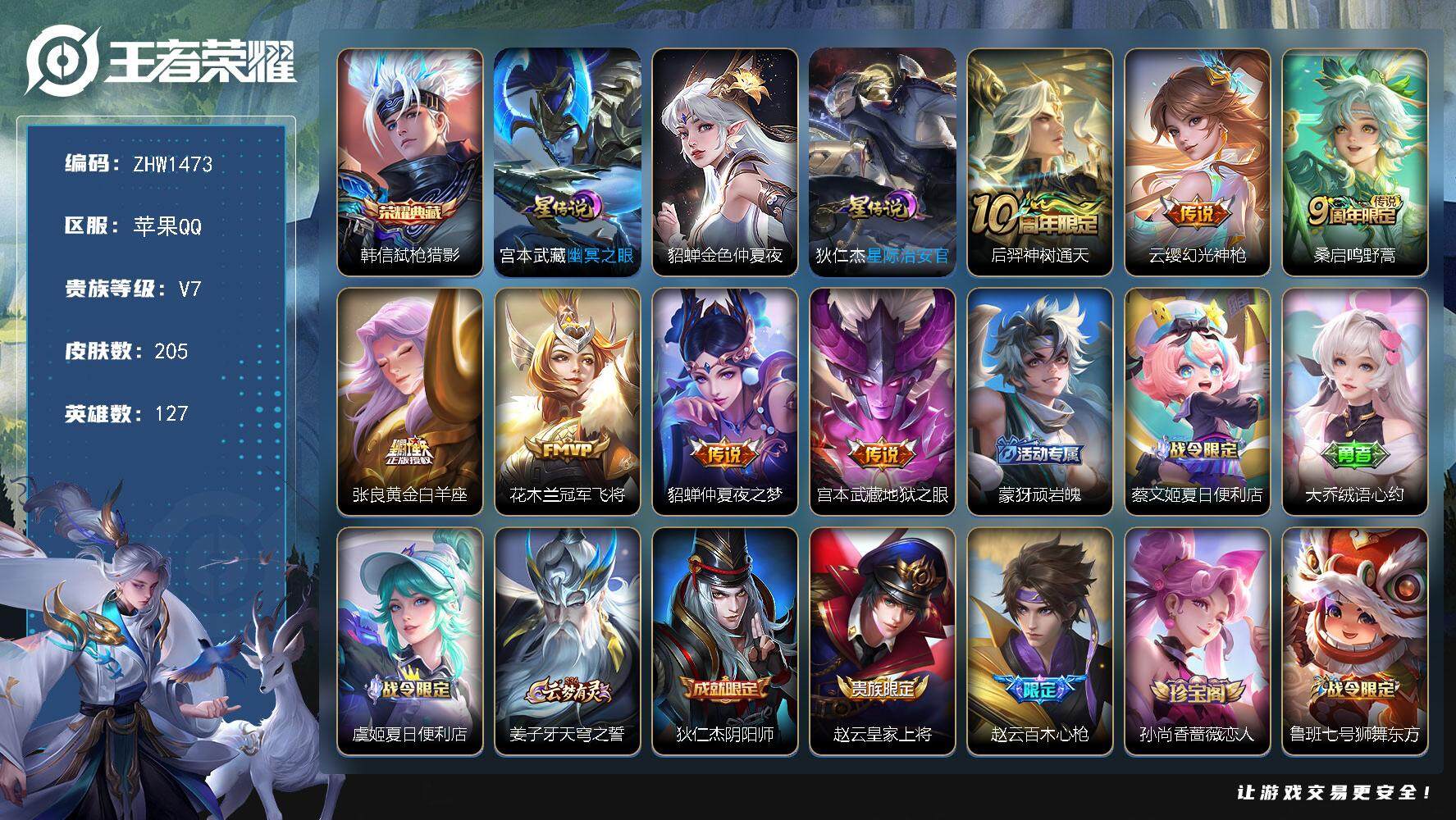 [14009771]可二次【店主推荐捡漏号!可直接换绑】苹果Q-V7-至尊星耀IV段位-127英雄-205皮肤-1典藏-7传说-57史诗