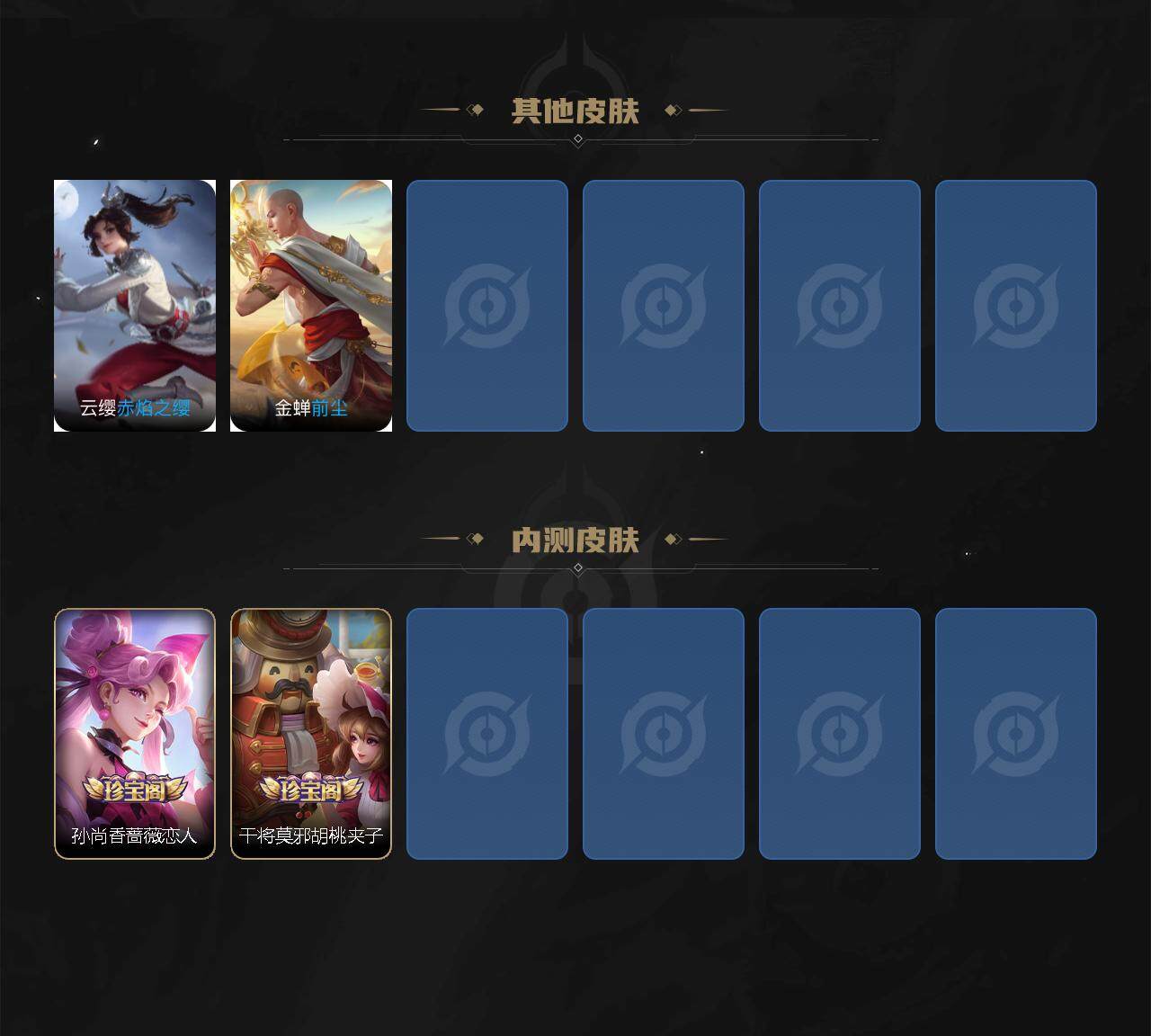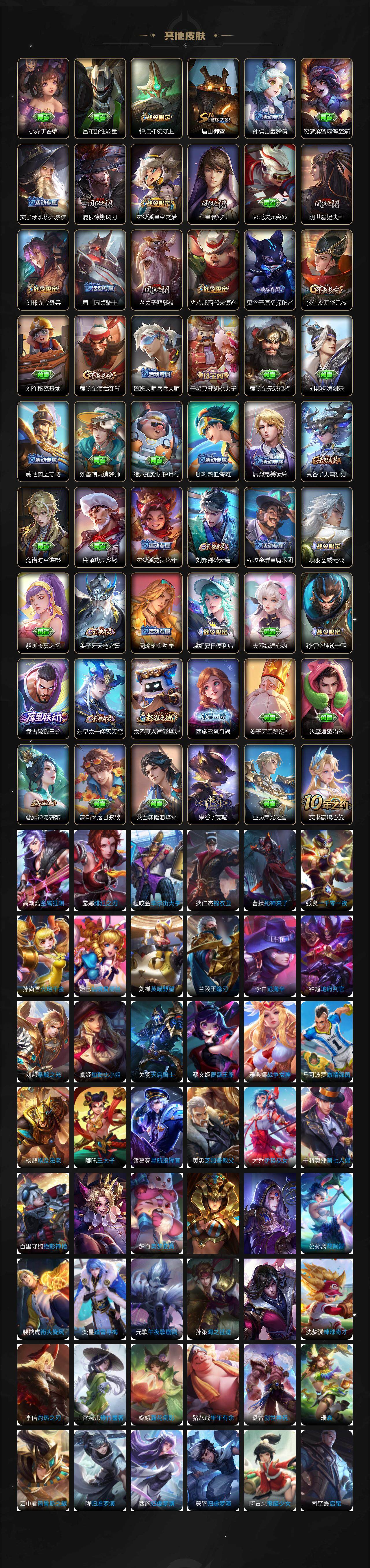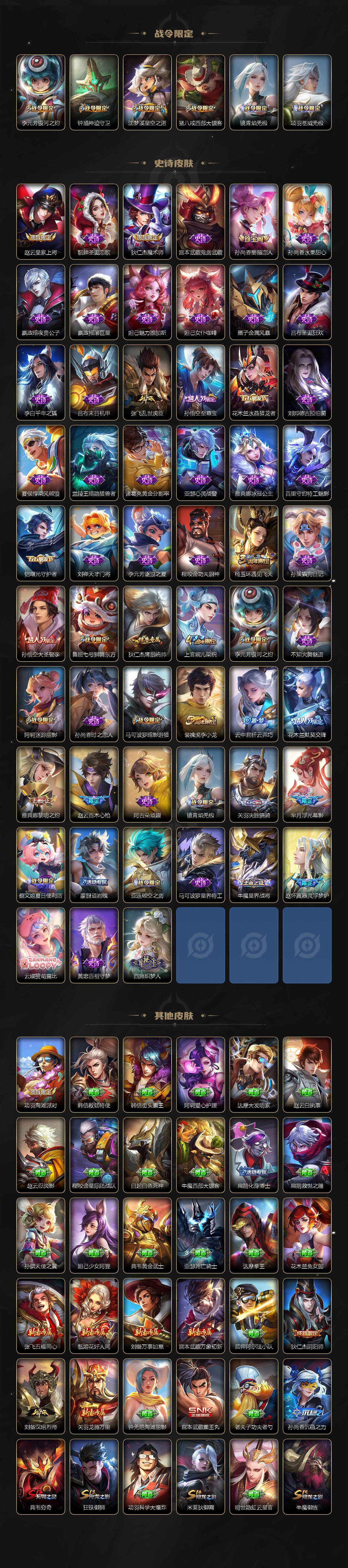 【限定皮肤】:蒙犽顽岩魄,蔡文姬夏日便利店,大乔绒语心约,虞姬夏日便利店,姜子牙天穹之誓,狄仁杰阴阳师,赵云皇家上将,赵云百木心枪,孙尚香蔷薇恋人,鲁班七号狮舞东方,阿轲迷踪丽影,夏侯惇朔风刀,典韦穷奇,马可波罗暗影游猎,狄仁杰魔术师,狄仁杰万华元夜,项羽海滩派对,老夫子醍醐杖,程咬金演武夺筹,刘邦夺宝奇兵,花木兰默契交锋,孙悟空至尊宝,孙悟空大圣娶亲,牛魔御旌,李元芳银河之约,钟馗神迹守卫,杨玉环遇见飞天,干将莫邪胡桃夹子,雅典娜黎明之约,鬼谷子原初探秘者,弈星混沌棋,沈梦溪星空之诺,明世隐疑决卦,裴擒虎李小龙,狂铁御狮,米莱狄御霄,云中君纤云弄巧,盾山御銮,猪八戒西部大镖客,上官婉儿梁祝,鬼谷子天穹祈灯,沈梦溪龙舞盛年,刘邦剑破天穹,程咬金群星魔术团,关羽决胜骁骑,镜青焰无极,项羽苍威无极,芈月浮光幕影,周瑜熔金海岸