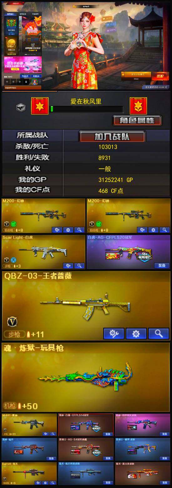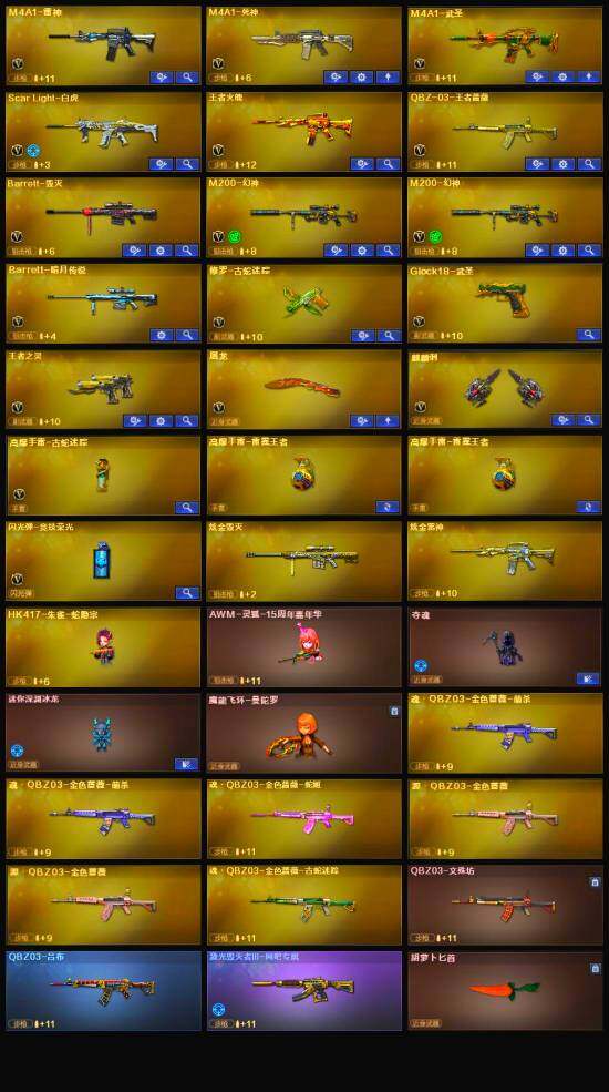 【英雄级武器】:M4A1-雷神,M4A1-死神,M4A1-武圣,Scar Light-白虎,王者火魄-觉醒版,QBZ-03-王者蔷薇-觉醒版,Barrett-毁灭,M200-幻神*2,王者之灵-觉醒版,Glock18-武圣,修罗-古蛇迷踪,屠龙,麒麟刺,高爆手雷-古蛇迷踪,闪光弹-竞技荣光,烟雾弹-古蛇迷踪,M4A1-赤狱骑士