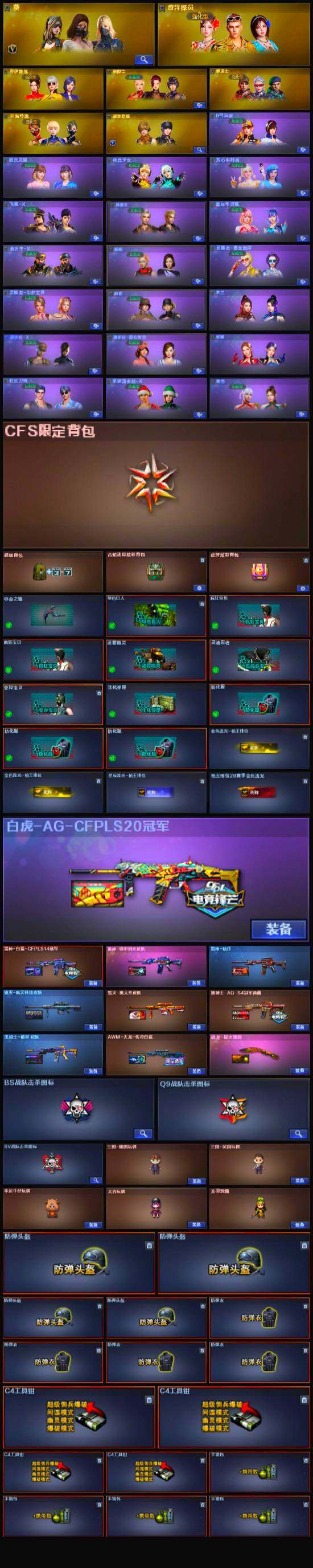 【道具】:CFS限定背包,云山科技背包,古蛇迷踪炫彩背包,虎牙炫彩背包,超级背包,女皇终结者-魔龙之吻,救世主-黑桃战神,绿色巨人,灵魂忍者,变异宝贝,迷雾幽灵,生化弹匣,夺命之镰,防化服*3,金色流光-枪王排位*2,星辰流光-枪王排位,流光-鎏金之域,流光-再燃火线,枪王排位28赛季金色流光,枪王排位29赛季金色流光,古蛇迷踪打击特效,蛇隐宗表情,EP战队名片,EP战队喷图,防弹头盔*4,防弹衣*4,C4工具钳*4,手雷包*4