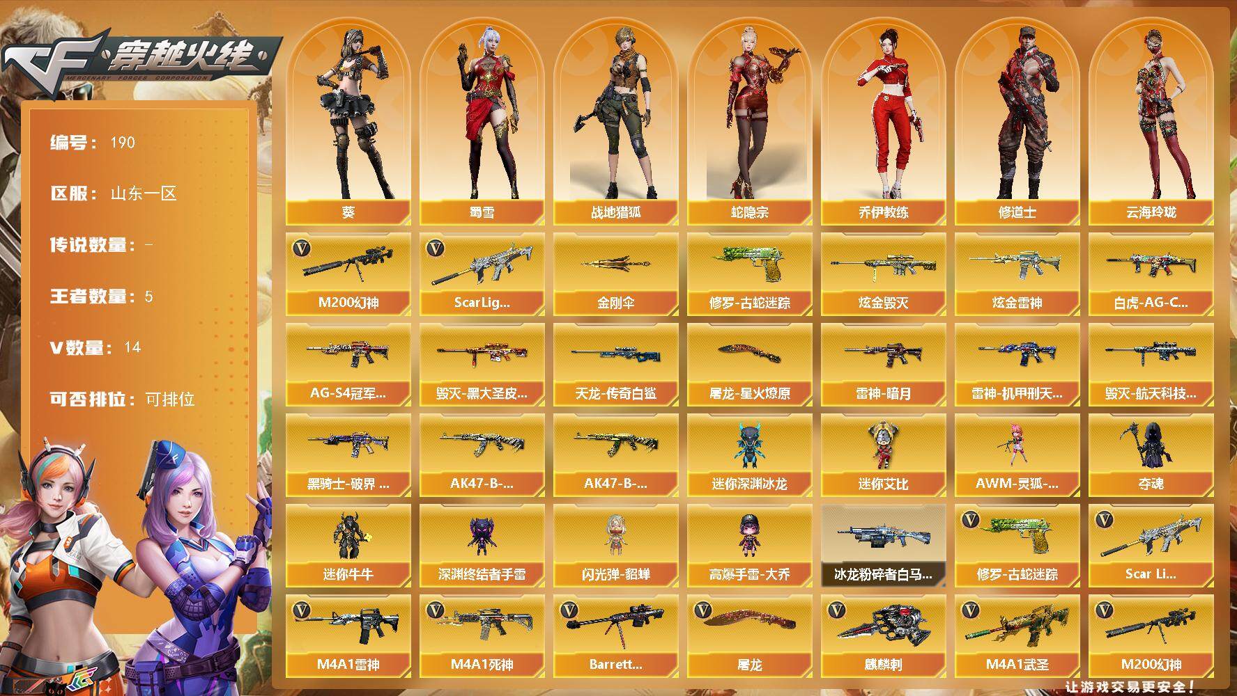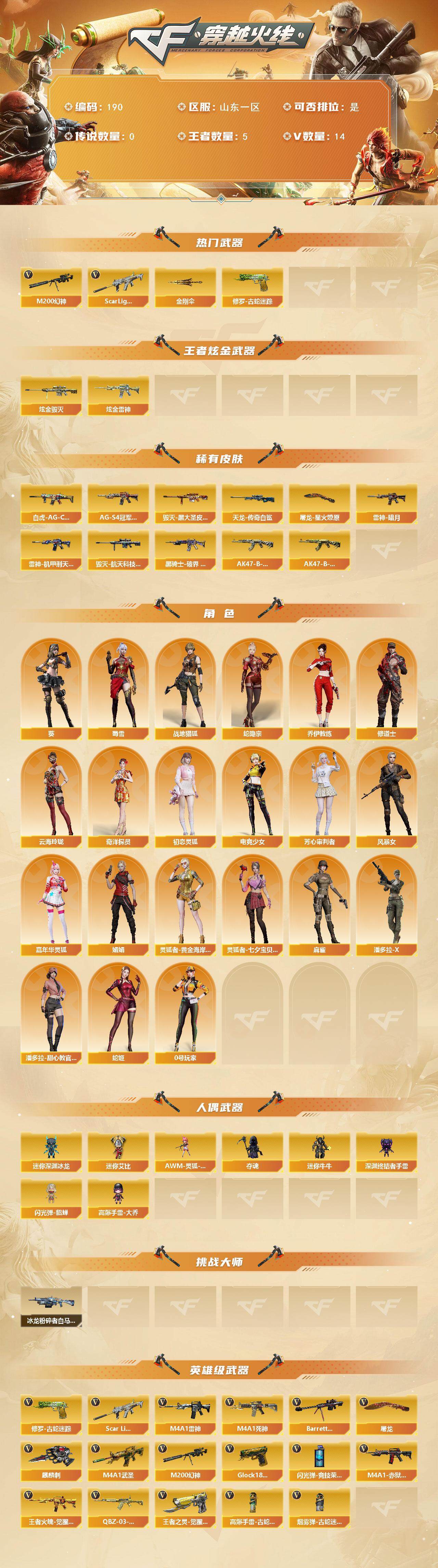[14009918]山东一区-14V-5王者-2炫金 【热门武器】:Scar Light-白虎,M200-幻神*2,修罗-古蛇迷踪,金刚伞 【王者炫金武器】:炫金雷神,炫金毁灭 【皮肤】:白虎-AG-CFPLS20冠军,雷神-暗月,雷神-机甲刑天皮肤,毁灭-黑大圣皮肤,毁灭-航天科技皮肤,黑骑士-AG-S4冠军典藏,黑骑士-破界 皮肤,AK47-B-常胜将军-刘备,AK47-B-常胜将军-孙权*2,AWM-天龙-传奇白鲨,屠龙-星火燎原 【角色】:葵,战地猎狐,蛇隐宗,奇洋探员,乔伊教练,修道士,云海玲珑,初恋灵狐,电竞少女,芳心审判者,风暴女,嘉年华灵狐,娟娟,0号玩家,灵狐者-黄金海岸,灵狐者-七夕宝贝,麻雀,潘多拉-X,潘多拉-甜心教官,蛇姬,蜀雪 【人偶武器】:AWM-灵狐-15周年嘉年华,迷你深渊冰龙,夺魂,迷你牛牛,深渊终结者手雷,闪光弹-貂蝉,高爆手雷-大乔,迷你艾比 【挑战大师】:冰龙粉碎者-白马银枪*2 【英雄级武器】:M4A1-雷神,M4A1-死神,M4A1-武圣,Scar Light-白虎,王者火魄-觉醒版,QBZ-03-王者蔷薇-觉醒版,Barrett-毁灭,M200-幻神*2,王者之灵-觉醒版,Glock18-武圣,修罗-古蛇迷踪,屠龙,麒麟刺,高爆手雷-古蛇迷踪,闪光弹-竞技荣光,烟雾弹-古蛇迷踪,M4A1-赤狱骑士 【道具】:CFS限定背包,云山科技背包,古蛇迷踪炫彩背包,虎牙炫彩背包,超级背包,女皇终结者-魔龙之吻,救世主-黑桃战神,绿色巨人,灵魂忍者,变异宝贝,迷雾幽灵,生化弹匣,夺命之镰,防化服*3,金色流光-枪王排位*2,星辰流光-枪王排位,流光-鎏金之域,流光-再燃火线,枪王排位28赛季金色流光,枪王排位29赛季金色流光,古蛇迷踪打击特效,蛇隐宗表情,EP战队名片,EP战队喷图,防弹头盔*4,防弹衣*4,C4工具钳*4,手雷包*4 【特殊枪械】:1白虎