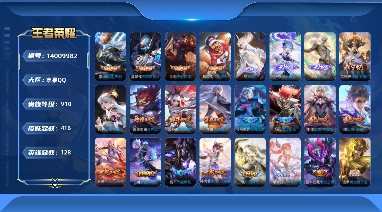 [14009982]【店主推荐捡漏号!可直接换绑】苹果Q-V10-最强王者段位-128英雄-416皮肤-4典藏-2星传说-4无双-43传说-139史诗
