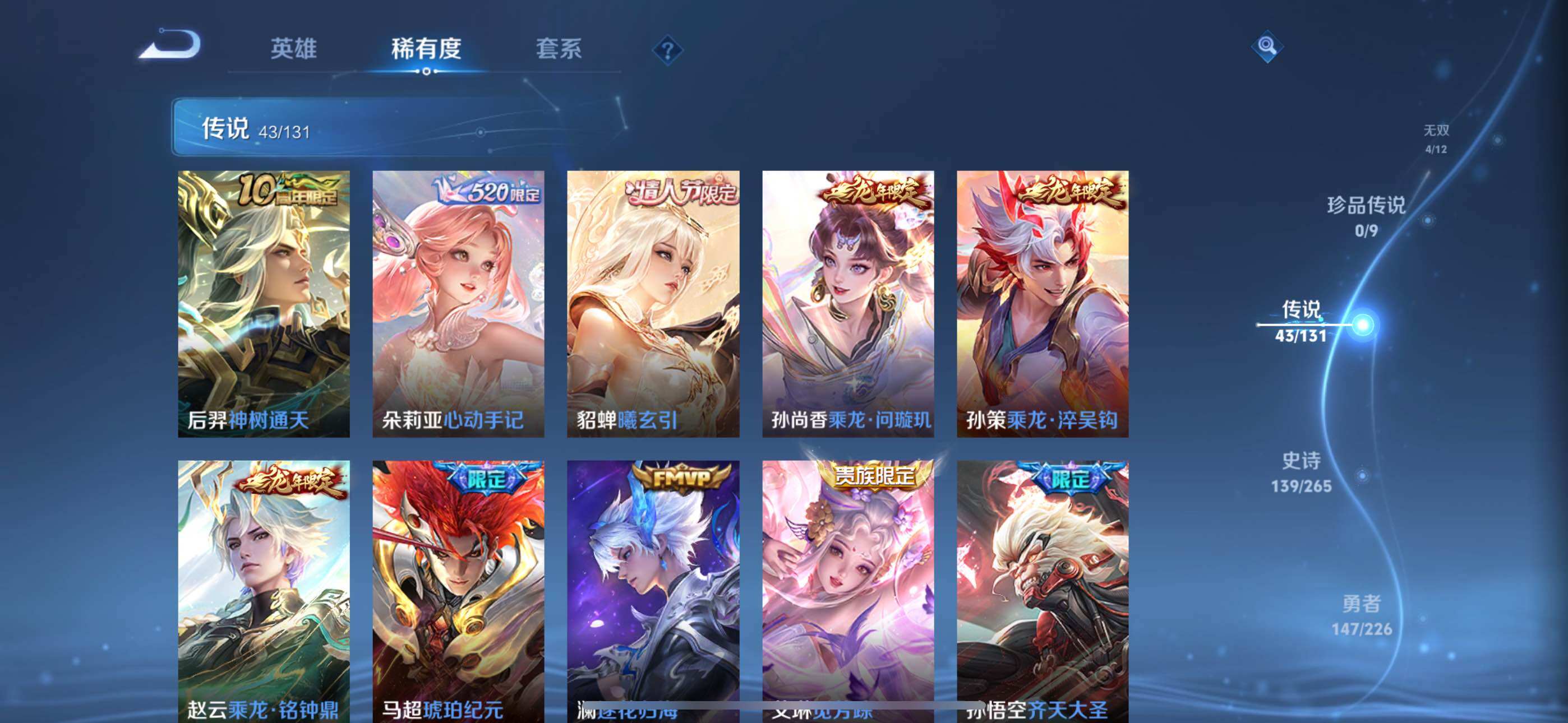 【传说皮肤】:后羿神树通天,朵莉亚心动手记,貂蝉曦玄引,孙尚香乘龙问璇玑,孙策乘龙淬吴钩,赵云乘龙铭钟鼎,马超琥珀纪元,澜逐花归海,艾琳觅芳踪,孙悟空齐天大圣,小乔山海琳琅生,曜山海苍雷引,李信山海炽霜斩,李白诗剑行,狄仁杰神器狴犴令,百里守约碎云,马可波罗深海之息,马超无双飞将,孙策末日机甲,貂蝉遇见胡旋,西施游龙清影,周瑜音你心动,小乔音你心动,李元芳飞鸢探春,公孙离祈雪灵祝,铠绛天战甲,镜炽阳神光,虞姬启明星使,关羽武圣,曜云鹰飞将,李信一念神魔,刘备时之恋人,干将莫邪久胜战神,虞姬云霓雀翎,达摩黄金狮子座,百里玄策白虎志,花木兰冠军飞将,梦奇胖达荣荣,貂蝉仲夏夜之梦,李白凤求凰,宫本武藏地狱之眼,吕布天魔缭乱,狄仁杰超时空战士