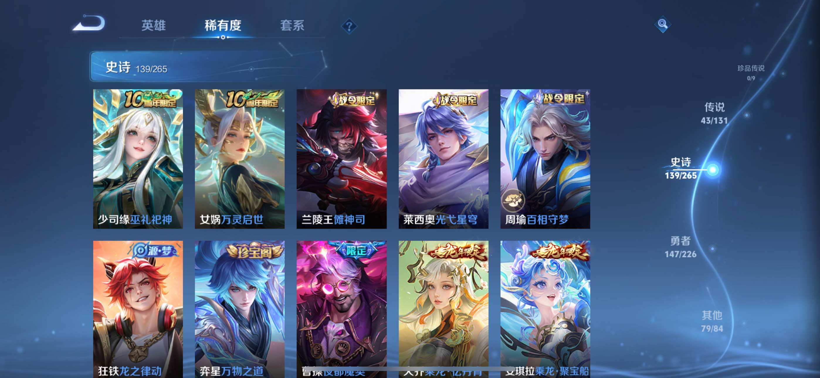 米莱狄御霄,牛魔御旌,盾山御銮,夏侯惇朔风刀,明世隐疑决卦,老夫子醍醐杖,鬼谷子原初探秘者,狄仁杰万华元夜,程咬金演武夺筹,钟馗驱傩正仪,苏烈千军破阵,吕布猎兽之王,嬴政白昼王子,女娲朔望之晖,典韦蓝屏警告,钟馗神迹守卫,鲁班七号狮舞东方,沈梦溪星空之诺,李元芳银河之约,刘邦夺宝奇兵,马可波罗暗影游猎,蒙犽狂想玩偶喵,元歌云间偶戏,弈星混沌棋,达摩沙漠行僧,兰陵王金庭之子,沈梦溪大漠名商,李元芳云中旅人,桑启海盐诗旅,裴擒虎擒涛扼浪,鲁班大师探海日志,张良古海寻踪