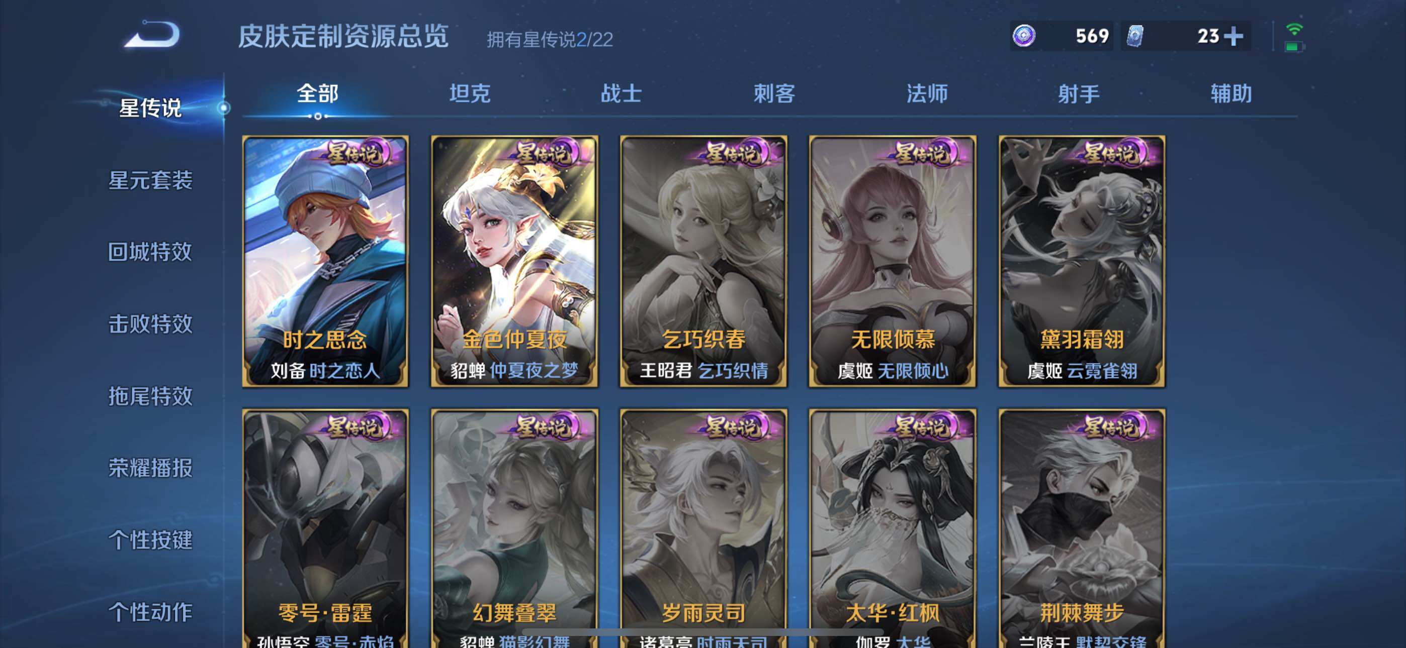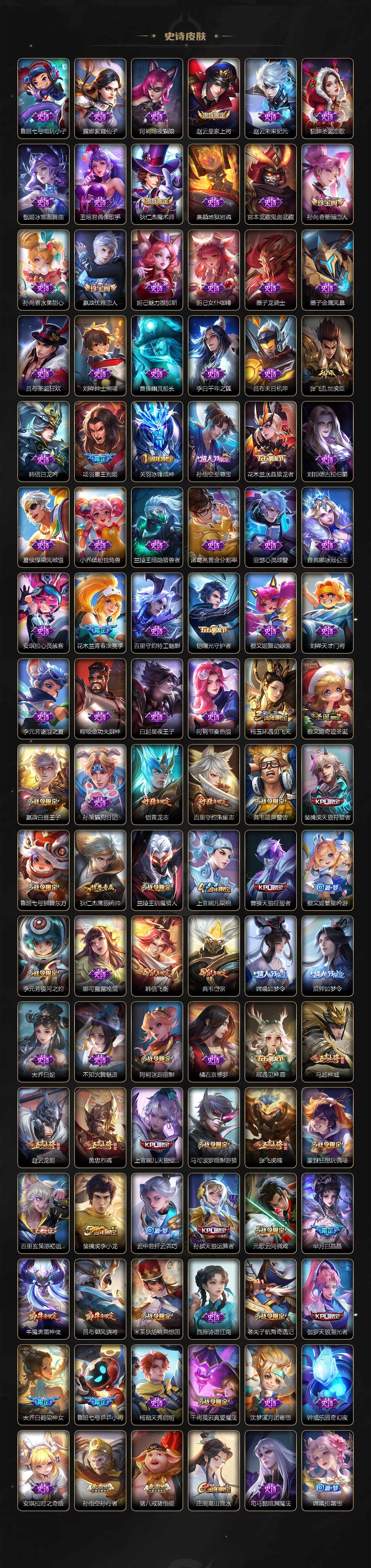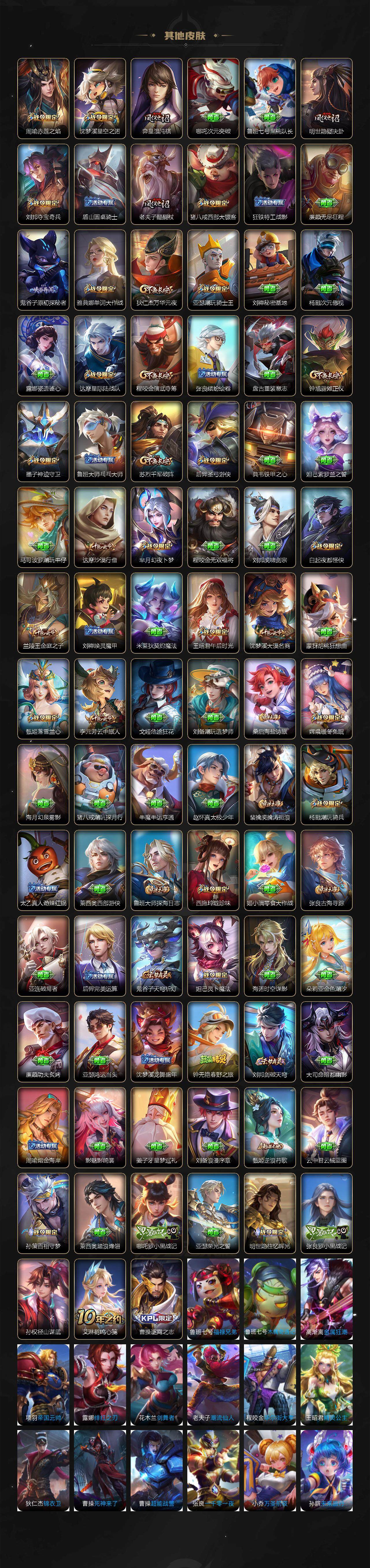 大乔白蛇,瑶遇见神鹿,娜可露露晚萤,李元芳逐浪之夏,不知火舞魅语,孙策猫狗日记,阿轲节奏热浪,露娜紫霞仙子,诸葛亮黄金分割率,王昭君偶像歌手,韩信白龙吟,阿轲暗夜猫娘,雅典娜冰冠公主,吕布末日机甲,鲁班七号电玩小子,橘右京修罗,墨子龙骑士,刘禅绅士熊喵,刘禅天才门将,白起星夜王子,安琪拉心灵骇客,安琪拉时之奇旅,程咬金功夫厨神,刘邦德古拉伯爵,兰陵王暗隐猎兽者,曹操幽灵船长,宫本武藏鬼剑武藏,司马懿暗渊魔法,亚瑟心灵战警,钟馗乐园奇幻夜,杨戬天秀·启明,蔡文姬舞动绿茵,廉颇地狱岩魂,西施诗语江南,小乔缤纷独角兽,夏侯惇乘风破浪,花木兰水晶猎龙者,铠曙光守护者,墨子金属风暴,百里玄策原初追逐者,吕布圣诞狂欢,貂蝉圣诞恋歌,百里守约特工魅影,嫦娥拒霜思,雅典娜黎明之约,李白千年之狐,哪吒雪上飞焰,夏洛特永昼,澜赏金猎手,高渐离天秀·音浪,张良千筹问战,高渐离燃音魔法,大乔乘龙·忆丹青,安琪拉乘龙·聚宝船,曹操夜都魔契