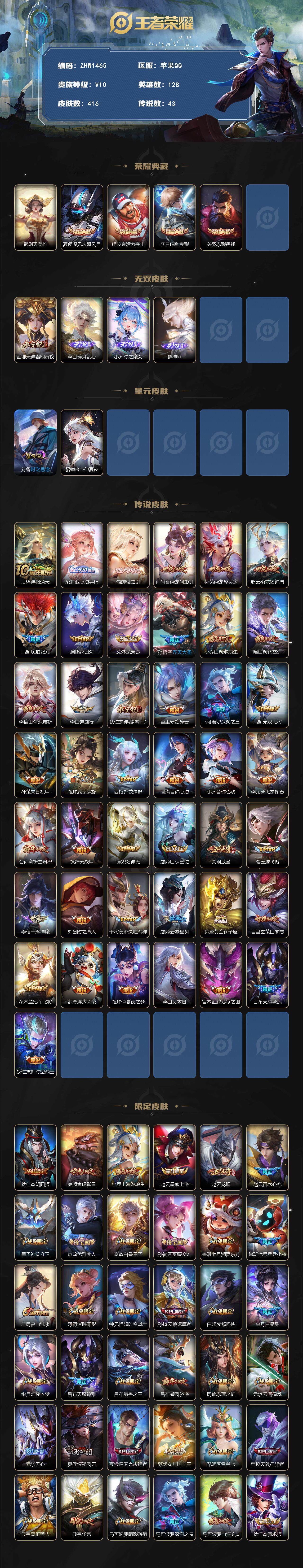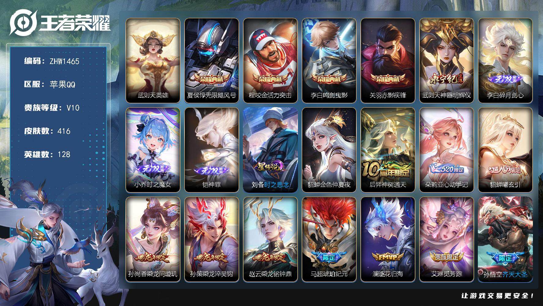 [14009982]【店主推荐捡漏号!可直接换绑】苹果Q-V10-最强王者段位-128英雄-416皮肤-4典藏-2星传说-4无双-43传说-139史诗 【英雄全皮】:刘邦全皮,孙权全皮,李信全皮,猪八戒全皮,鲁班大师全皮,金蝉全皮,影全皮 【荣耀典藏】:武则天英雄,夏侯惇无限飓风号,程咬金活力突击,李白鸣剑曳影,关羽赤影疾锋 【无双皮肤】:武则天神器明辉仪,李白碎月剑心,小乔时之魔女,铠神罪 【传说皮肤】:后羿神树通天,朵莉亚心动手记,貂蝉曦玄引,孙尚香乘龙问璇玑,孙策乘龙淬吴钩,赵云乘龙铭钟鼎,马超琥珀纪元,澜逐花归海,艾琳觅芳踪,孙悟空齐天大圣,小乔山海琳琅生,曜山海苍雷引,李信山海炽霜斩,李白诗剑行,狄仁杰神器狴犴令,百里守约碎云,马可波罗深海之息,马超无双飞将,孙策末日机甲,貂蝉遇见胡旋,西施游龙清影,周瑜音你心动,小乔音你心动,李元芳飞鸢探春,公孙离祈雪灵祝,铠绛天战甲,镜炽阳神光,虞姬启明星使,关羽武圣,曜云鹰飞将,李信一念神魔,刘备时之恋人,干将莫邪久胜战神,虞姬云霓雀翎,达摩黄金狮子座,百里玄策白虎志,花木兰冠军飞将,梦奇胖达荣荣,貂蝉仲夏夜之梦,李白凤求凰,宫本武藏地狱之眼,吕布天魔缭乱,狄仁杰超时空战士 【限定皮肤】:狄仁杰阴阳师,廉颇寅虎御盾,小乔山海琳琅生,赵云皇家上将,赵云龙胆,赵云百木心枪,墨子神迹守卫,嬴政优雅恋人,嬴政白昼王子,孙尚香蔷薇恋人,鲁班七号狮舞东方,鲁班七号乒乒小将,庄周高山流水,阿轲迷踪丽影,钟无艳超时空战士,孙膑天狼运算者,白起夜都怪侠,芈月白晶晶,芈月幻夜卜梦,吕布天魔缭乱,吕布猎兽之王,吕布御风骁将,周瑜赤莲之焰,元歌云间偶戏,元歌无心,夏侯惇朔风刀,夏侯惇匿光决锋者,甄姬女儿国国王,甄姬落雪兰心,曹操天狼征服者,典韦蓝屏警告,典韦岱宗,马可波罗暗影游猎,马可波罗深海之息,马可波罗山海玄木吟,狄仁杰魔术师,狄仁杰万华元夜,狄仁杰神器狴犴令,达摩星际陆战队,达摩沙漠行僧,项羽海滩派对,项羽霸王别姬,老夫子醍醐杖,老夫子航海奇遇记,关羽冰锋战神,关羽武圣,貂蝉遇见胡旋,程咬金演武夺筹,刘邦夺宝奇兵,韩信飞衡,韩信傲雪梅枪,王昭君午后时光,兰陵王驯魔猎人,兰陵王金庭之子,花木兰青春决赛季,亚瑟潮玩骑士王,孙悟空至尊宝,孙悟空孙行者,孙悟空齐天大圣,牛魔御旌,牛魔奔雷神使,后羿如梦令,后羿圣弓游侠,张飞虎魄,李元芳银河之约,李元芳云中旅人,