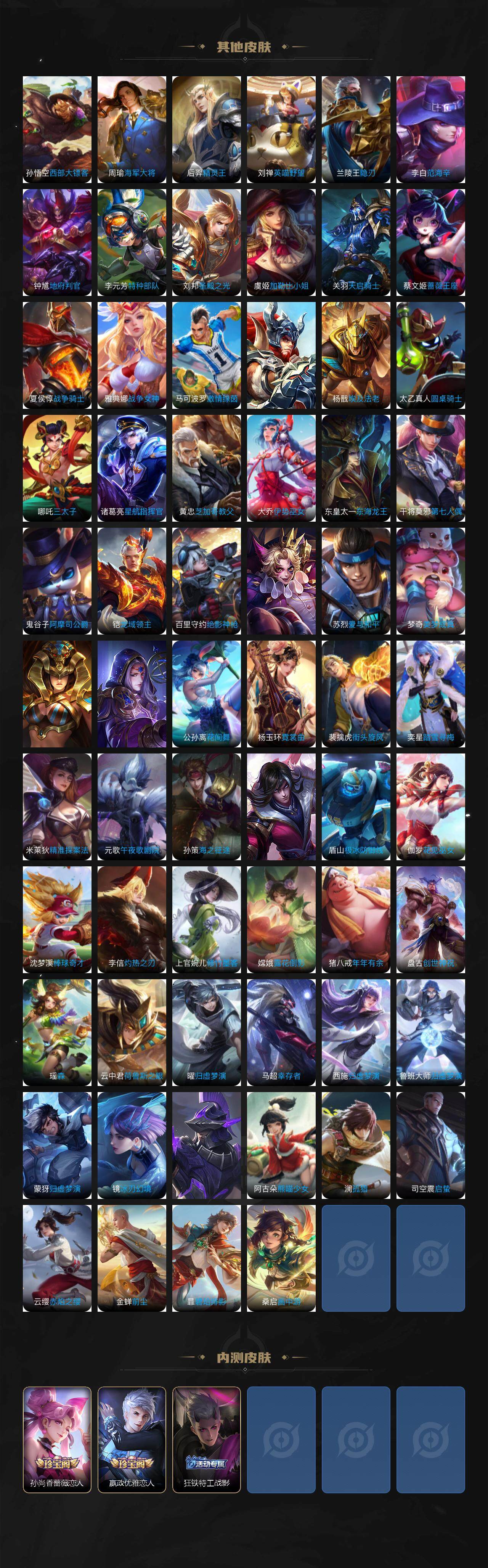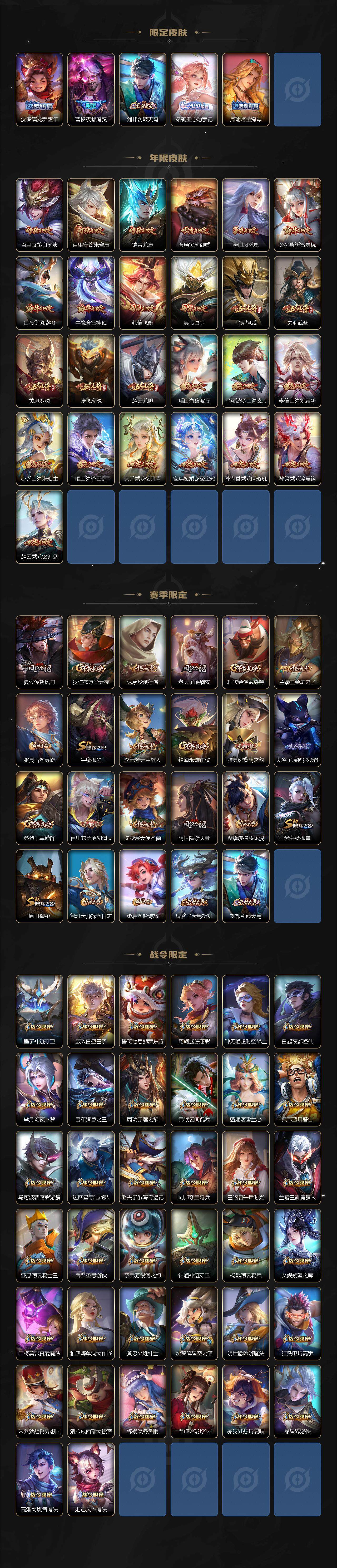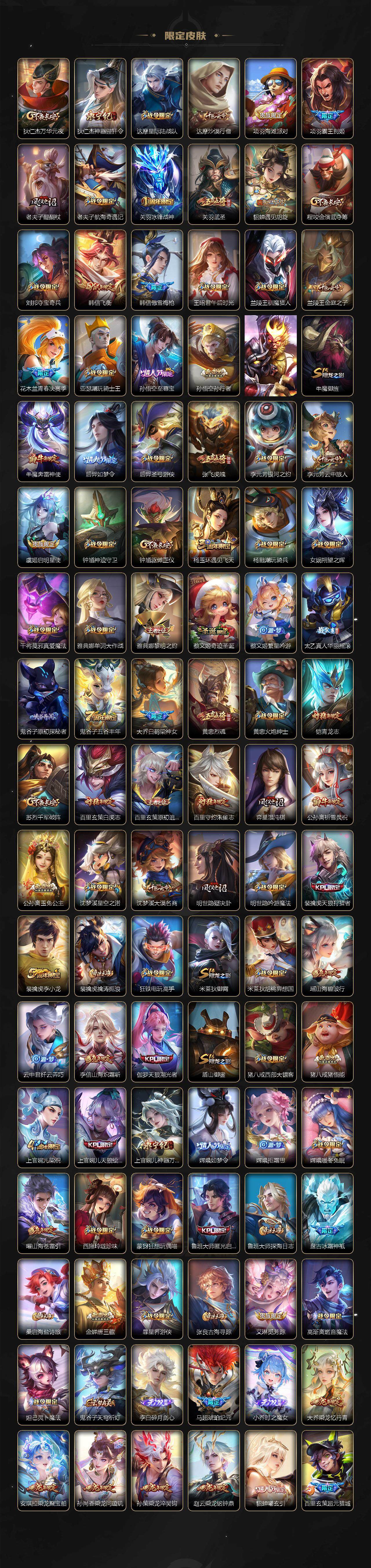 【限定皮肤】:狄仁杰阴阳师,廉颇寅虎御盾,小乔山海琳琅生,赵云皇家上将,赵云龙胆,赵云百木心枪,墨子神迹守卫,嬴政优雅恋人,嬴政白昼王子,孙尚香蔷薇恋人,鲁班七号狮舞东方,鲁班七号乒乒小将,庄周高山流水,阿轲迷踪丽影,钟无艳超时空战士,孙膑天狼运算者,白起夜都怪侠,芈月白晶晶,芈月幻夜卜梦,吕布天魔缭乱,吕布猎兽之王,吕布御风骁将,周瑜赤莲之焰,元歌云间偶戏,元歌无心,夏侯惇朔风刀,夏侯惇匿光决锋者,甄姬女儿国国王,甄姬落雪兰心,曹操天狼征服者,典韦蓝屏警告,典韦岱宗,马可波罗暗影游猎,马可波罗深海之息,马可波罗山海玄木吟,狄仁杰魔术师,狄仁杰万华元夜,狄仁杰神器狴犴令,达摩星际陆战队,达摩沙漠行僧,项羽海滩派对,项羽霸王别姬,老夫子醍醐杖,老夫子航海奇遇记,关羽冰锋战神,关羽武圣,貂蝉遇见胡旋,程咬金演武夺筹,刘邦夺宝奇兵,韩信飞衡,韩信傲雪梅枪,王昭君午后时光,兰陵王驯魔猎人,兰陵王金庭之子,花木兰青春决赛季,亚瑟潮玩骑士王,孙悟空至尊宝,孙悟空孙行者,孙悟空齐天大圣,牛魔御旌,牛魔奔雷神使,后羿如梦令,后羿圣弓游侠,张飞虎魄,李元芳银河之约,李元芳云中旅人,