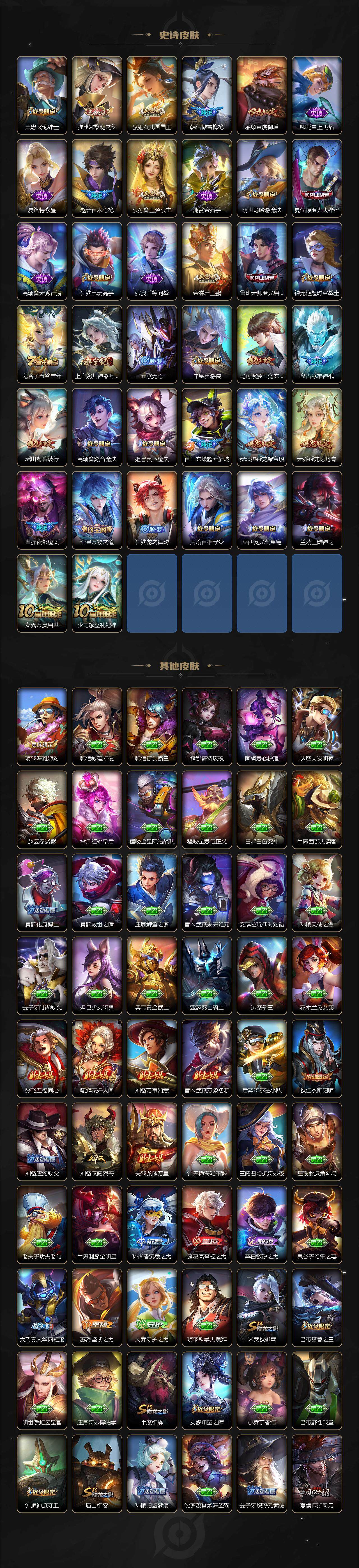 关羽冰锋战神,裴擒虎李小龙,上官婉儿梁祝,牛魔奔雷神使,公孙离祈雪灵祝,吕布御风骁将,赵云龙胆,关羽武圣,黄忠烈魂,张飞虎魄,马超神威,典韦岱宗,韩信飞衡,曹操天狼征服者,裴擒虎天狼狩猎者,孙膑天狼运算者,上官婉儿天狼绘梦者,伽罗天狼溯光者,铠青龙志,百里玄策白虎志,百里守约朱雀志,项羽霸王别姬,后羿如梦令,嫦娥如梦令,孙悟空至尊宝,花木兰青春决赛季,蔡文姬奇迹圣诞,芈月白晶晶,鲁班七号乒乒小将,大乔白鹤梁神女,猪八戒猪悟能,廉颇寅虎·御盾,孙悟空孙行者,甄姬女儿国国王,韩信傲雪梅枪,赵云百木心枪,公孙离玉兔公主,夏侯惇匿光决锋者,马可波罗深海之息,金蝉唐三藏,鲁班大师匿光启智者,上官婉儿神器·万象笔,李白诗剑行,马可波罗山海·玄木吟,盘古冰霜神祇,瑶山海·碧波行