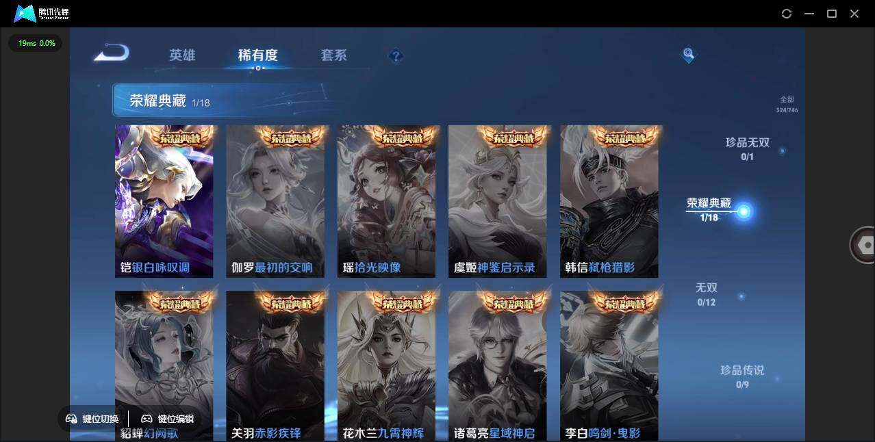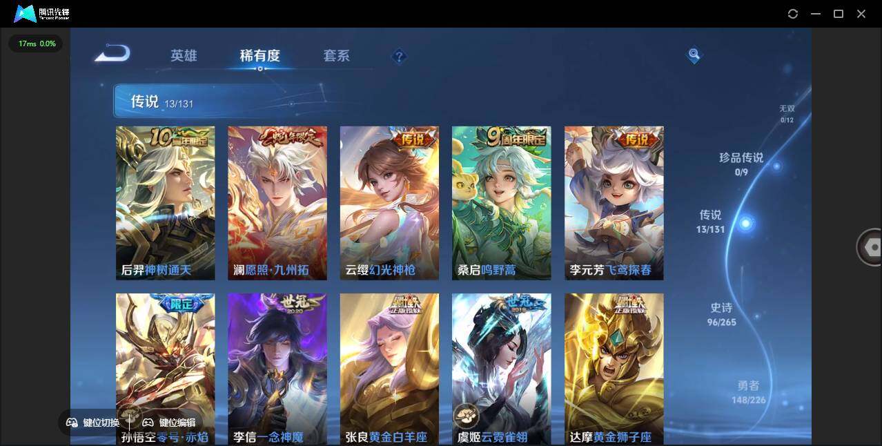 【传说皮肤】:后羿神树通天,澜愿照九州拓,云缨幻光神枪,桑启鸣野蒿,李元芳飞鸢探春,孙悟空零号赤焰,李信一念神魔,张良黄金白羊座,虞姬云霓雀翎,达摩黄金狮子座,百里玄策白虎志,梦奇胖达荣荣,狄仁杰超时空战士