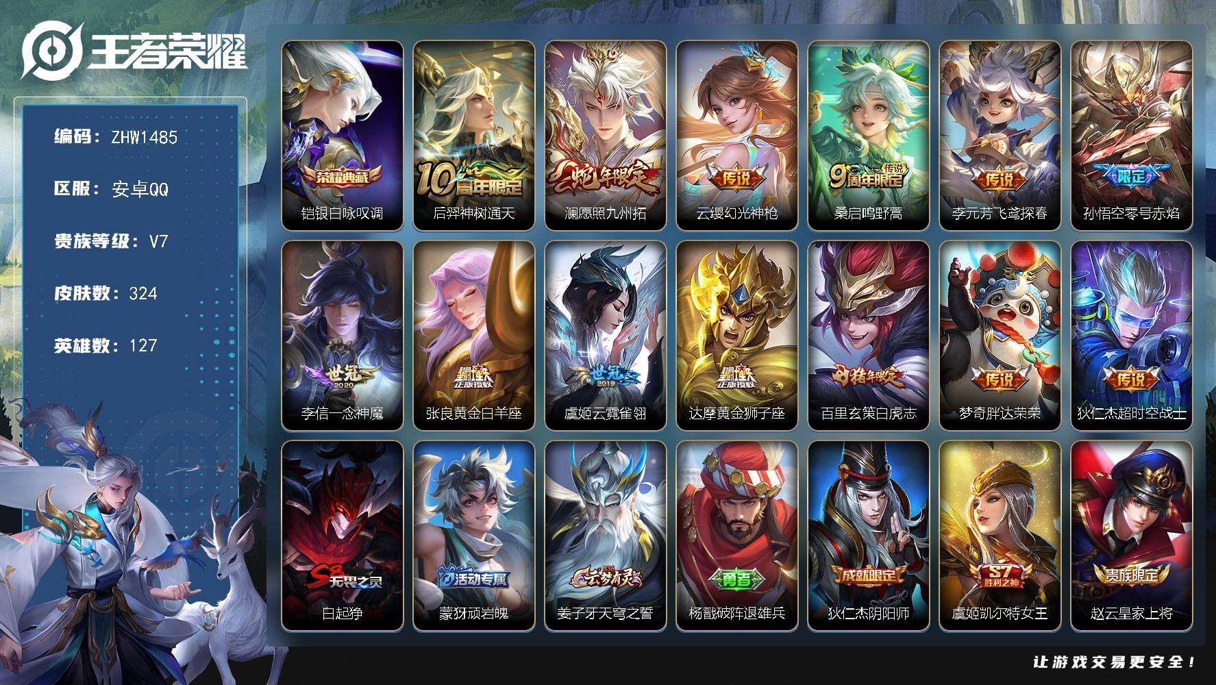 [14009764]可二次,【店主推荐捡漏号!可直接换绑】安卓Q-V7-永恒钻石I段位-127英雄-324皮肤-1典藏-0珍品无双-0无双-0珍品传说-13传说-96史诗