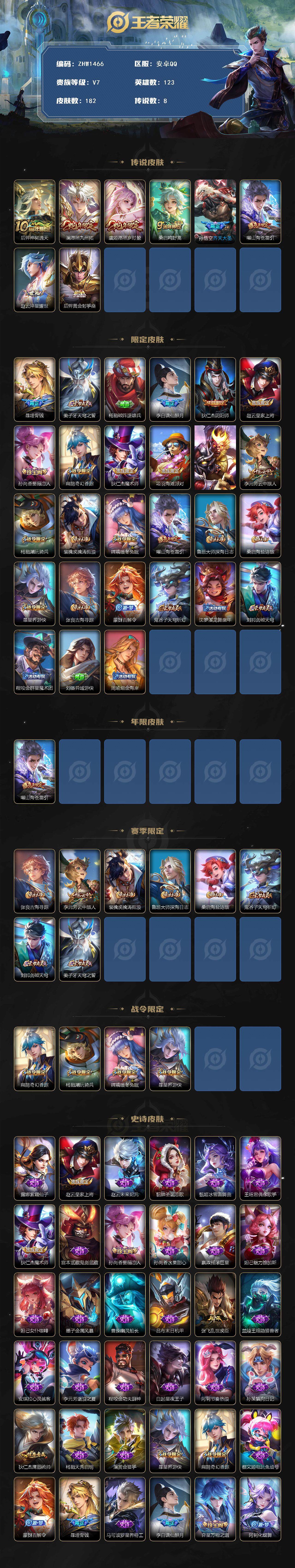 - PX_2072991-贵族等级: V7 英雄数: 114 皮肤数: 112 荣耀水晶: 最初的交响 无双皮: 雪境奇遇-甄姬 珍品传说: 时之奇旅-孙策,器灵·落星盏 传说皮: 铠冥王哈迪斯,幻光神枪 限定皮: 降魔,鸣野蒿,陌上桑,逐霄战戟,愿照·岁时盈,愿照·福禄聚
