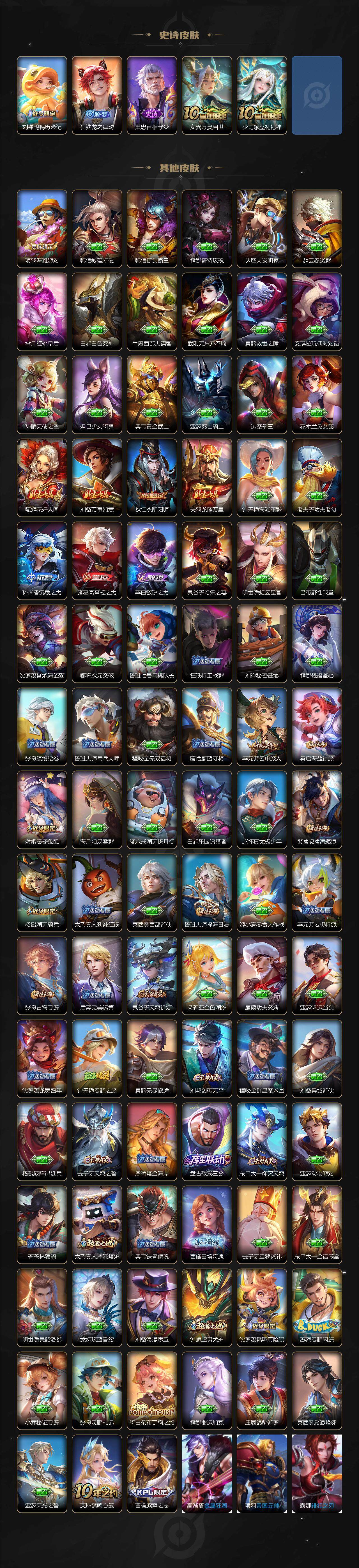 【史诗皮肤】:露娜紫霞仙子,赵云皇家上将,赵云未来纪元,貂蝉圣诞恋歌,甄姬冰雪圆舞曲,王昭君偶像歌手,狄仁杰魔术师,宫本武藏鬼剑武藏,孙尚香蔷薇恋人,孙尚香水果甜心,嬴政摇滚巨星,妲己魅力维加斯,妲己女仆咖啡,墨子金属风暴,曹操幽灵船长,吕布末日机甲,张飞乱世虎臣,兰陵王暗隐猎兽者,安琪拉心灵骇客,李元芳逐浪之夏,程咬金功夫厨神,白起星夜王子,阿轲节奏热浪,孙策猫狗日记,狄仁杰鹰眼统帅,杨戬天秀启明,澜赏金猎手,暃星界游侠,扁鹊奇幻香踪,蔡文姬电玩兔顽号,蒙犽百解令,暃埋骨钱,马可波罗星界特工,李白谪仙醉月,弈星万物之道,阿轲化蝶舞,刘禅鸭鸭历险记,狂铁龙之律动,黄忠百相守梦,女娲万灵启世,少司缘巫礼祀神