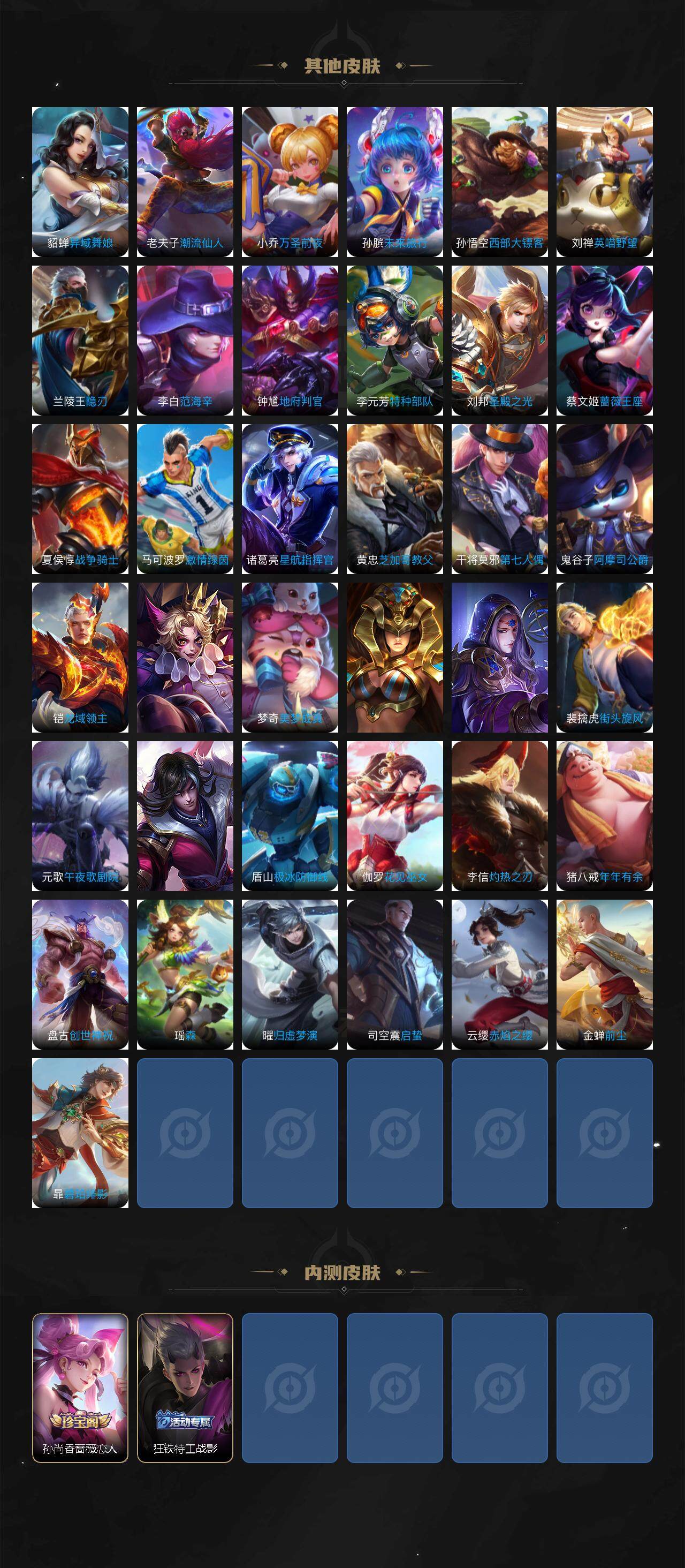 【其他皮肤】:项羽海滩派对,韩信教廷特使,韩信街头霸王,露娜哥特玫瑰,达摩大发明家,赵云忍炎影,芈月红桃皇后,白起白色死神,牛魔西部大镖客,武则天东方不败,扁鹊救世之瞳,安琪拉玩偶对对碰,孙膑天使之翼,妲己少女阿狸,典韦黄金武士,亚瑟死亡骑士,达摩拳王,花木兰兔女郎,甄姬花好人间,刘备万事如意,狄仁杰阴阳师,关羽龙腾万里,钟无艳海滩丽影,老夫子功夫老勺,孙尚香沉稳之力,诸葛亮掌控之力,李白敏锐之力,鬼谷子幻乐之宴,明世隐虹云星官,吕布野性能量,沈梦溪鲨炮海盗猫,哪吒次元突破,鲁班七号黑桃队长,狂