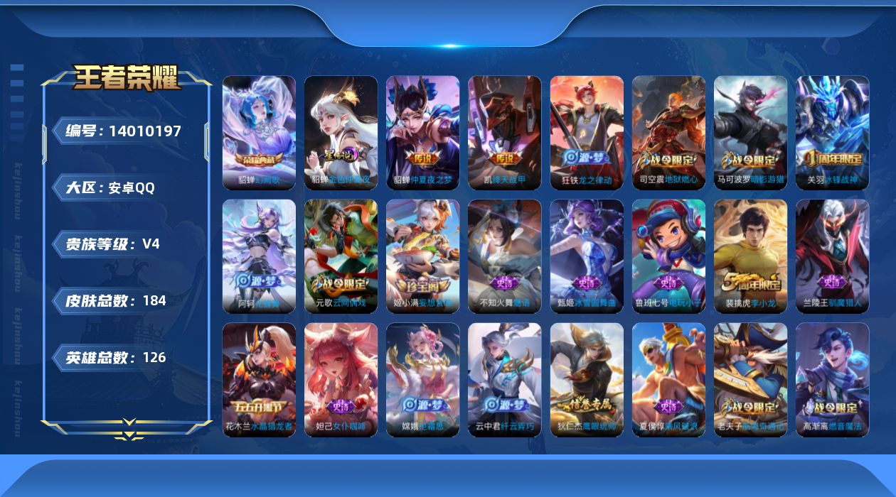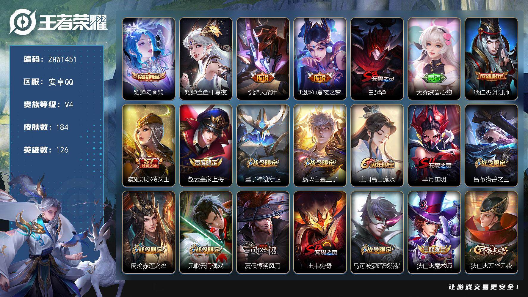 [14010197]可二次【店主推荐捡漏号!可直接换绑】:安卓Q-V7-永恒钻石III段位-126英雄-184皮肤-1典藏-1星元-2传说-46史诗 【荣耀典藏】:貂蝉幻阙歌 【传说皮肤】:铠绛天战甲,貂蝉仲夏夜之梦 【限定皮肤】:白起狰,大乔绒语心约,狄仁杰阴阳师,虞姬凯尔特女王,赵云皇家上将,墨子神迹守卫,嬴政白昼王子,庄周高山流水,芈月重明,吕布猎兽之王,周瑜赤莲之焰,元歌云间偶戏,夏侯惇朔风刀,典韦穷奇,马可波罗暗影游猎,狄仁杰魔术师,狄仁杰万华元夜,达摩沙漠行僧,项羽海滩派对,老夫子醍醐杖,老夫子航海奇遇记,关羽冰锋战神,程咬金演武夺筹,兰陵王驯魔猎人,兰陵王金庭之子,亚瑟潮玩骑士王,牛魔御旌,后羿圣弓游侠,李元芳云中旅人,钟馗驱傩正仪,杨玉环遇见飞天,女娲朔望之晖,干将莫邪真爱魔法,鬼谷子原初探秘者,苏烈千军破阵,弈星混沌棋,明世隐疑决卦,裴擒虎李小龙,裴擒虎擒涛扼浪,狂铁御狮,米莱狄御霄,云中君纤云弄巧,猪八戒西部大镖客,上官婉儿梁祝,嫦娥拒霜思,鲁班大师探海日志,桑启海盐诗旅,艾琳流音漫舞,司空震地狱燃心,阿古朵江河有灵,张良古海寻踪,蒙犽百解令,高渐离燃音魔法,妲己灵卜魔法,鬼谷子天穹祈灯,姬小满妄想食味,刘邦剑破天穹,程咬金群星魔术团,刘备异域游侠,周瑜熔金海岸 【赛季限定】:白起狰,芈月重明,夏侯惇朔风刀,典韦穷奇,狄仁杰万华元夜,达摩沙漠行僧,老夫子醍醐杖,程咬金演武夺筹,兰陵王金庭之子,张良古海寻踪,牛魔御旌,李元芳云中旅人,虞姬凯尔特女王,钟馗驱傩正仪,鬼谷子原初探秘者,苏烈千军破阵,弈星混沌棋,明世隐疑决卦,裴擒虎擒涛扼浪,狂铁御狮,米莱狄御霄,鲁班大师探海日志,桑启海盐诗旅,鬼谷子天穹祈灯,刘邦剑破天穹 【战令限定】:墨子神迹守卫,嬴政白昼王子,吕布猎兽之王,周瑜赤莲之焰,元歌云间偶戏,马可波罗暗影游猎,老夫子航海奇遇记,兰陵王驯魔猎人,艾琳流音漫舞,亚瑟潮玩骑士王,后羿圣弓游侠,女娲朔望之晖,干将莫邪真爱魔法,猪八戒西部大镖客,司空震地狱燃心,高渐离燃音魔法,妲己灵卜魔法 【史诗皮肤】:鲁班七号电玩小子,项羽苍穹之光,赵云皇家上将,貂蝉圣诞恋歌,甄姬冰雪圆舞曲,王昭君偶像歌手,狄仁杰魔术师,廉颇地狱岩魂,宫本武藏鬼剑武藏,孙尚香水果甜心,妲己魅力维加斯,妲己女仆咖啡,墨子龙骑士,墨子金属风暴,关羽冰锋战神,花木兰水晶猎龙者,夏侯惇乘风破浪,兰陵王暗隐