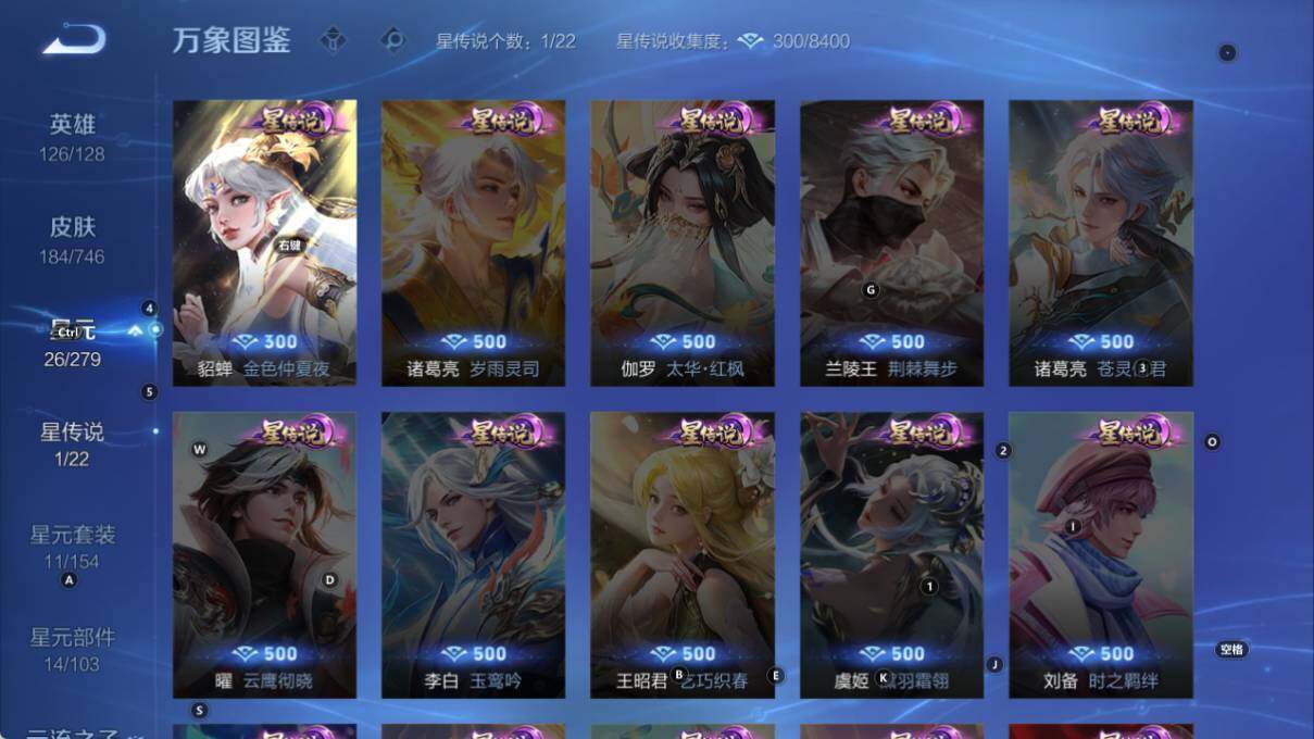 虞姬凯尔特女王,白起狰,芈月重明,典韦穷奇,狂铁御狮,米莱狄御霄,牛魔御旌,夏侯惇朔风刀,明世隐疑决卦,老夫子醍醐杖,鬼谷子原初探秘者,狄仁杰万华元夜,程咬金演武夺筹,钟馗驱傩正仪,苏烈千军破阵,吕布猎兽之王,嬴政白昼王子,女娲朔望之晖,马可波罗暗影游猎,元歌云间偶戏,弈星混沌棋,达摩沙漠行僧,兰陵王金庭之子,李元芳云中旅人,桑启海盐诗旅,裴擒虎擒涛扼浪,鲁班大师探海日志,张良古海寻踪