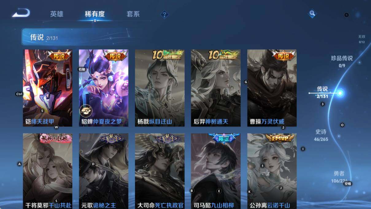 【赛季限定】:白起狰,芈月重明,夏侯惇朔风刀,典韦穷奇,狄仁杰万华元夜,达摩沙漠行僧,老夫子醍醐杖,程咬金演武夺筹,兰陵王金庭之子,张良古海寻踪,牛魔御旌,李元芳云中旅人,虞姬凯尔特女王,钟馗驱傩正仪,鬼谷子原初探秘者,苏烈千军破阵,弈星混沌棋,明世隐疑决卦,裴擒虎擒涛扼浪,狂铁御狮,米莱狄御霄,鲁班大师探海日志,桑启海盐诗旅,鬼谷子天穹祈灯,刘邦剑破天穹