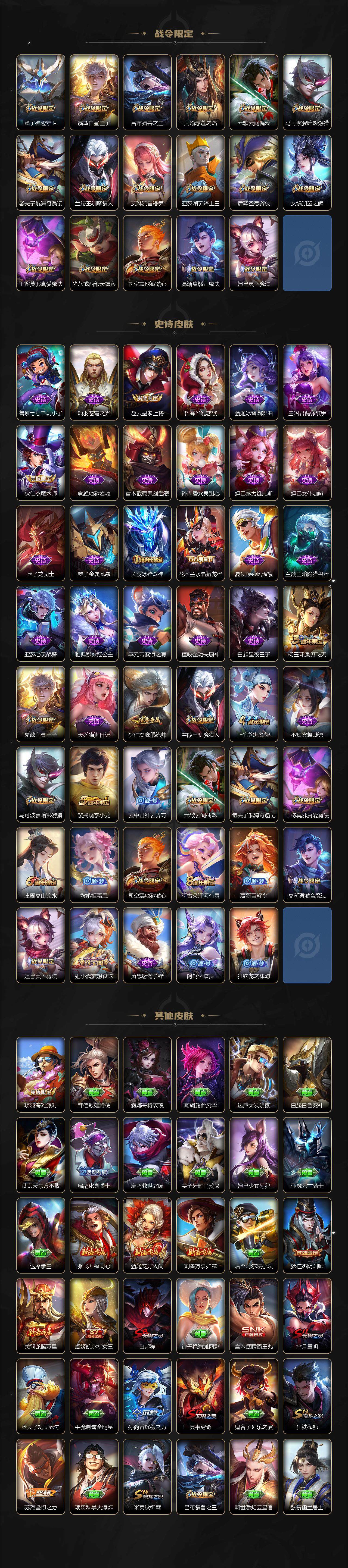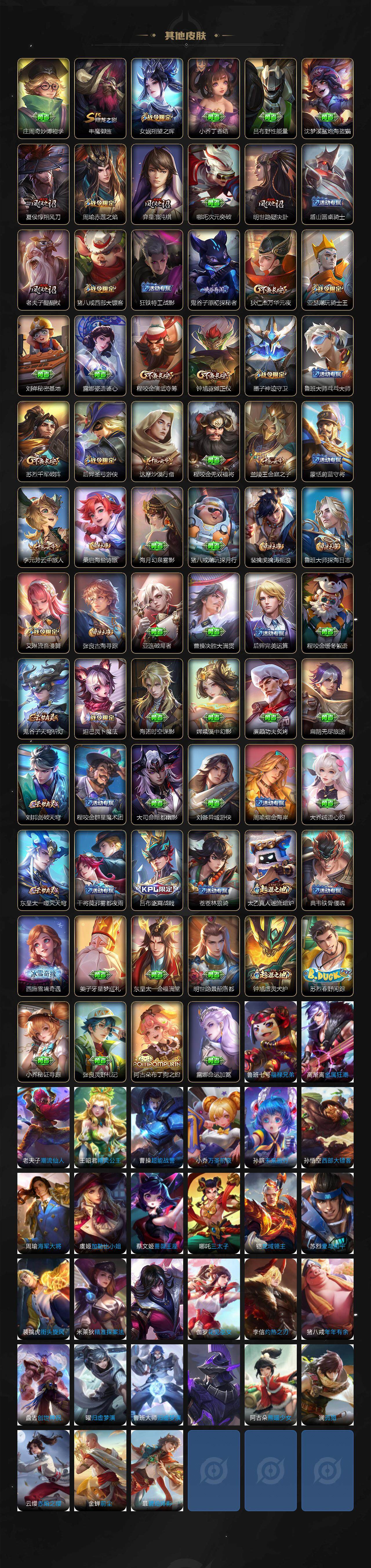 【限定皮肤】:白起狰,大乔绒语心约,狄仁杰阴阳师,虞姬凯尔特女王,赵云皇家上将,墨子神迹守卫,嬴政白昼王子,庄周高山流水,芈月重明,吕布猎兽之王,周瑜赤莲之焰,元歌云间偶戏,夏侯惇朔风刀,典韦穷奇,马可波罗暗影游猎,狄仁杰魔术师,狄仁杰万华元夜,达摩沙漠行僧,项羽海滩派对,老夫子醍醐杖,老夫子航海奇遇记,关羽冰锋战神,程咬金演武夺筹,兰陵王驯魔猎人,兰陵王金庭之子,亚瑟潮玩骑士王,牛魔御旌,后羿圣弓游侠,李元芳云中旅人,钟馗驱傩正仪,杨玉环遇见飞天,女娲朔望之晖,干将莫邪真爱魔法,鬼谷子原初探秘者,苏烈千军破阵,弈星混沌棋,明世隐疑决卦,裴擒虎李小龙,裴擒虎擒涛扼浪,狂铁御狮,米莱狄御霄,云中君纤云弄巧,猪八戒西部大镖客,上官婉儿梁祝,嫦娥拒霜思,鲁班大师探海日志,桑启海盐诗旅,艾琳流音漫舞,司空震地狱燃心,阿古朵江河有灵,张良古海寻踪,蒙犽百解令,高渐离燃音魔法,妲己灵卜魔法,鬼谷子天穹祈灯,姬小满妄想食味,刘邦剑破天穹,程咬金群星魔术团,刘备异域游侠,周瑜熔金海岸