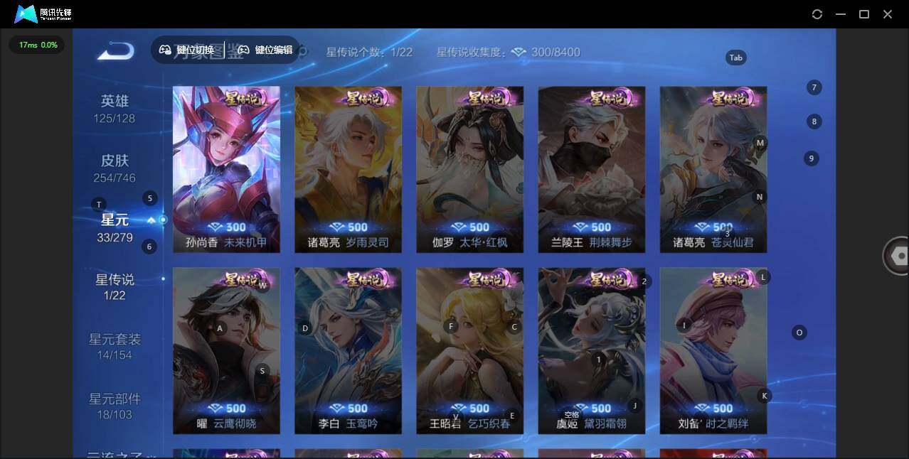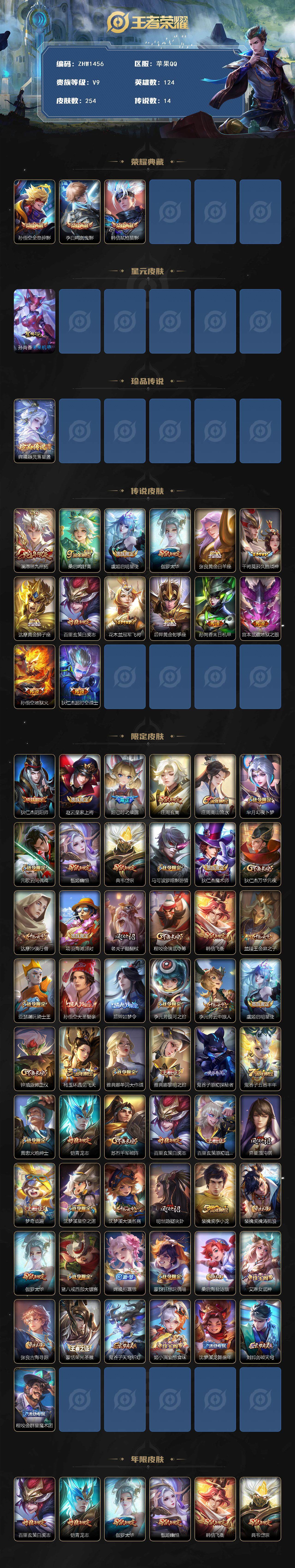 - [11602388]V7 1典藏 2珍品传说 6传说 121英雄 203皮肤 可修改实名 荣耀水晶:银白咏叹调(倪克斯侍卫) 珍品传说:酷洛米之心,黑崎一护 传说皮:地狱之眼,炽阳神光,乞巧织情 珍宝阁皮:蔷薇恋人 限定皮:愿照·九州拓(澜年限),愿照·山河定(司空震年限),逐霄战戟,鸣野蒿,梁祝,引擎之心 史诗皮:茶境仙,糖绘人间,鸭鸭历险记-刘禅,龙之律动,雪豹·霜爪,藏狐·褐绒,石田雨龙,百相守梦-百里守约,百相守梦-黄忠,埋骨钱,乘龙·聚宝船(安琪拉年限),炽弈燎原,化蝶舞,破空之剑,电玩小子(小书包),白龙吟,黄金分割率,特工魅影,千年之狐,江河有灵,高渐离燃音魔法,百解令(蒙犽),冰冠公主,青蛇,偶像歌手,电玩·爆裂旋风,末日机甲-吕布,猫狗日记-孙策,猫狗日记-大乔,时之恋人-孙尚香,乱世虎臣,节奏热浪,女仆咖啡,水果甜心,绅士熊喵,星夜王子,心灵骇客,暗隐猎兽者,幽灵船长,鬼剑武藏,心灵战警,舞动绿茵,纤云弄巧,拒霜思,缤纷独角兽,乘风破浪,逐浪之夏,水晶猎龙者,箭羽风息,金属风暴,圣诞恋歌,鹰眼统帅,魅力维加斯,未来纪元-赵云