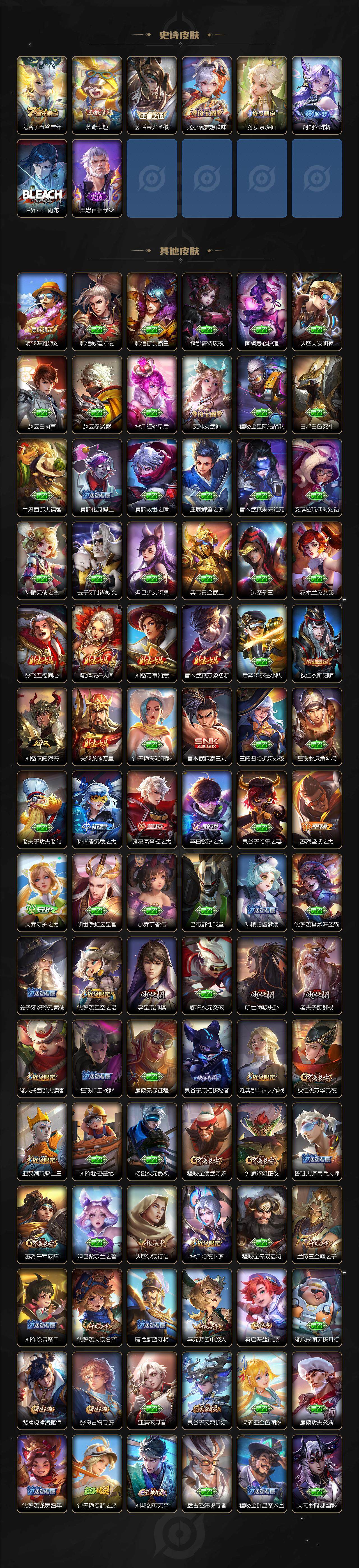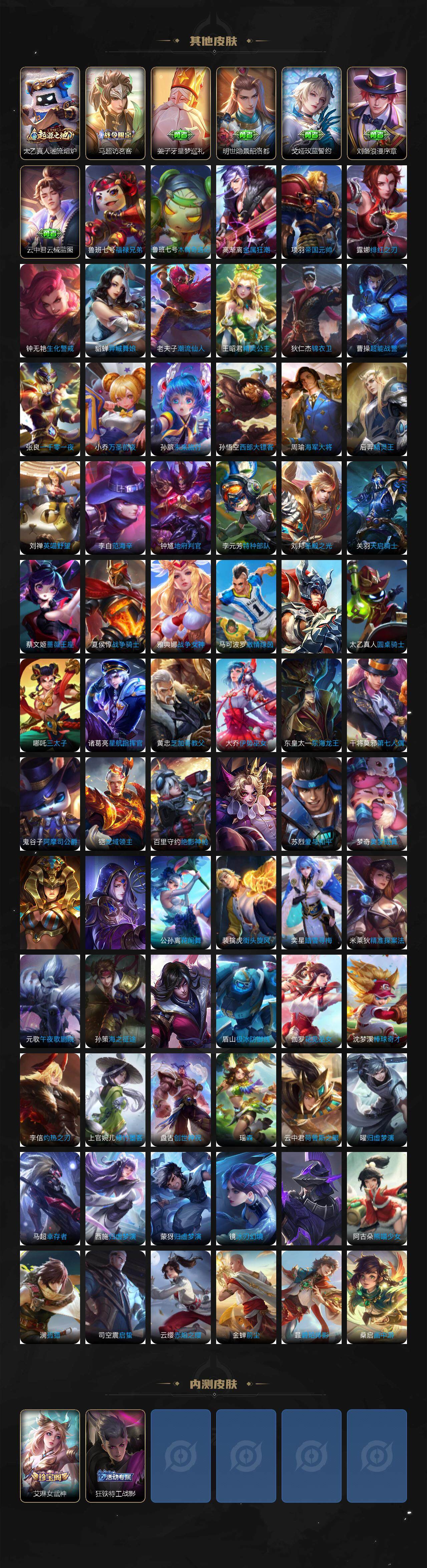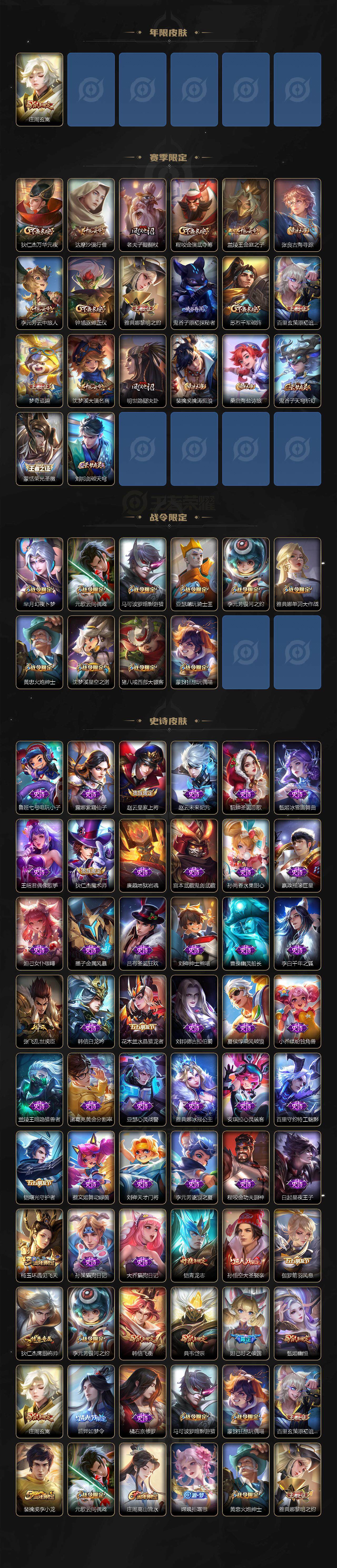 【限定皮肤】:狄仁杰阴阳师,赵云皇家上将,妲己时之彼端,庄周玄嵩,庄周高山流水,芈月幻夜卜梦,元歌云间偶戏,甄姬幽恒,典韦岱宗,马可波罗暗影游猎,狄仁杰魔术师,狄仁杰万华元夜,达摩沙漠行僧,项羽海滩派对,老夫子醍醐杖,程咬金演武夺筹,韩信飞衡,兰陵王金庭之子,亚瑟潮玩骑士王,孙悟空大圣娶亲,后羿如梦令,李元芳银河之约,李元芳云中旅人,虞姬启明星使,钟馗驱傩正仪,杨玉环遇见飞天,雅典娜单词大作战,雅典娜黎明之约,鬼谷子原初探秘者,鬼谷子五谷丰年,黄忠火炮绅士,铠青龙志,苏烈千军破阵,百里玄策白虎志,百里玄策原初追逐者,弈星混沌棋,梦奇顽趣,沈梦溪星空之诺,沈梦溪大漠名商,明世隐疑决卦,裴擒虎李小龙,裴擒虎擒涛扼浪,伽罗太华,猪八戒西部大镖客,嫦娥拒霜思,蒙犽狂想玩偶喵,桑启海盐诗旅,艾琳女武神,张良古海寻踪,蒙恬荣光圣徽,鬼谷子天穹祈灯,姬小满妄想食味,沈梦溪龙舞盛年,刘邦剑破天穹,程咬金群星魔术团