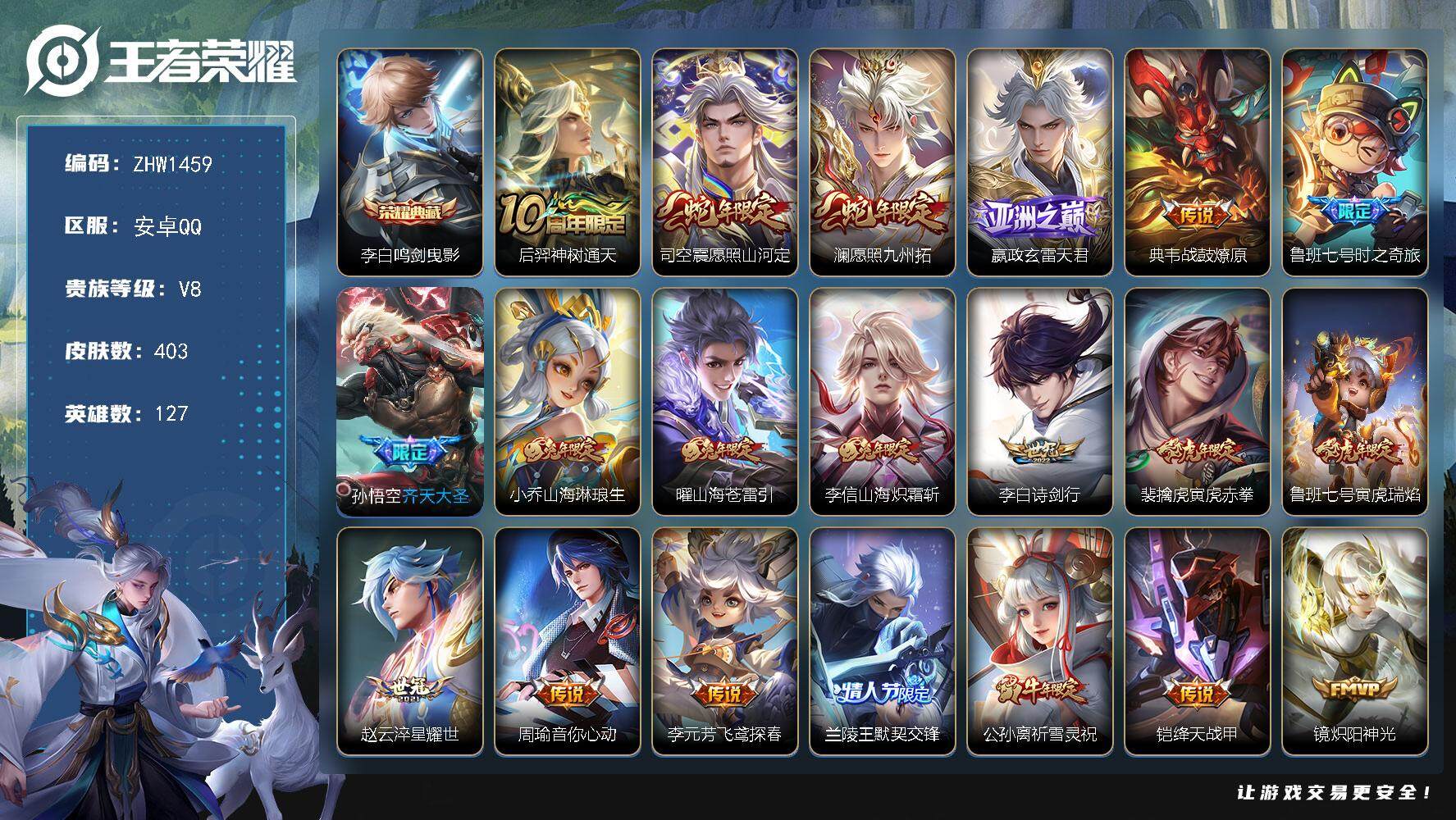 [14010103]可二次,【店主推荐捡漏号!可直接换绑】安卓Q-V8-最强王者段位-127英雄-403皮肤-1典藏-说-31传说-123史诗