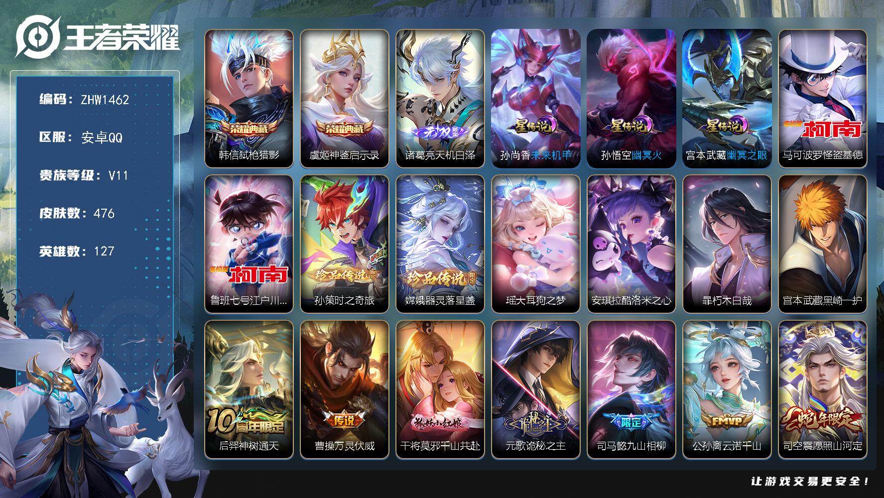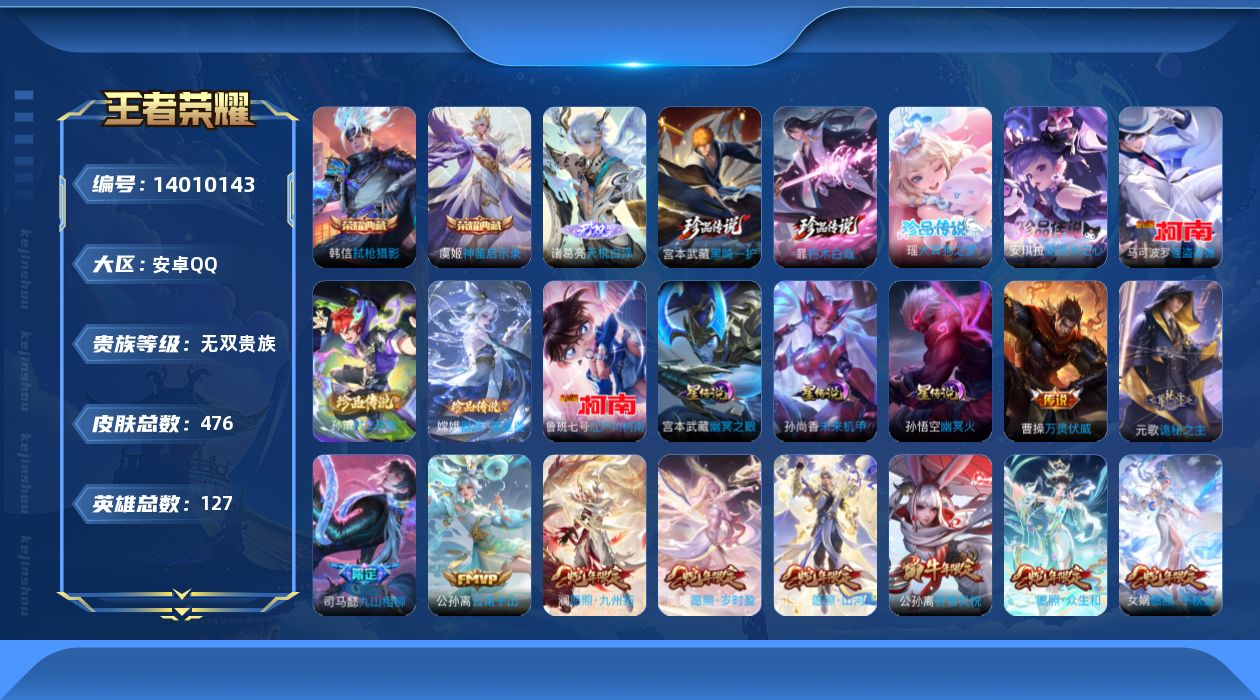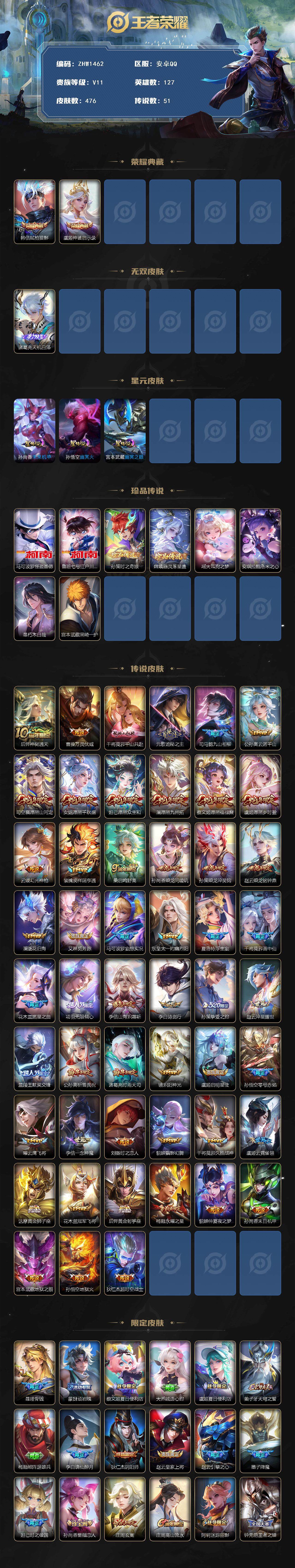 [14010143]【店主推荐捡漏号!可直接换绑】,背包有颗未使用的荣耀水晶,安卓Q-V11-最强王者段位-127英雄-476皮肤-2典藏-3星传说-1无双-8珍品传说-51传说-148史诗 【英雄全皮】:刘禅全皮,元歌全皮,达摩全皮,司马懿全皮,刘邦全皮,孙权全皮,钟馗全皮,鬼谷子全皮,李信全皮,嫦娥全皮,蒙恬全皮,阿古朵全皮,夏洛特全皮,司空震全皮,暃全皮,戈娅全皮,空空儿全皮,影全皮,海诺全皮,少司缘全皮 【荣耀典藏】:韩信弑枪猎影,虞姬神鉴启示录 【无双皮肤】:诸葛亮天机白泽 【珍品传说】:马可波罗怪盗基德,鲁班七号江户川柯南,孙策时之奇旅,嫦娥器灵落星盏,瑶大耳狗之梦,安琪拉酷洛米之心,暃朽木白哉,宫本武藏黑崎一护 【传说皮肤】:后羿神树通天,曹操万灵伏威,干将莫邪千山共赴,元歌诡秘之主,司马懿九山相柳,公孙离云诺千山,司空震愿照山河定,女娲愿照千秋盛,妲己愿照众生和,澜愿照九州拓,蔡文姬愿照福禄聚,虞姬愿照岁时盈,云缨幻光神枪,裴擒虎祥瑞亨通,桑启鸣野蒿,孙尚香乘龙问璇玑,孙策乘龙淬吴钩,赵云乘龙铭钟鼎,澜逐花归海,艾琳觅芳踪,马可波罗妄想实况,东皇太一灼幽烈阳,夏洛特浮生妄,干将莫邪画中仙,花木兰燃星之曲,项羽无限倾心,李信山海炽霜斩,李白诗剑行,孙策挚爱之约,赵云淬星耀世,兰陵王默契交锋,公孙离祈雪灵祝,诸葛亮时雨天司,镜炽阳神光,虞姬启明星使,孙悟空零号赤焰,曜云鹰飞将,李信一念神魔,刘备时之恋人,貂蝉猫影幻舞,干将莫邪久胜战神,虞姬云霓雀翎,达摩黄金狮子座,花木兰冠军飞将,后羿黄金射手座,杨戬永曜之星,貂蝉仲夏夜之梦,孙尚香末日机甲,宫本武藏地狱之眼,孙悟空地狱火,狄仁杰超时空战士 【限定皮肤】:暃埋骨钱,蒙犽顽岩魄,蔡文姬夏日便利店,大乔绒语心约,虞姬夏日便利店,姜子牙天穹之誓,杨戬破阵退雄兵,李白谪仙醉月,狄仁杰阴阳师,赵云皇家上将,赵云引擎之心,墨子降魔,妲己时之彼端,孙尚香蔷薇恋人,庄周玄嵩,庄周高山流水,阿轲迷踪丽影,钟无艳王者之锤,钟无艳超时空战士,扁鹊奇幻香踪,芈月白晶晶,芈月幻夜卜梦,吕布猎兽之王,吕布御风骁将,周瑜真爱至上,周瑜赤莲之焰,元歌云间偶戏,元歌无心,甄姬幽恒,甄姬落雪兰心,典韦岱宗,马可波罗暗影游猎,马可波罗山海玄木吟,马可波罗妄想实况,狄仁杰魔术师,狄仁杰万华元夜,达摩星际陆战队,达摩沙漠行僧,项羽海滩派对,项羽霸王别姬,项羽无限倾