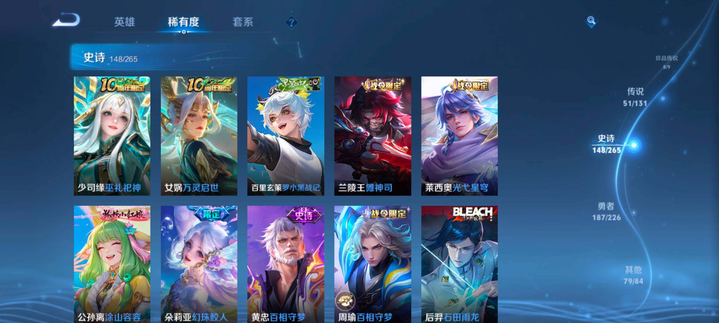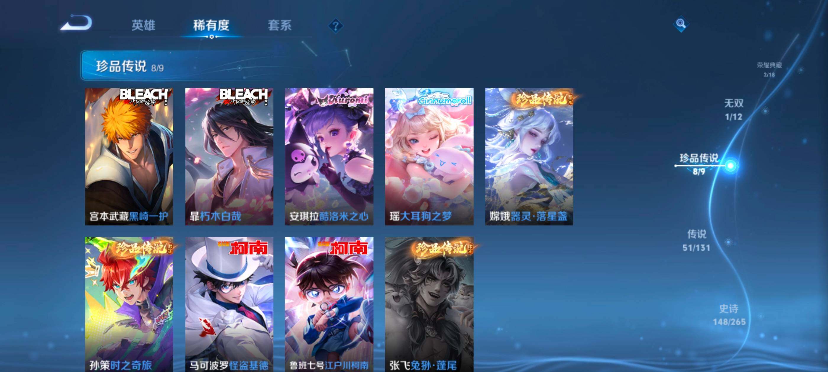 【珍品传说】:马可波罗怪盗基德,鲁班七号江户川柯南,孙策时之奇旅,嫦娥器灵落星盏,瑶大耳狗之梦,安琪拉酷洛米之心,暃朽木白哉,宫本武藏黑崎一护