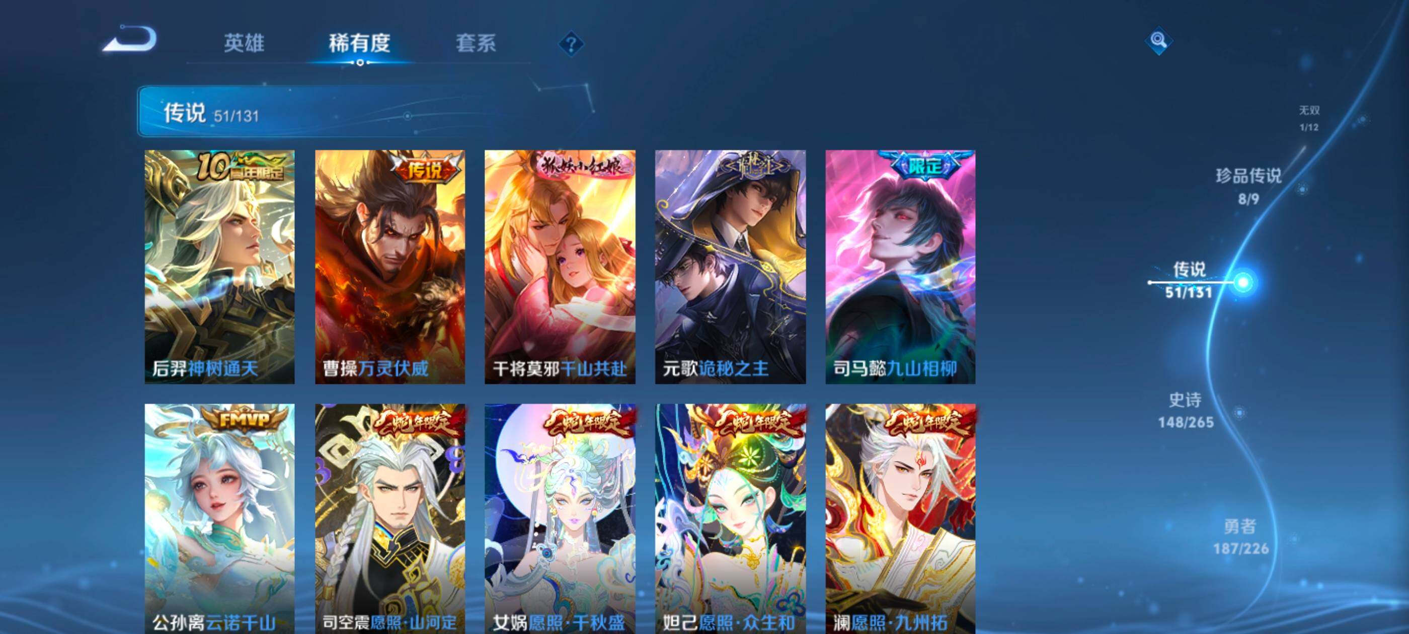 【传说皮肤】:后羿神树通天,曹操万灵伏威,干将莫邪千山共赴,元歌诡秘之主,司马懿九山相柳,公孙离云诺千山,司空震愿照山河定,女娲愿照千秋盛,妲己愿照众生和,澜愿照九州拓,蔡文姬愿照福禄聚,虞姬愿照岁时盈,云缨幻光神枪,裴擒虎祥瑞亨通,桑启鸣野蒿,孙尚香乘龙问璇玑,孙策乘龙淬吴钩,赵云乘龙铭钟鼎,澜逐花归海,艾琳觅芳踪,马可波罗妄想实况,东皇太一灼幽烈阳,夏洛特浮生妄,干将莫邪画中仙,花木兰燃星之曲,项羽无限倾心,李信山海炽霜斩,李白诗剑行,孙策挚爱之约,赵云淬星耀世,兰陵王默契交锋,公孙离祈雪灵祝,诸葛亮时雨天司,镜炽阳神光,虞姬启明星使,孙悟空零号赤焰,曜云鹰飞将,李信一念神魔,刘备时之恋人,貂蝉猫影幻舞,干将莫邪久胜战神,虞姬云霓雀翎,达摩黄金狮子座,花木兰冠军飞将,后羿黄金射手座,杨戬永曜之星,貂蝉仲夏夜之梦,孙尚香末日机甲,宫本武藏地狱之眼,孙悟空地狱火,狄仁杰超时空战士