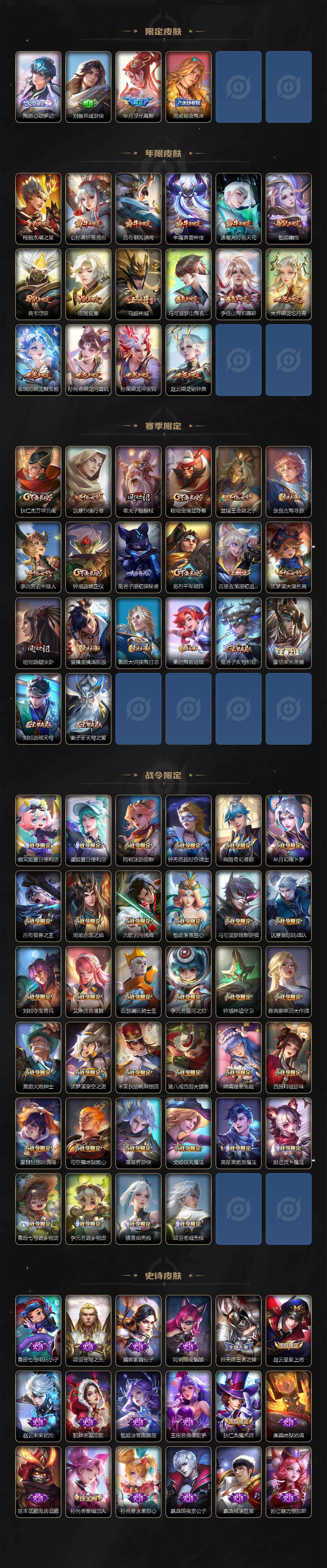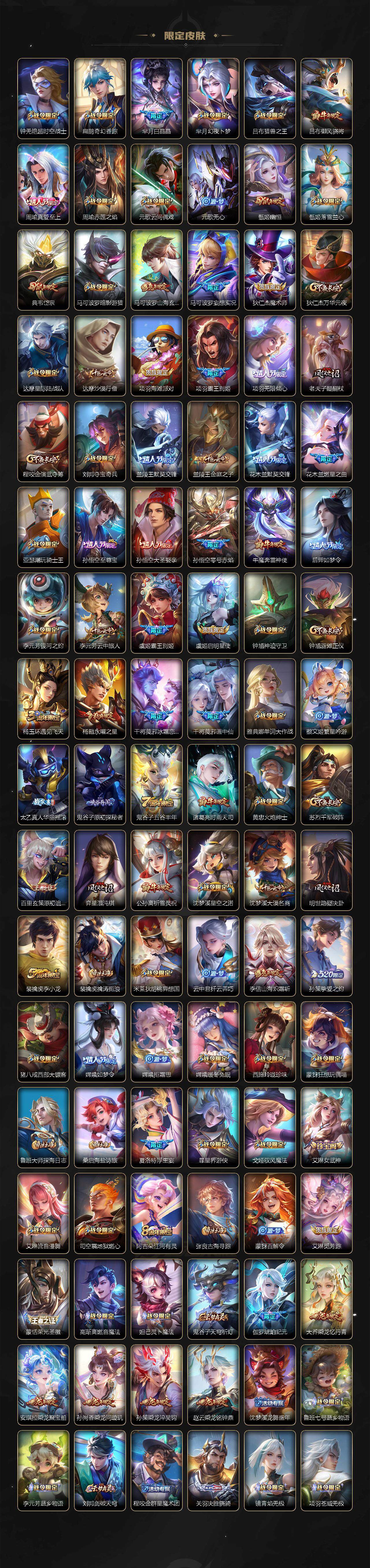 【限定皮肤】:暃埋骨钱,蒙犽顽岩魄,蔡文姬夏日便利店,大乔绒语心约,虞姬夏日便利店,姜子牙天穹之誓,杨戬破阵退雄兵,李白谪仙醉月,狄仁杰阴阳师,赵云皇家上将,赵云引擎之心,墨子降魔,妲己时之彼端,孙尚香蔷薇恋人,庄周玄嵩,庄周高山流水,阿轲迷踪丽影,钟无艳王者之锤,钟无艳超时空战士,扁鹊奇幻香踪,芈月白晶晶,芈月幻夜卜梦,吕布猎兽之王,吕布御风骁将,周瑜真爱至上,周瑜赤莲之焰,元歌云间偶戏,元歌无心,甄姬幽恒,甄姬落雪兰心,典韦岱宗,马可波罗暗影游猎,马可波罗山海玄木吟,马可波罗妄想实况,狄仁杰魔术师,狄仁杰万华元夜,达摩星际陆战队,达摩沙漠行僧,项羽海滩派对,项羽霸王别姬,项羽无限倾