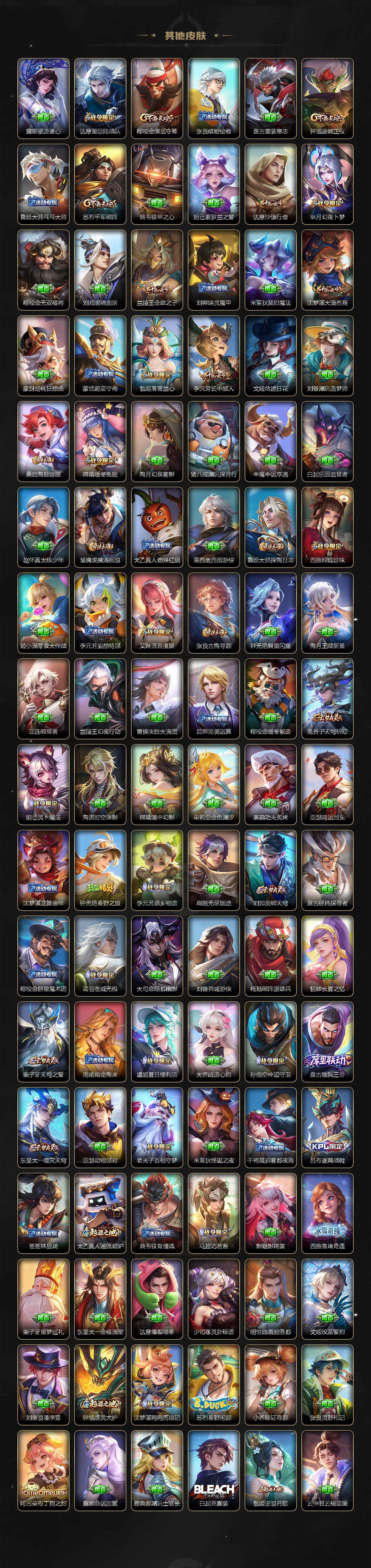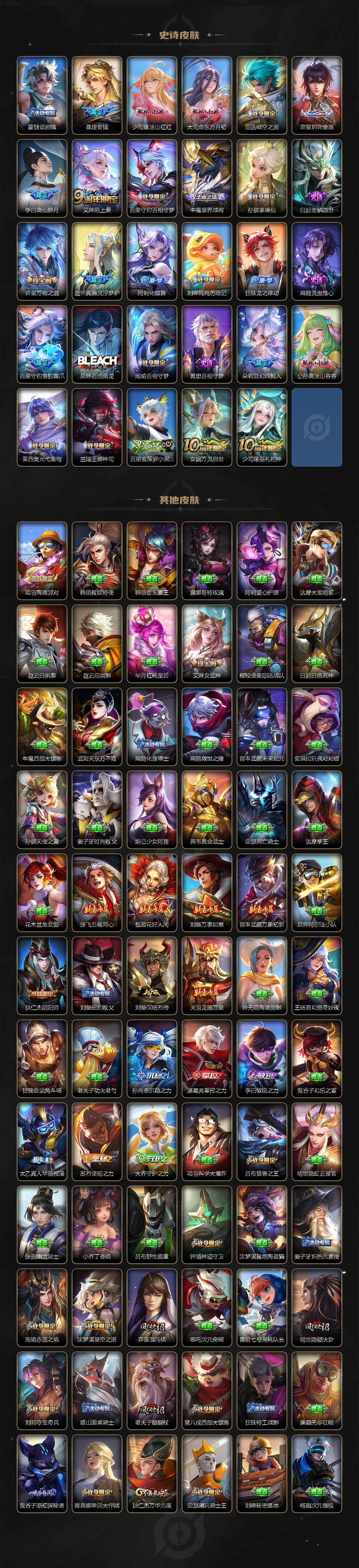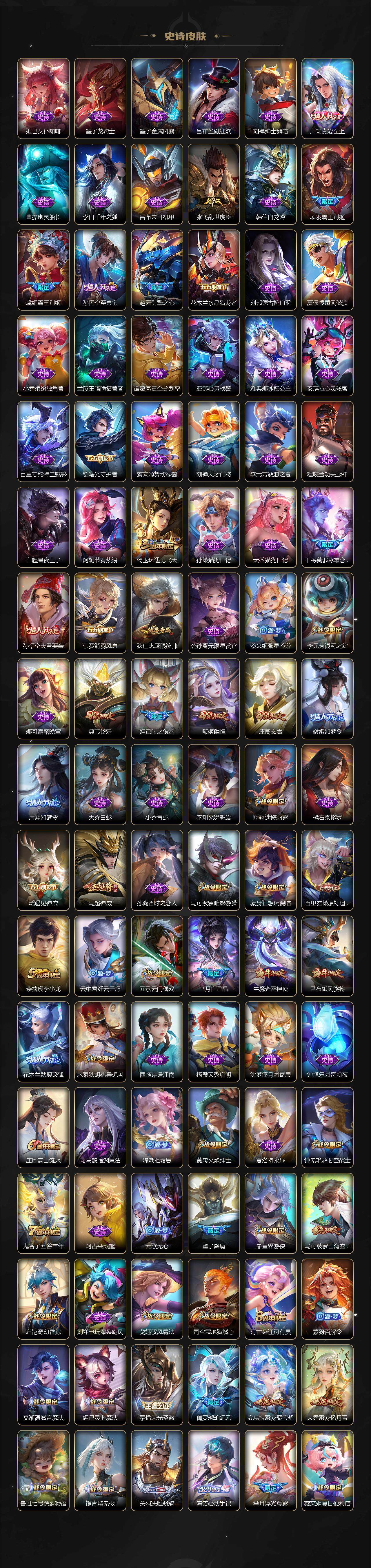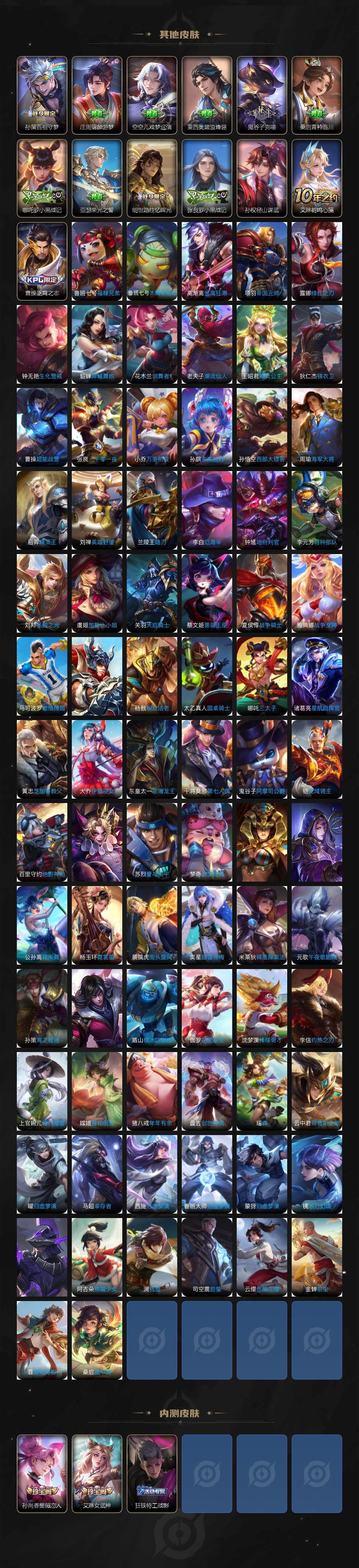 小乔青蛇,大乔白蛇,瑶遇见神鹿,娜可露露晚萤,伽罗箭羽风息,李元芳逐浪之夏,不知火舞魅语,公孙离无限星赏官,大乔猫狗日记,孙策猫狗日记,阿轲节奏热浪,露娜紫霞仙子,诸葛亮黄金分割率,王昭君偶像歌手,韩信白龙吟,项羽苍穹之光,孙尚香时之恋人,阿轲暗夜猫娘,雅典娜冰冠公主,吕布末日机甲,鲁班七号电玩小子,橘右京修罗,墨子龙骑士,嬴政摇滚巨星,刘禅绅士熊喵,刘禅天才门将,白起星夜王子,安琪拉心灵骇客,程咬金功夫厨神,刘邦德古拉伯爵,兰陵王暗隐猎兽者,曹操幽灵船长,宫本武藏鬼剑武藏,司马懿暗渊魔法,亚瑟心灵战警,钟馗乐园奇幻夜,杨戬天秀·启明,蔡文姬舞动绿茵,廉颇地狱岩魂,西施诗语江南,小乔缤纷独角兽,夏侯惇乘风破浪,花木兰水晶猎龙者,铠曙光守护者,墨子金属风暴,百里玄策原初追逐者,吕布圣诞狂欢,貂蝉圣诞恋歌,百里守约特工魅影,嬴政暗夜贵公子,嫦娥拒霜思,李白千年之狐,夏洛特永昼,阿古朵顽趣,刘禅电玩·爆裂旋风,蒙犽百解令,高渐离燃音魔法,伽罗琥珀纪元,大乔乘龙·忆丹青,安琪拉乘龙·聚宝船,关羽决胜骁骑,海诺心动手记,李白谪仙醉月,白起苍鳞隐世,赵怀真器灵·浮梦炉