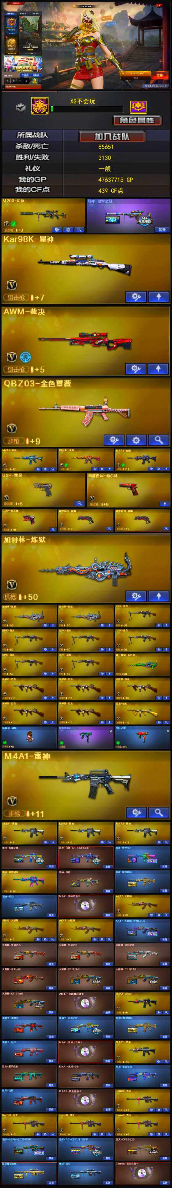 【皮肤】:幻神-冠军之幻,雷神-荣耀之魄,雷神-星空,雷神-虎将,雷神-耀金皮肤,雷神-传奇N9,火麒麟-华夏之心*2,AK47-火麒麟-传奇EVEN,火麒麟-轻羽皮肤,火麒麟-平天大圣,毁灭耀金皮肤,毁灭-星空,毁灭-CFS2020,毁灭-BEAN-2020MVP,黑龙-能量核心,黑龙-暗月,M4A1-黑龙-361,黑龙-墨子皮肤,黑骑士-暗月,黑骑士耀金皮肤,黑骑士-冠军之势,黑骑士-地狱火,无影-霓裳皮肤,烈火-动感闪耀 皮肤,AK47-B-常胜将军-曹操*2,AK47-B-常胜将军-孙权,天龙-能量核心,AWM-天龙-传奇70KG,极光-能量核心,修罗-能量核心,修罗耀金皮肤,修罗-星空,屠龙-荣耀之锋,龙啸-冠军之啸