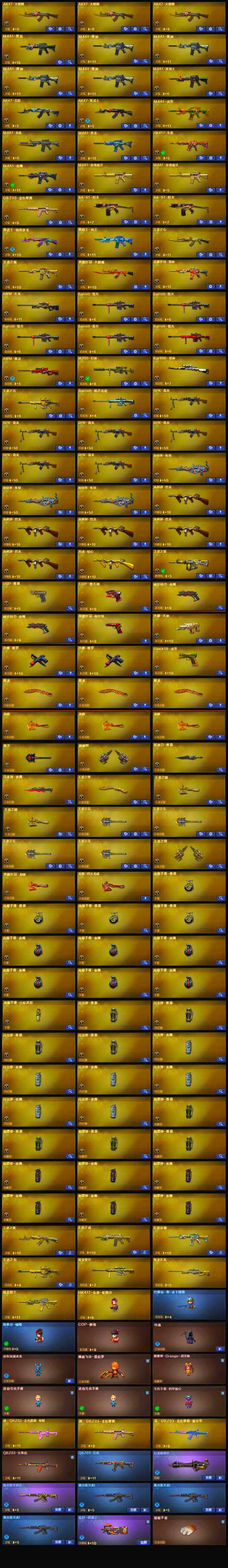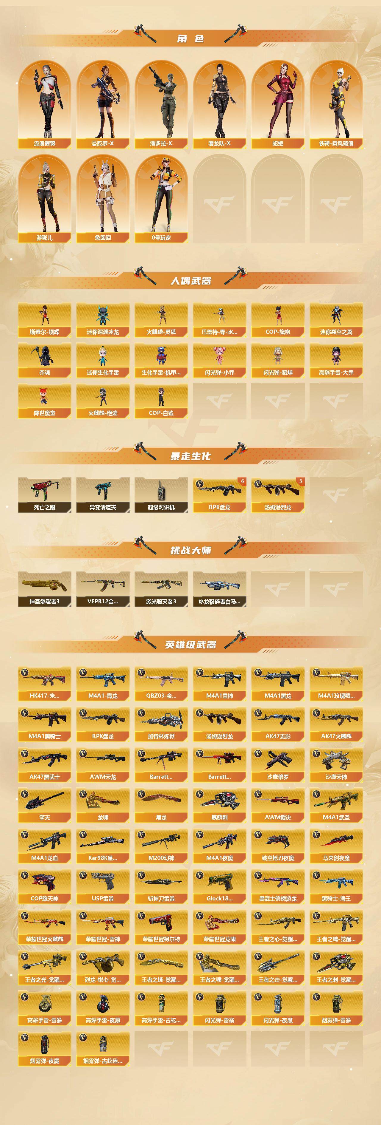 【人偶武器】:火麒麟-绝迹,COP-白鲨,火麒麟-灵狐,斯泰尔-蝴蝶,巴雷特-零-水下丽影,COP-旗袍,迷你深渊冰龙,迷你裂空之翼,夺魂,迷你生化手雷*2,生化手雷-机甲核心,闪光弹-小乔,闪光弹-貂蝉,高爆手雷-大乔,降世魔童