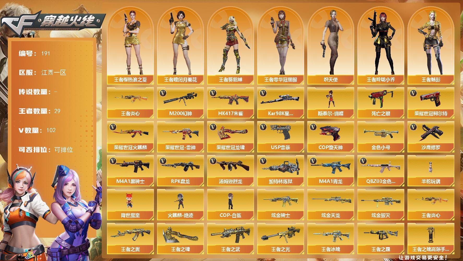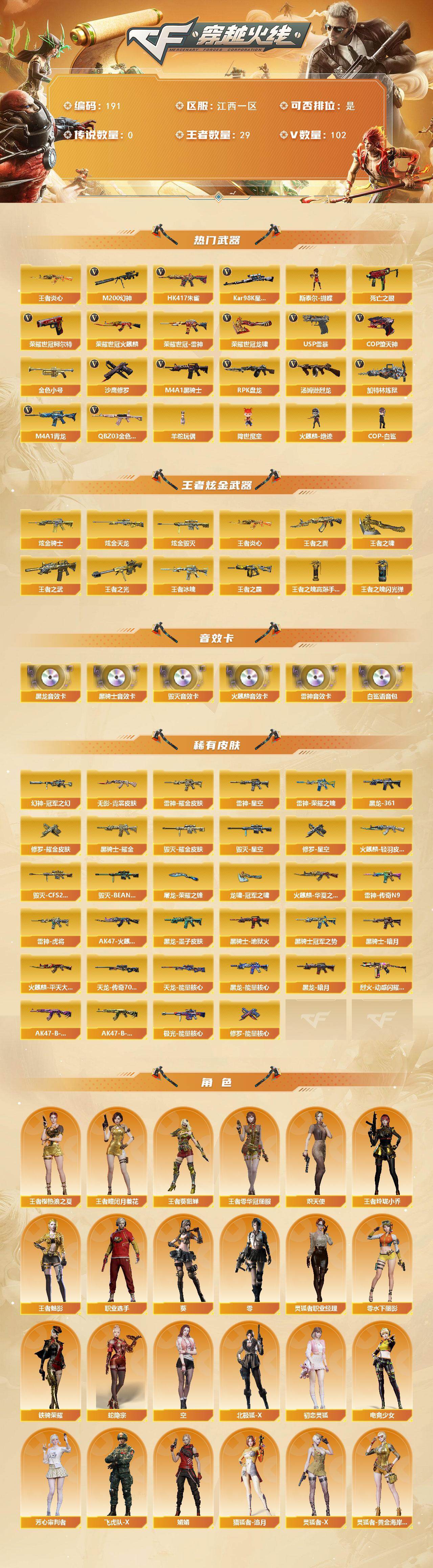 [14010201]江西一区-102V-29王者-3炫金 【热门武器】:QBZ03-金色蔷薇,HK417-朱雀,M4A1-青龙,M200-幻神,死亡之眼,荣耀世冠-火麒麟,荣耀世冠-雷神,荣耀世冠-柯尔特,王者炎心,Kar98K-星神,金色小号,M4A1-黑骑士,汤姆逊-烈龙*5,RPK-盘龙*6,加特林-炼狱*3,斯泰尔-蝴蝶,羊驼玩偶,降世魔童,火麒麟-绝迹,COP-白鲨,USP-雷暴,COP-堕天神,沙鹰-修罗*2,荣耀世冠-龙啸 【王者炫金武器】:王者冰魄,王者炎心,王者之翼,王者之武,王者之光,王者之霆,王者之啸*2,炫金骑士,炫金毁灭,炫金天龙,王者之魄高爆手雷,王者之魄闪光弹 【音效卡】:AK47-火麒麟音效卡,M4A1-雷神音效卡,M4A1-黑龙音效卡,M4A1-黑骑士音效卡,Barrett-毁灭音效卡,白鲨语音包 【皮肤】:幻神-冠军之幻,雷神-荣耀之魄,雷神-星空,雷神-虎将,雷神-耀金皮肤,雷神-传奇N9,火麒麟-华夏之心*2,AK47-火麒麟-传奇EVEN,火麒麟-轻羽皮肤,火麒麟-平天大圣,毁灭耀金皮肤,毁灭-星空,毁灭-CFS2020,毁灭-BEAN-2020MVP,黑龙-能量核心,黑龙-暗月,M4A1-黑龙-361,黑龙-墨子皮肤,黑骑士-暗月,黑骑士耀金皮肤,黑骑士-冠军之势,黑骑士-地狱火,无影-霓裳皮肤,烈火-动感闪耀 皮肤,AK47-B-常胜将军-曹操*2,AK47-B-常胜将军-孙权,天龙-能量核心,AWM-天龙-传奇70KG,极光-能量核心,修罗-能量核心,修罗耀金皮肤,修罗-星空,屠龙-荣耀之锋,龙啸-冠军之啸 【角色】:零,葵,王者-瞳-闭月羞花,王者零-华冠丽服,王者樱-热浪之夏,王者-葵-貂蝉,王者-魅影,王者玲珑-小乔,蛇隐宗,炽天使,空,北极狐-X,初恋灵狐,电竞少女,芳心审判者,飞虎队-X,娟娟,猎狐者-追月,0号玩家,零-水下丽影,灵狐者-X,灵狐者-黄金海岸,灵狐者-职业经理,流浪蔷薇,曼陀罗-X,潘多拉-X,潜龙队-X,蛇姬,铁骑-乘风破浪,铁骑荣耀,兔囡囡,游珑儿,职业选手 【人偶武器】:火麒麟-绝迹,COP-白鲨,火麒麟-灵狐,斯泰尔-蝴蝶,巴雷特-零-水下丽影,COP-旗袍,迷你深渊冰龙,迷你裂空之翼,夺魂,迷你生化手雷*2,生化手雷-机甲核心,闪光弹-小乔,闪光弹-貂蝉,高爆手雷-大乔,降世魔童 【暴走生化】:异变
