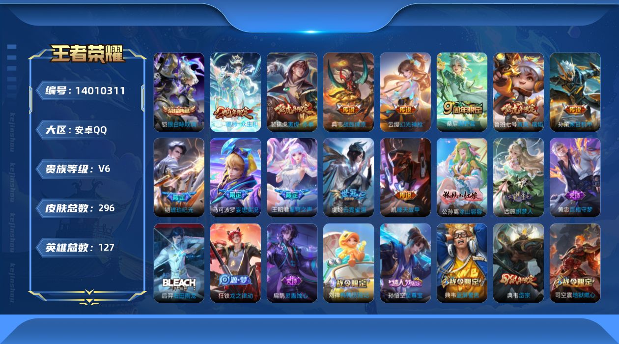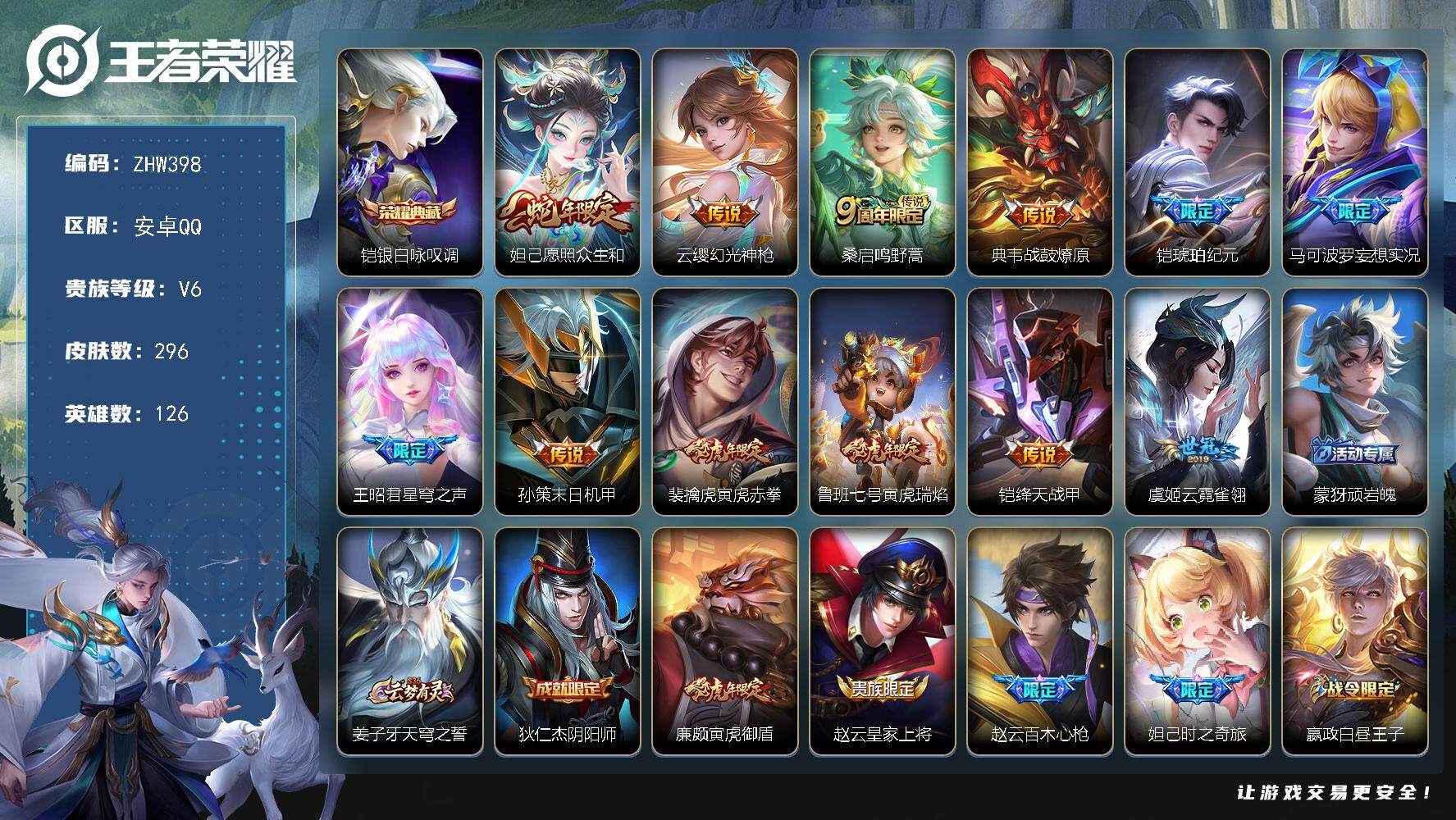 [14010311]可二次【店主推荐捡漏号!可直接换绑】安卓Q-V6-最强王者段位-126英雄-296皮肤-1典藏-12传说-110史诗