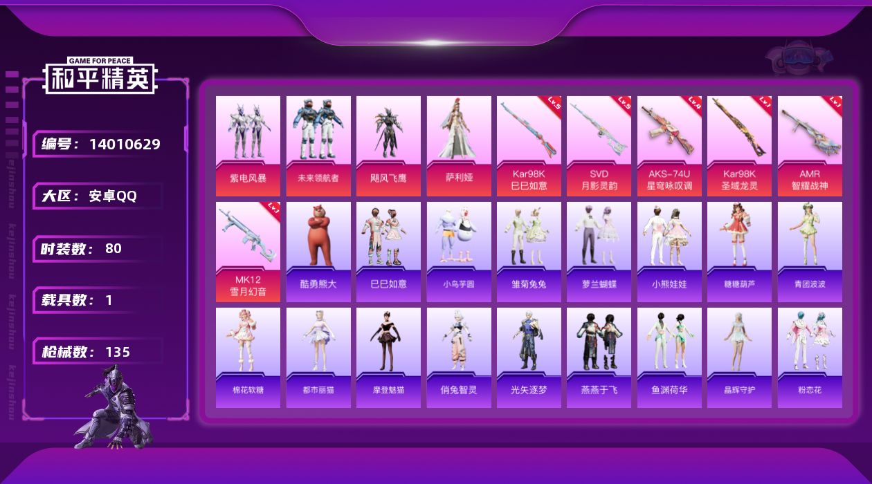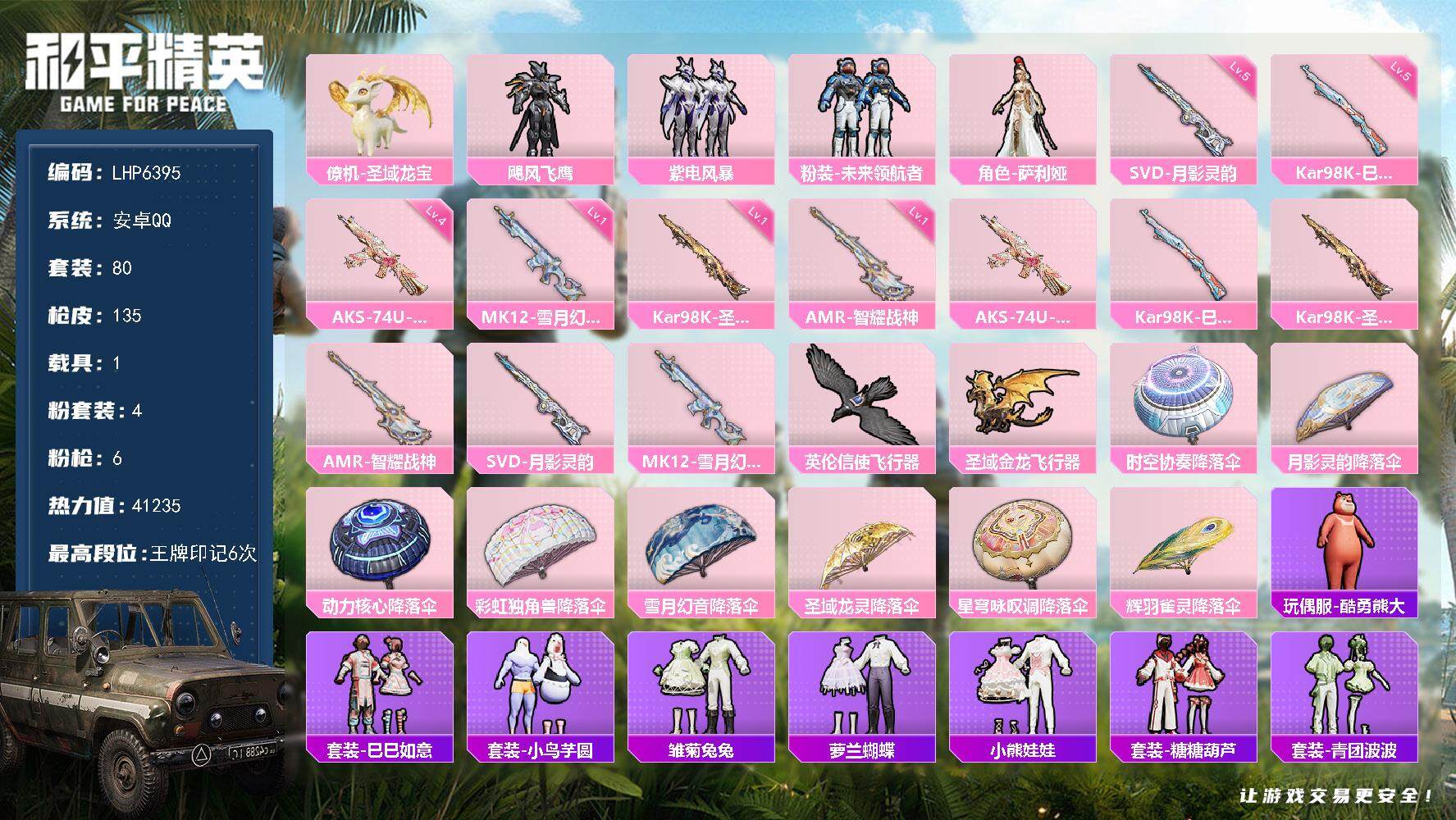 [14010629]可二次【店主推荐捡漏号!可直接换绑】安卓 手Q-4粉装-6特效枪-1载具-3粉色飞行器-4.1w热力值-6王牌印记-80套装-135枪皮【粉色载具】:僚机-圣域龙宝【粉色套装】:粉装-飓风飞鹰,粉装-紫电风暴,粉装-未来领航者,角色-萨利娅【粉色枪皮等级】:AKS-74U-星穹咏叹调(四级),Kar98K-巳巳如意(五级),Kar98K-圣域龙灵(一级),AMR-智耀战神(一级),SVD-月影灵韵(五级),MK12-雪月幻音(一级)【粉色飞行器】:英伦信使飞行器,圣域金龙飞行器