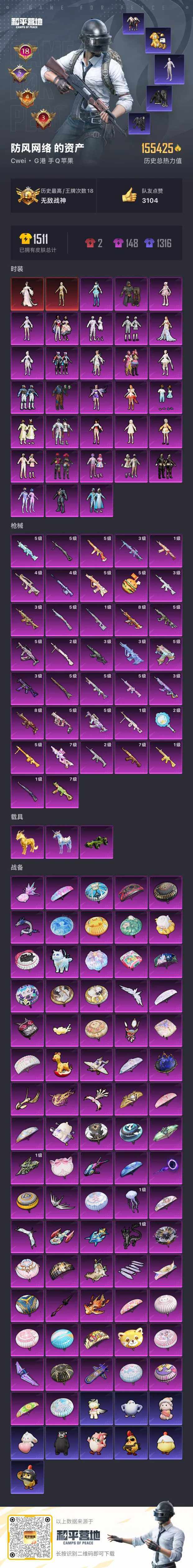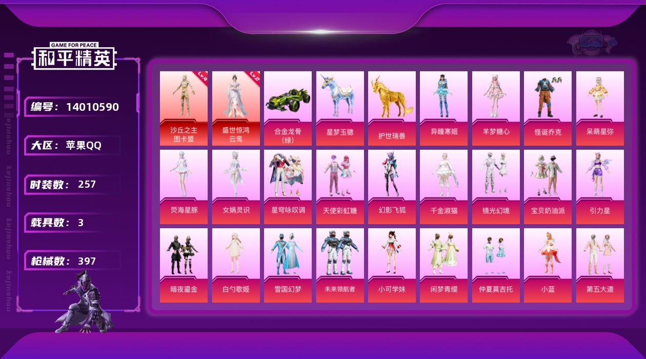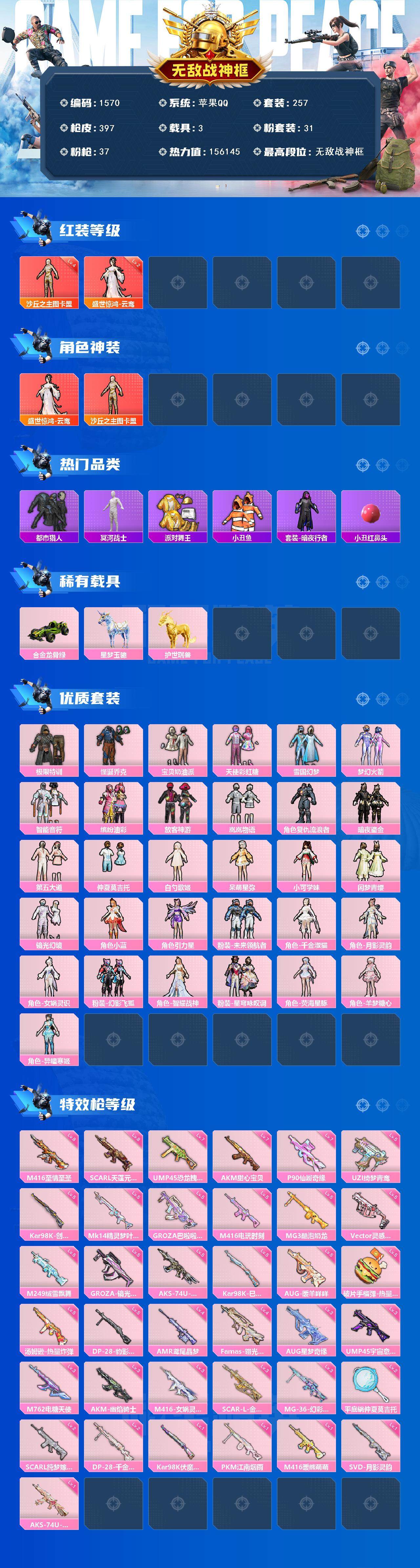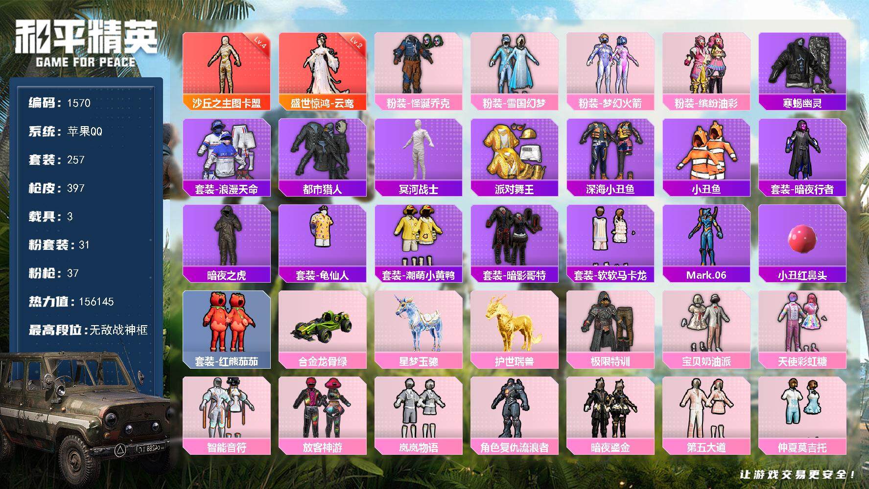 [14010590]苹果 手Q-无敌战神框-2神装-31粉装-37特效枪-3载具-27粉色飞行器-156145热力值-18王牌印记-257套装-397枪皮