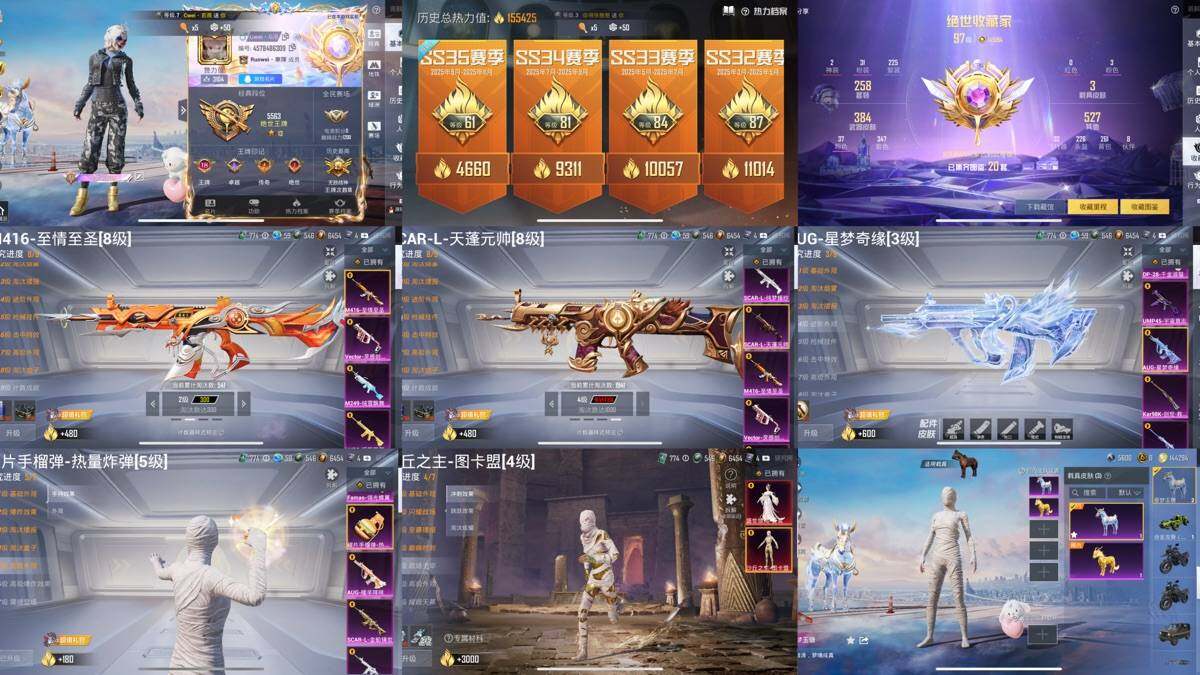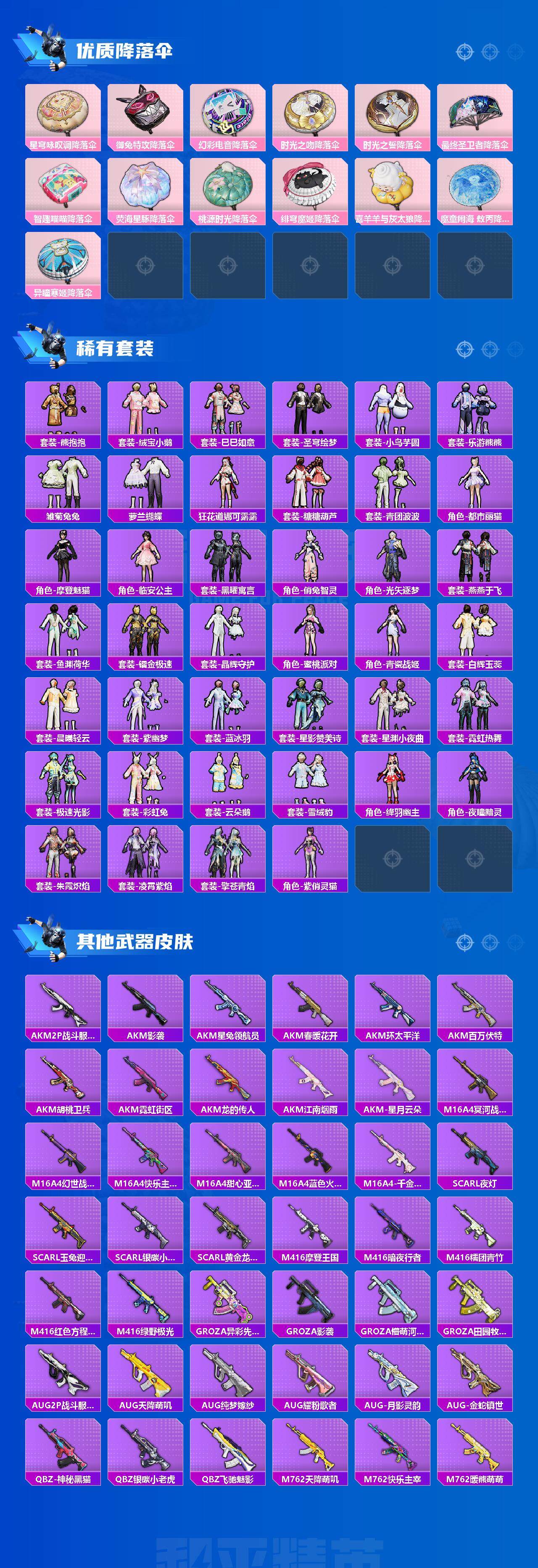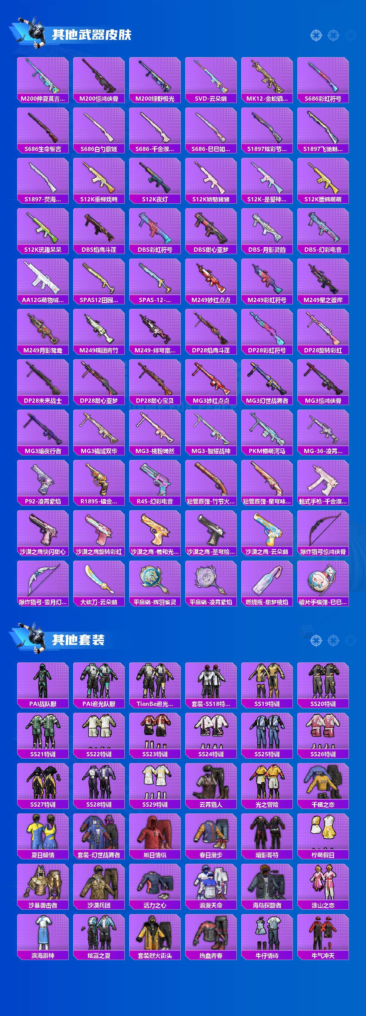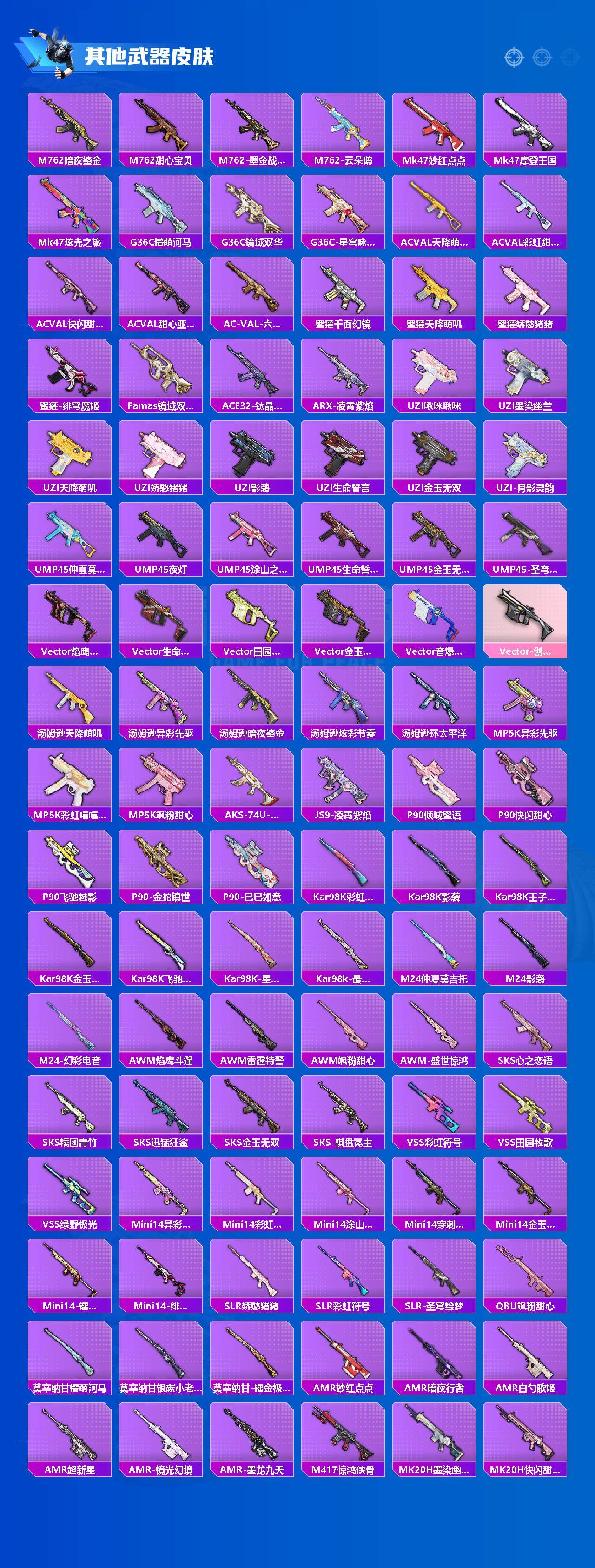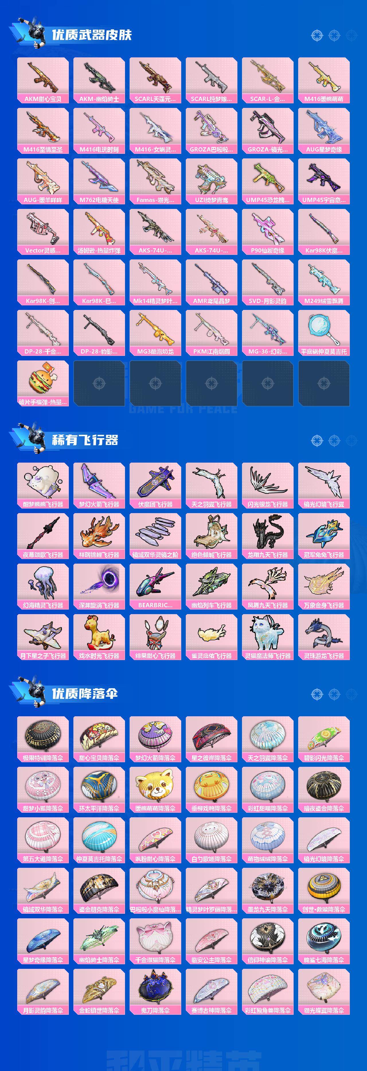 AKM-甜心宝贝,AKM-幽焰骑士,SCAR-L-天蓬元帅,SCAR-L-纯梦嫁纱,SCAR-L-金蛇镇世,M416-暖熊萌萌,M416-至情至圣,M416-电玩时刻,M416-女娲灵识,GROZA-巴啦啦小魔仙,GROZA-镜光银凌,AUG-星梦奇缘,AUG-暖羊咩咩,M762-电糖天使,UZI-绮梦青鸾,UMP45-恐龙拽拽,UMP45-宇宙意志,Vector-灵感创作师,AKS-74U-信仰神谕,P90-仙履奇缘,Kar98K-伏魔团,Kar98K-创世·救赎,Kar98K-巳巳如意,Mk14-精灵梦叶罗丽,AMR-鸢尾晶梦,SVD-月影灵韵,M249-绒雪飘舞,DP-28-千金淑猫,MG3-酷泡奶龙,PKM-江南烟雨,平底锅-仲夏莫吉托,破片手榴弹-热量炸弹