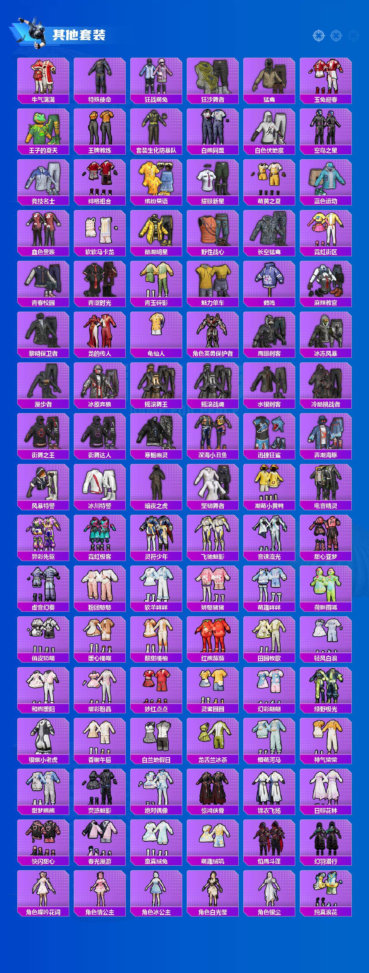套装-浪漫天命,套装-暗夜之虎,套装-龟仙人,套装-暗影哥特,角色-Mark.06,套装-PAI追光队服,套装-TianBa追光队服,套装-狂沙舞者,角色-英勇保护者,套装-漫步者,套装-水银刺客,套装-弄潮海豚