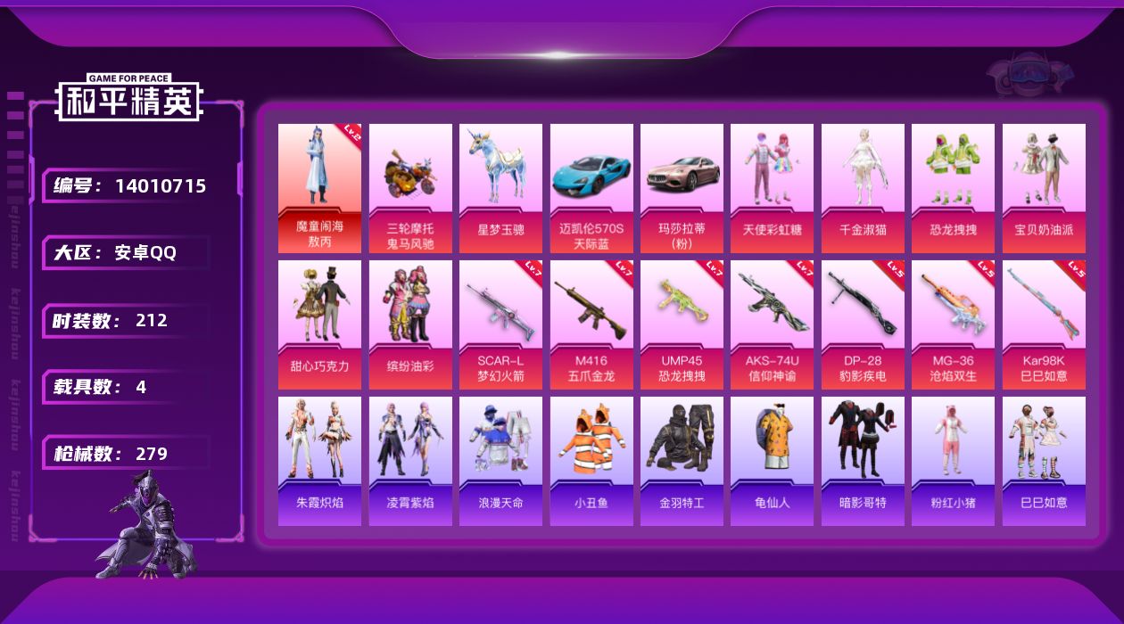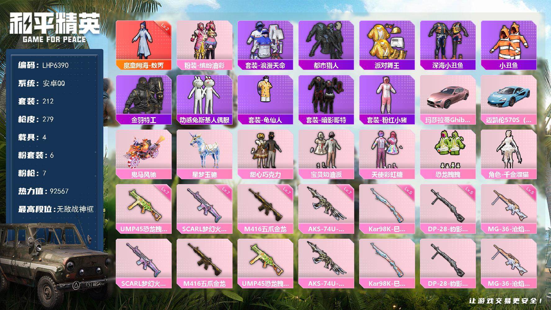 [14010715]可二次【店主推荐捡漏号!可直接换绑】/素材身法号/无敌战神框1/绝世印记3 安卓 手Q-无敌战神框-1神装-6粉装-7特效枪-4载具-4粉色飞行器-9.2w热力值-22王牌印记-212套装-279枪皮【红色神装等级】:魔童闹海-敖丙(二级)【热门品类】:粉装-缤纷油彩,套装-浪漫天命,套装-都市猎人,套装-派对舞王,套装-深海小丑鱼,套装-小丑鱼,套装-金羽特工,套装-动感兔斯基人偶服,套装-龟仙人,套装-暗影哥特,套装-粉红小猪【粉色载具】:玛莎拉蒂Ghibli(粉),迈凯伦570S(天际蓝),鬼马风驰,星梦玉骢【粉色套装】:粉装-甜心巧克力,粉装-宝贝奶油派,粉装-天使彩虹糖,粉装-缤纷油彩,粉装-恐龙拽拽,角色-千金淑猫【粉色枪皮等级】:SCAR-L-梦幻火箭(七级),M416-五爪金龙(七级),UMP45-恐龙拽拽(七级),AKS-74U-信仰神谕(七级),Kar98K-巳巳如意(五级),DP-28-豹影疾电(五级),MG-36-沧焰双生(五级)【粉色飞行器】:璀璨巨星飞行器,星空武士飞行器,深渊漩涡飞行器,幽焰列车飞行器