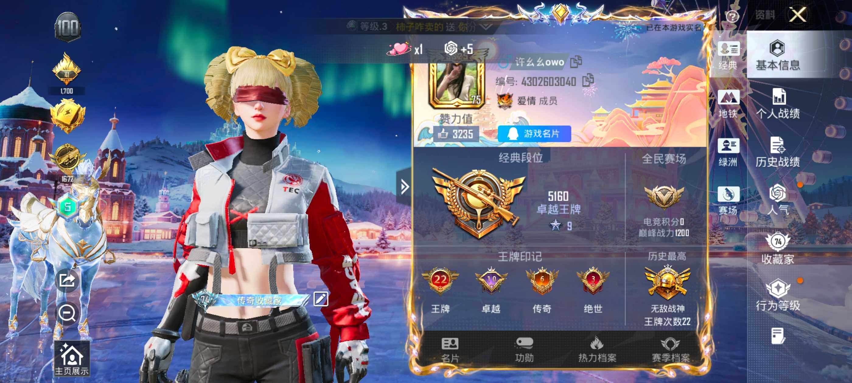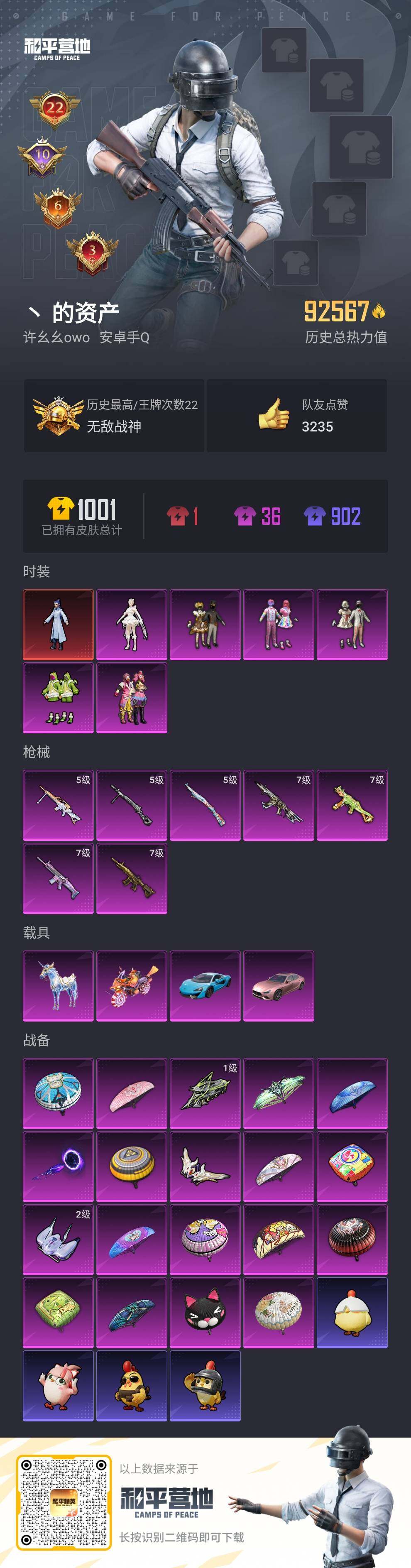 - [5966416]实名: 可修改 时装数: 75 载具数: 1 枪械数: 34 战备数: 37 神级装扮: 墨龙九天-敖渊 热门装扮: 时空协奏·心弦,女娲灵识 载具: 护世瑞兽 稀有枪皮: P90沙丘之主,M24镜域双华,Kar98K-巳巳如意,SCAR-L金蛇镇世