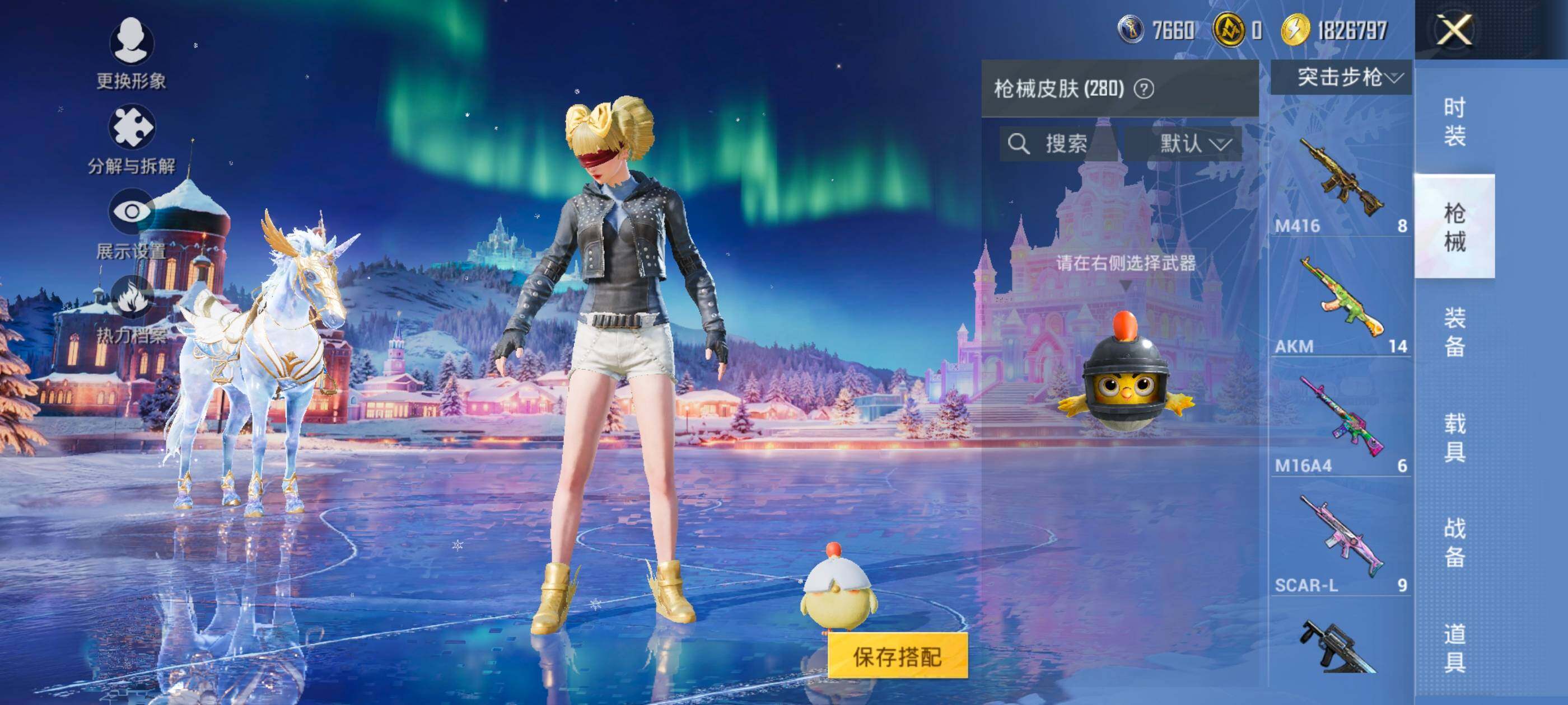 SCAR-L-梦幻火箭,M416-五爪金龙,UMP45-恐龙拽拽,AKS-74U-信仰神谕,Kar98K-巳巳如意